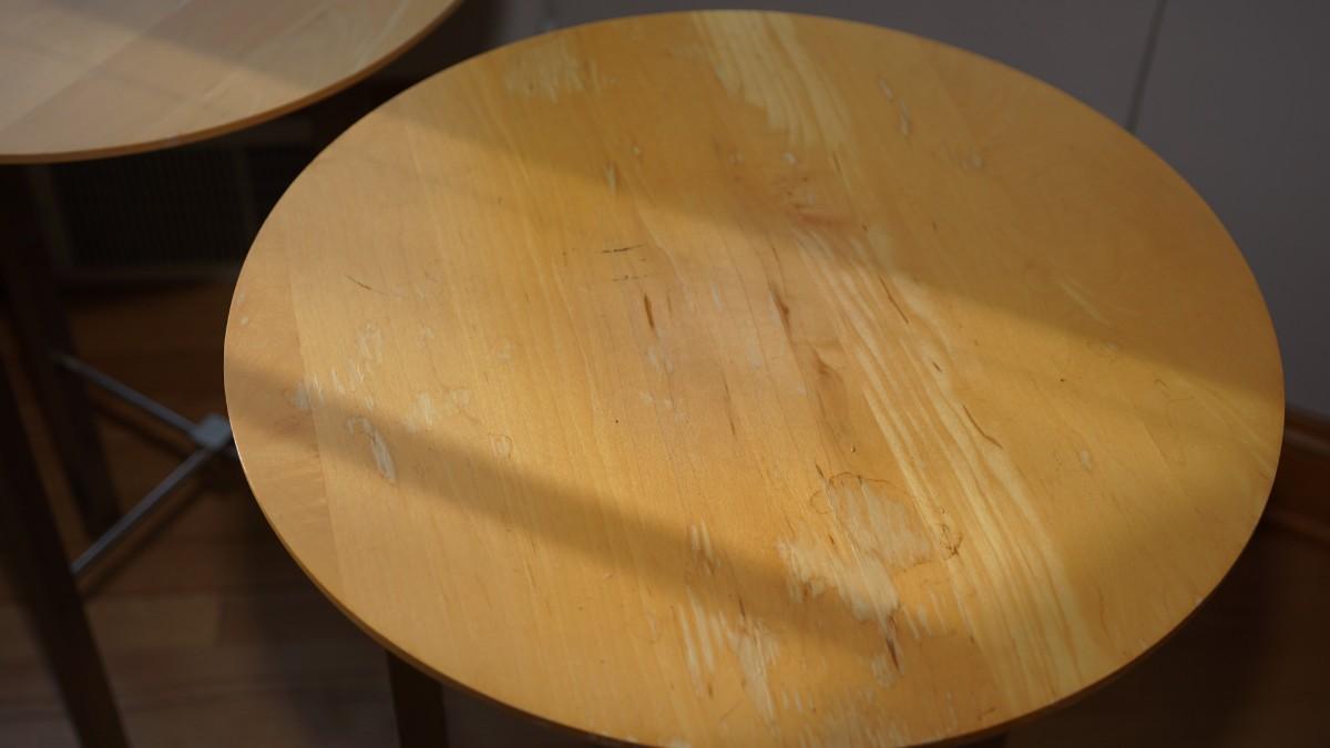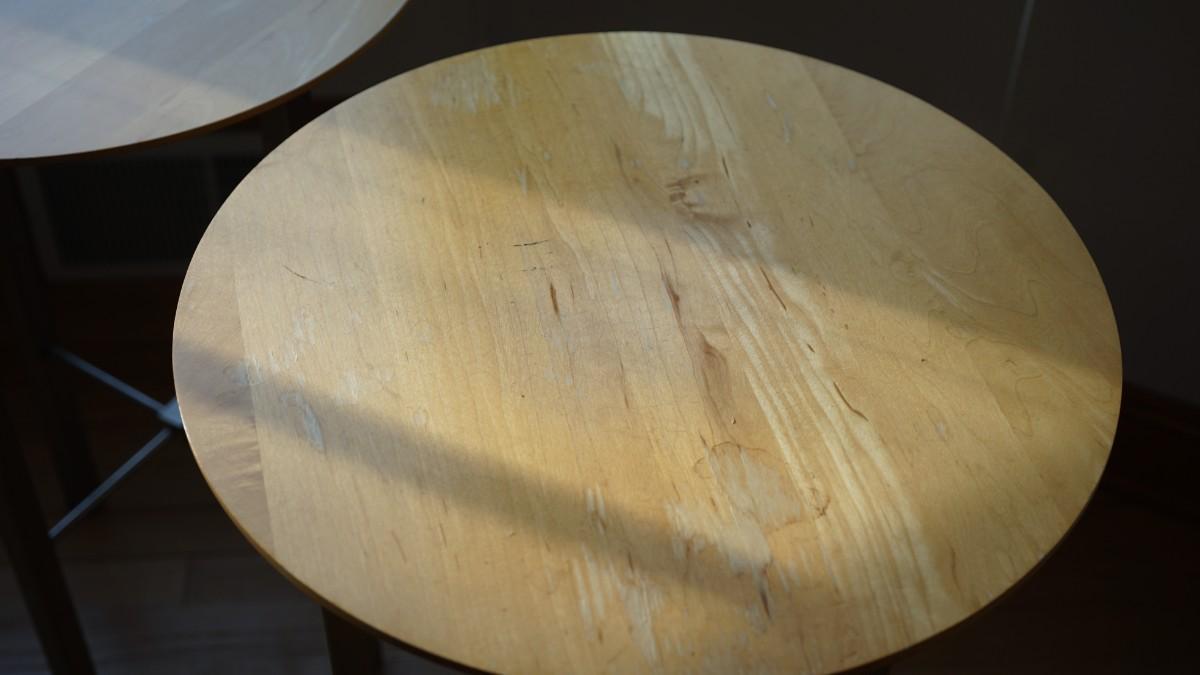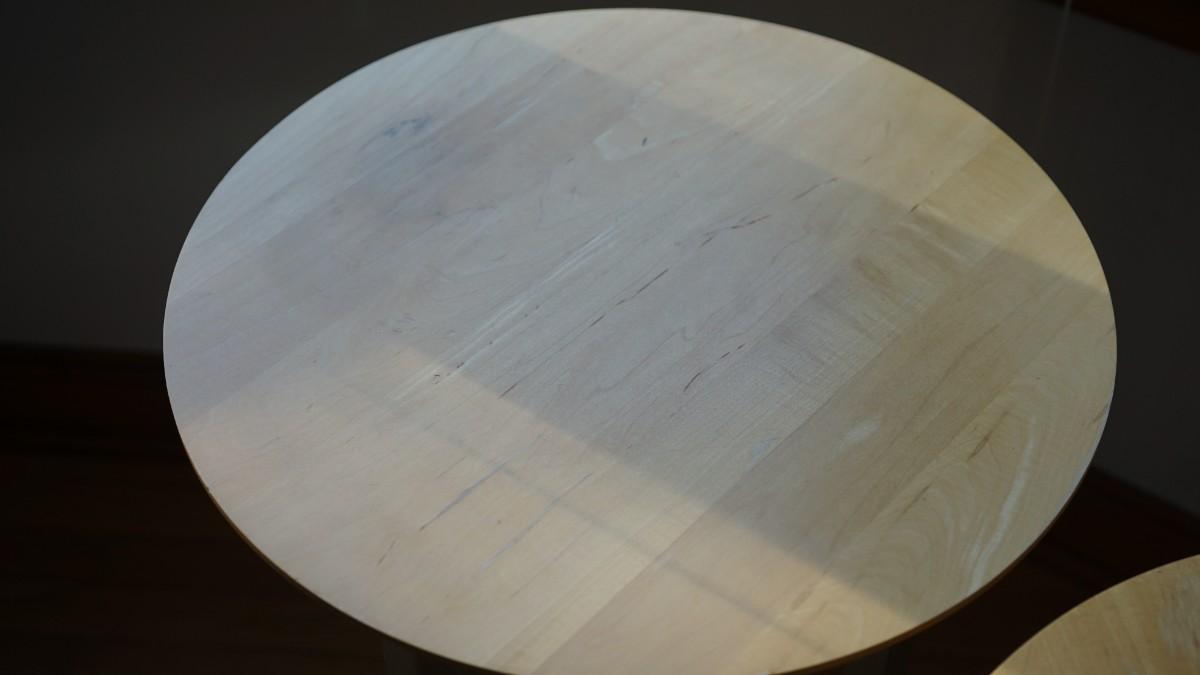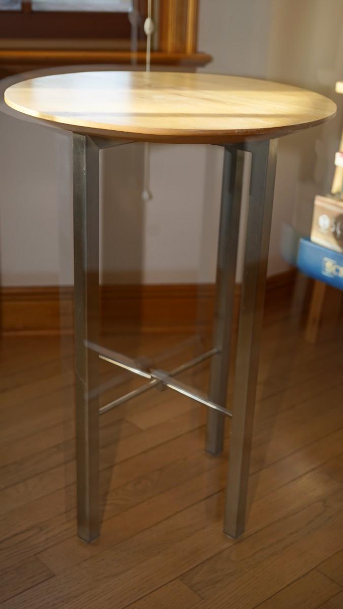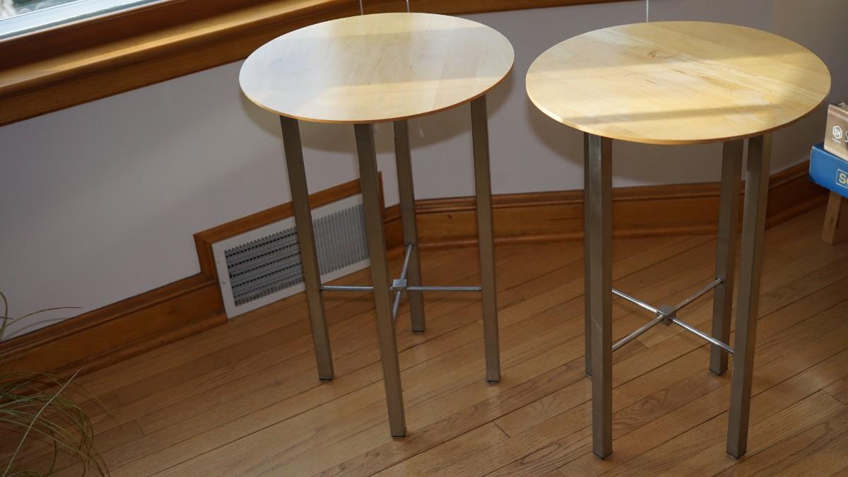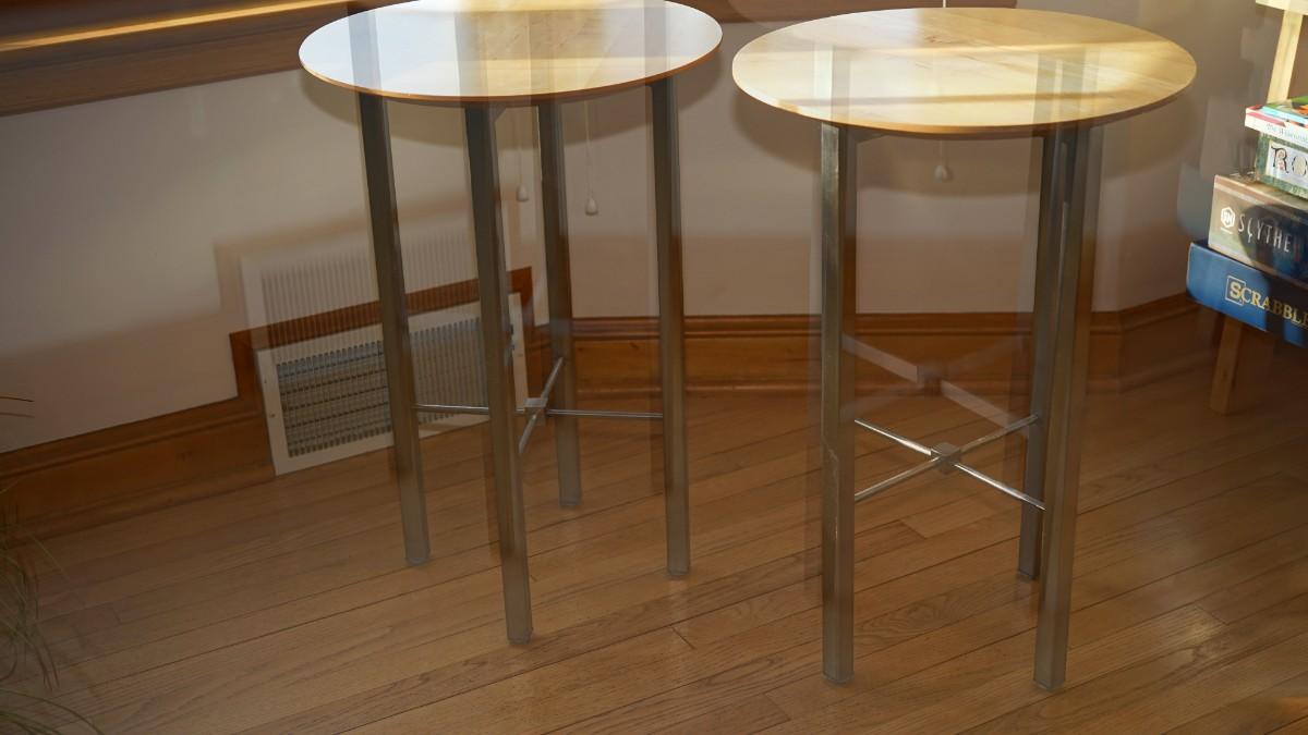 PAIR OF CHROME FRAMED BASE TABLES W/ ROUND MAPLE TOPS