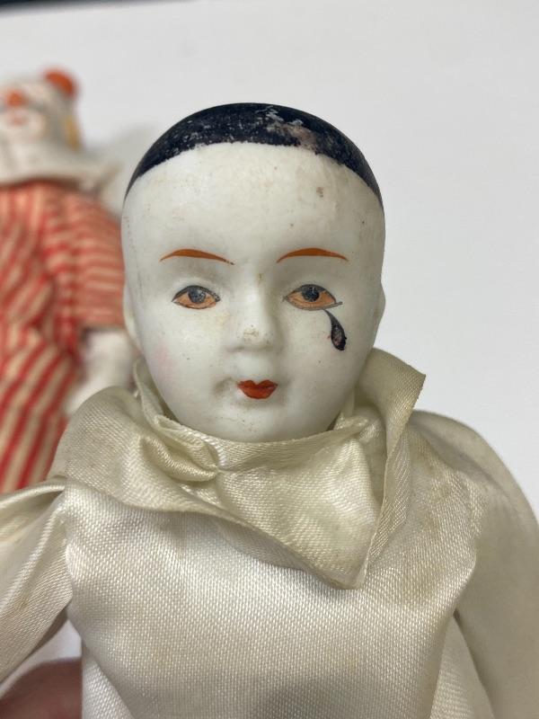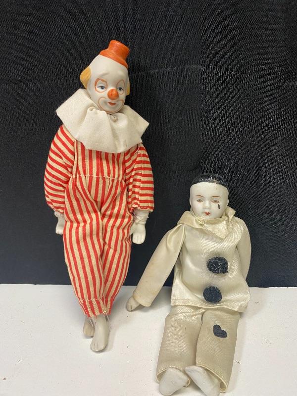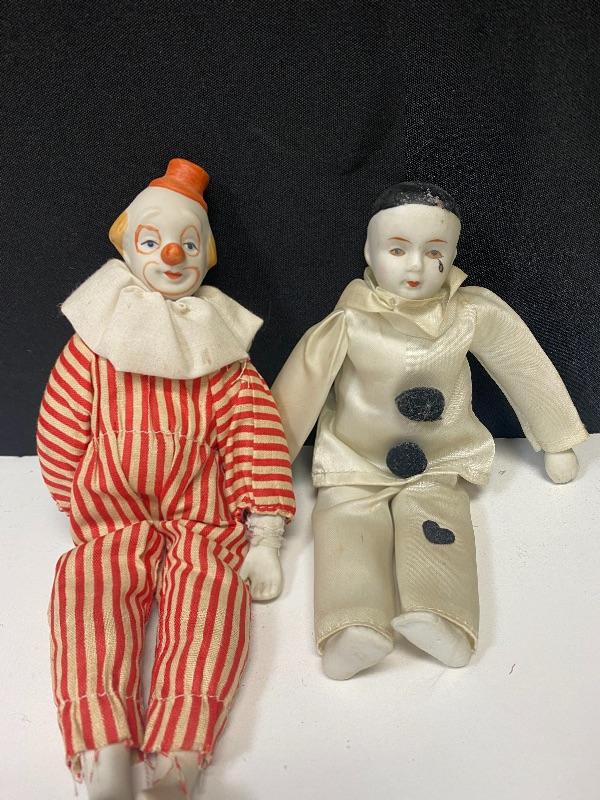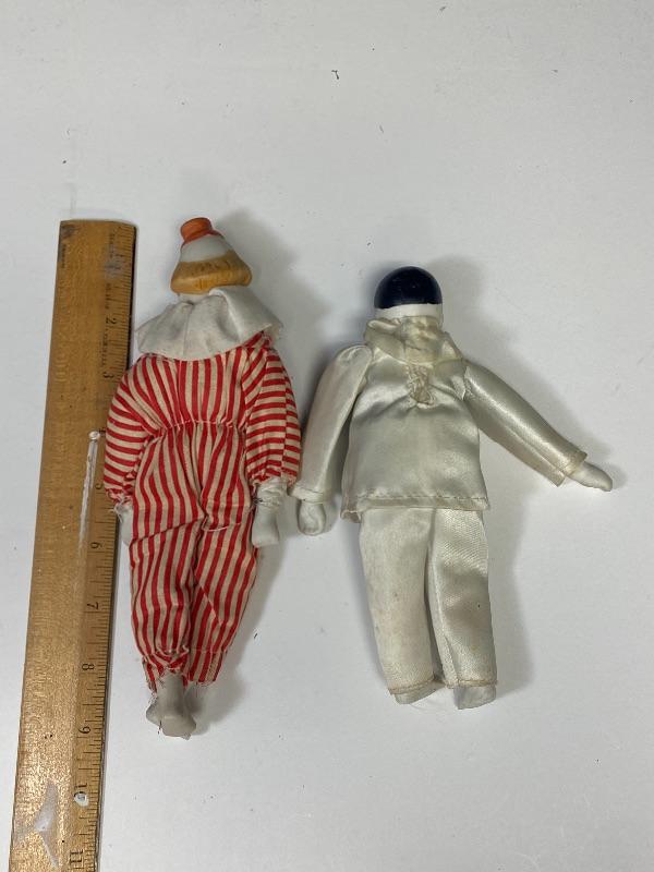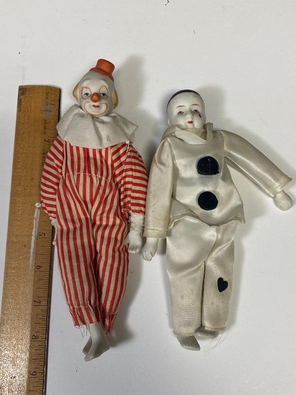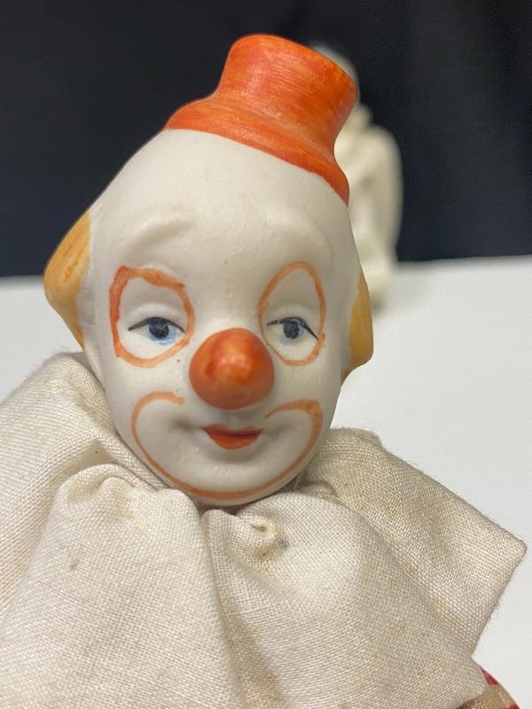 Pair of classic style clown figurine dolls. Cloth body with porcelain head, hands, and feet. The one in red will stand when leaned against something, the other will not. Both have discolor and signs of age. The black & white clown has some wear to paint on face. Under 9" size.