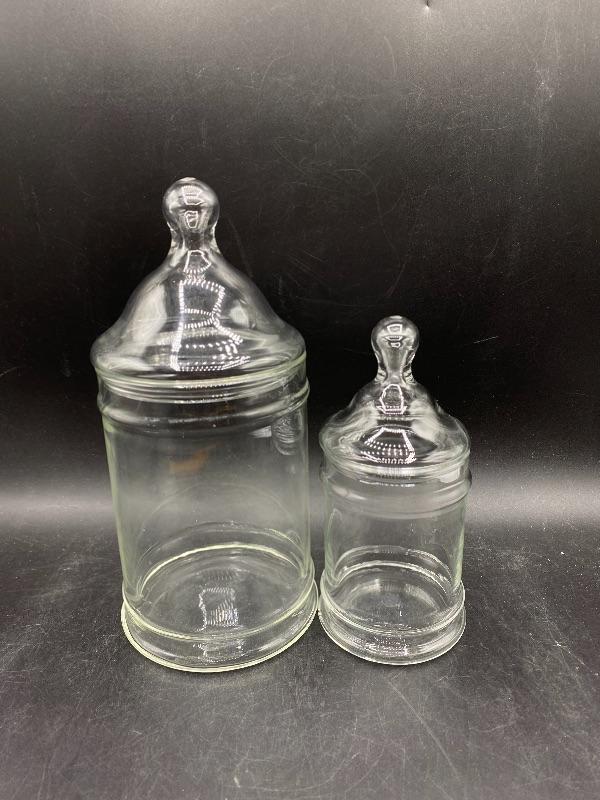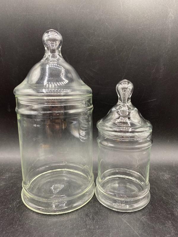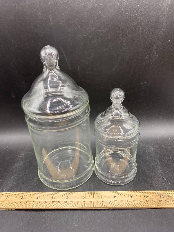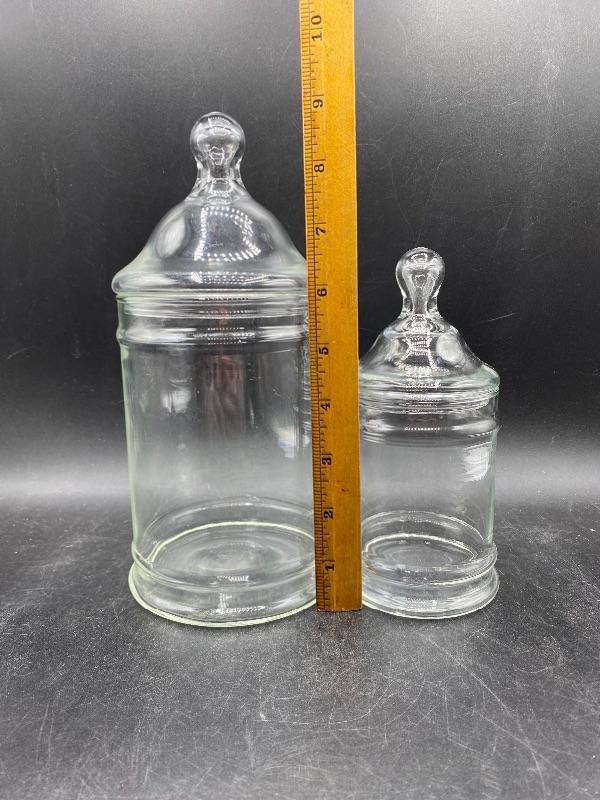 Pair of glass apothecary style jars. Different sizes. The taller is about 9" with lid, the smaller about 7".