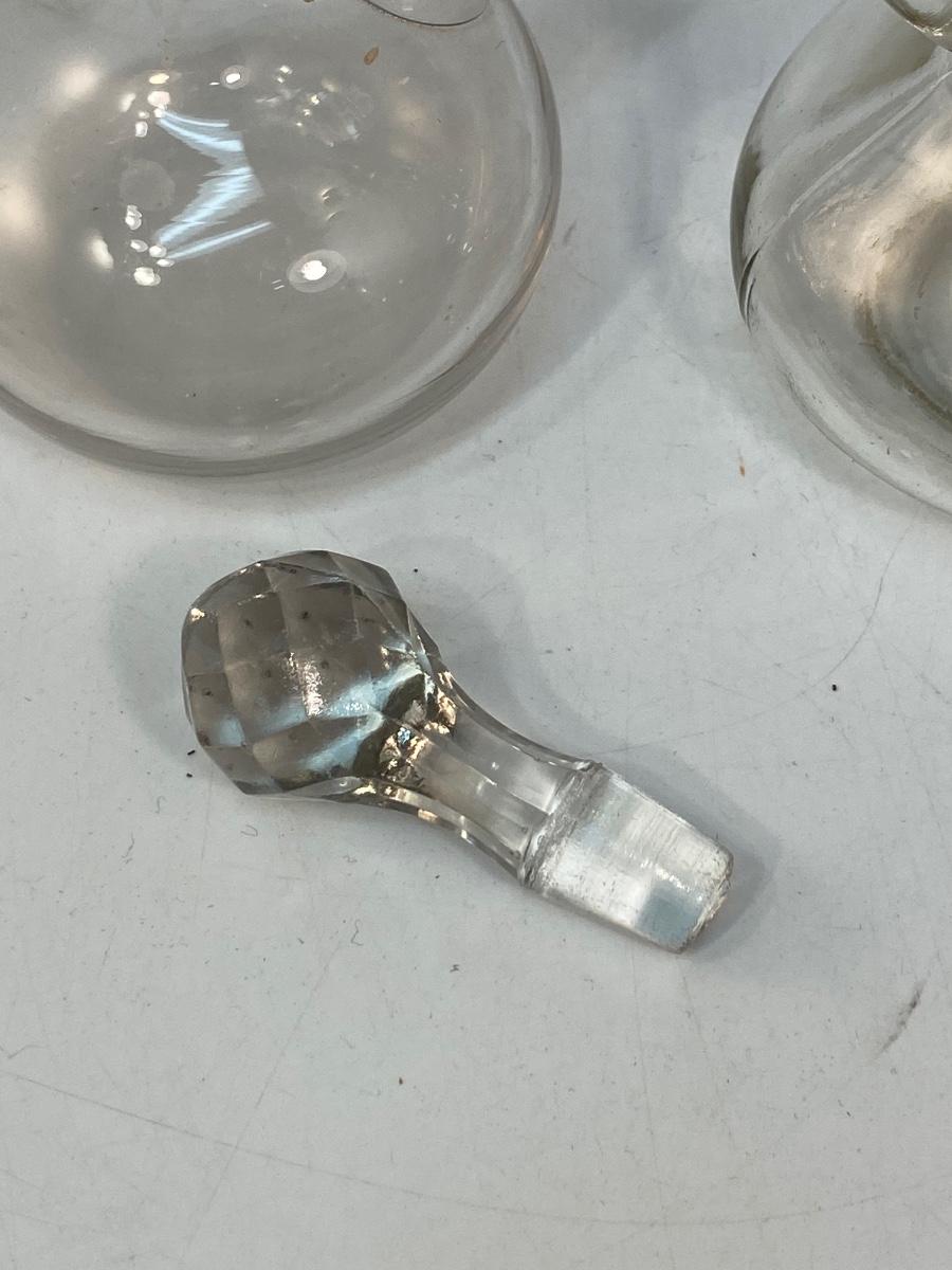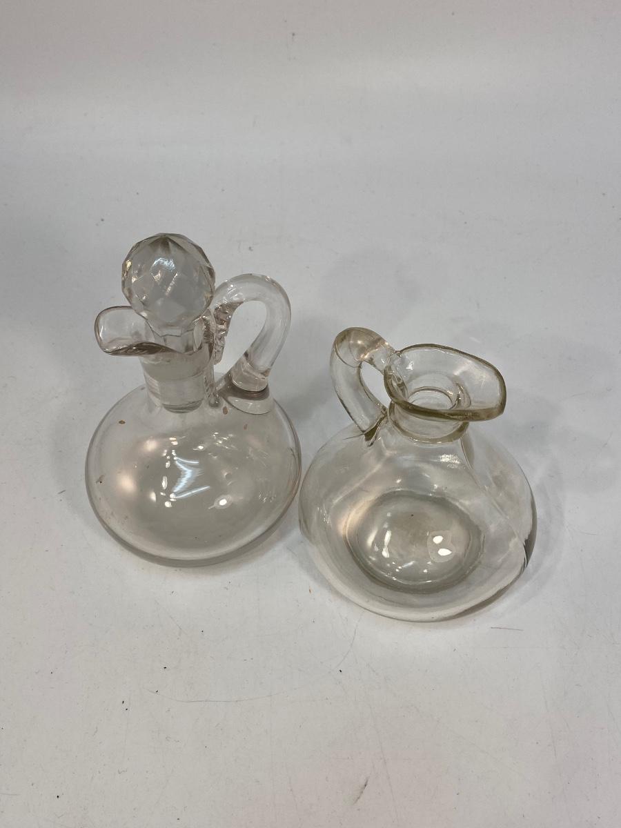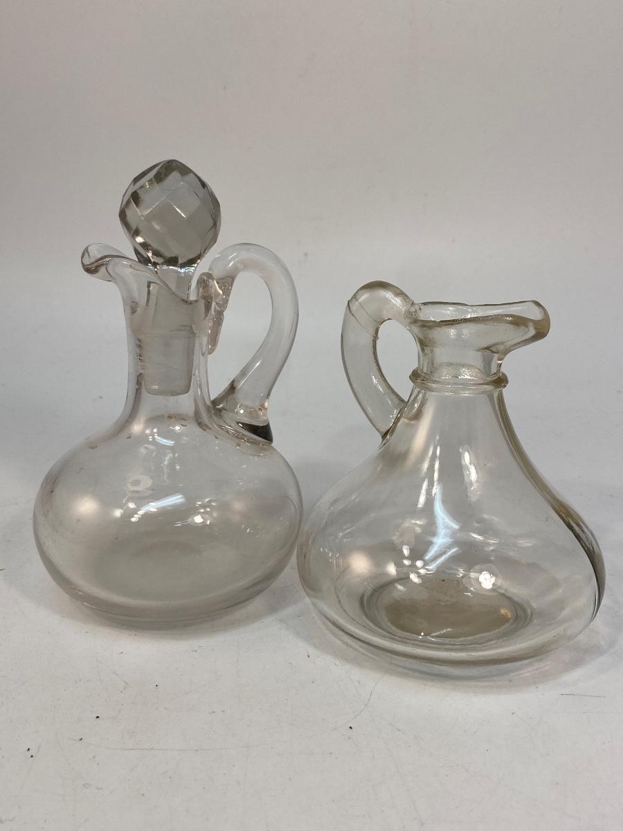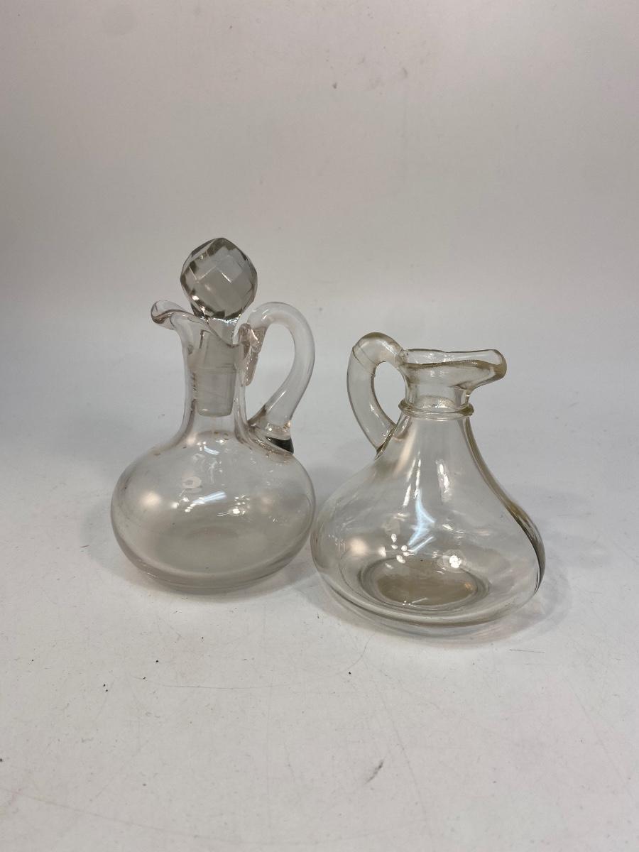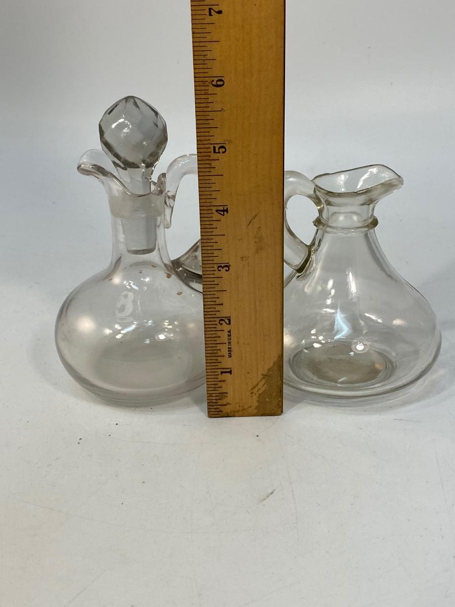 Pair of Clear Glass Cruet Oil Vinegar Dressing Bottles. Both are in good vintage condition. One has a crystal stopper. Great for kitchen use, decor, or bud vases.