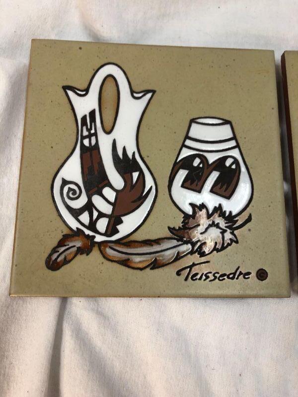 Pair of Cleo Teissedre Southwestern decorative art tile trivets. Cork back. 6" size. Good condition, no chips.