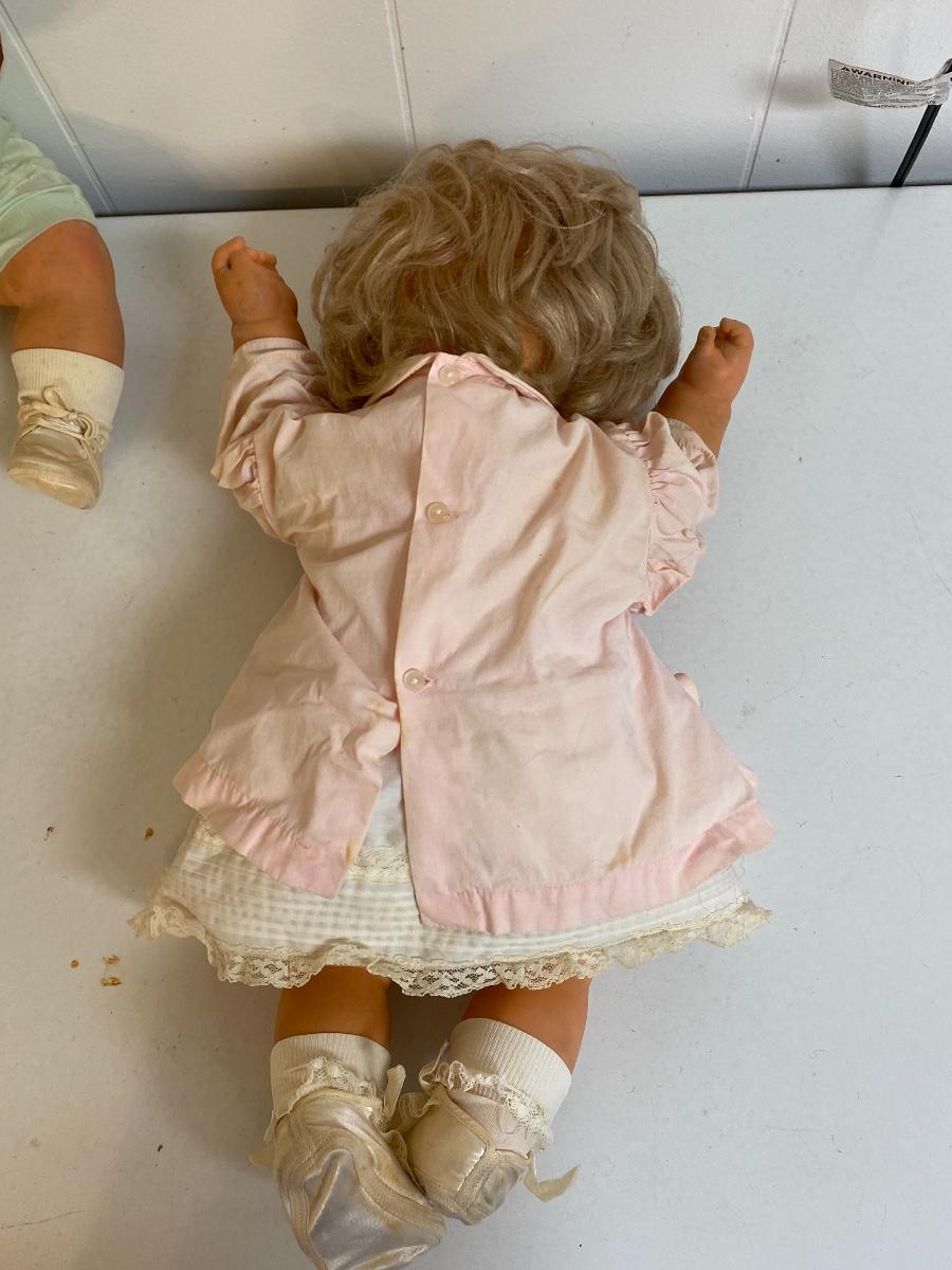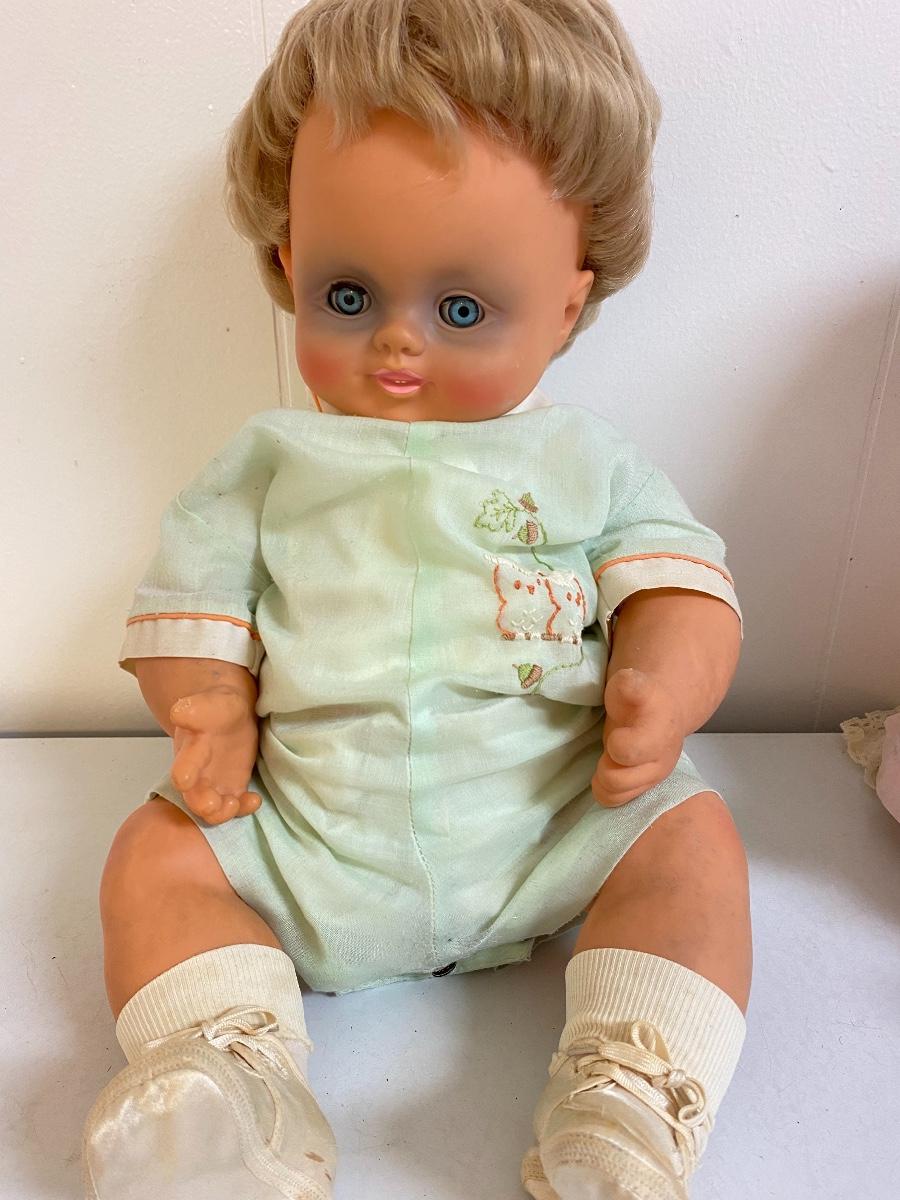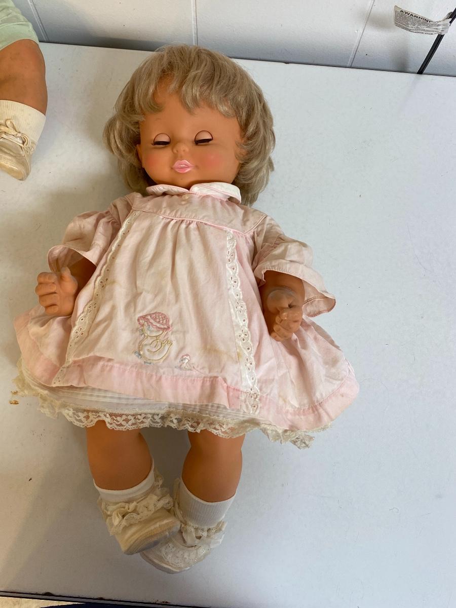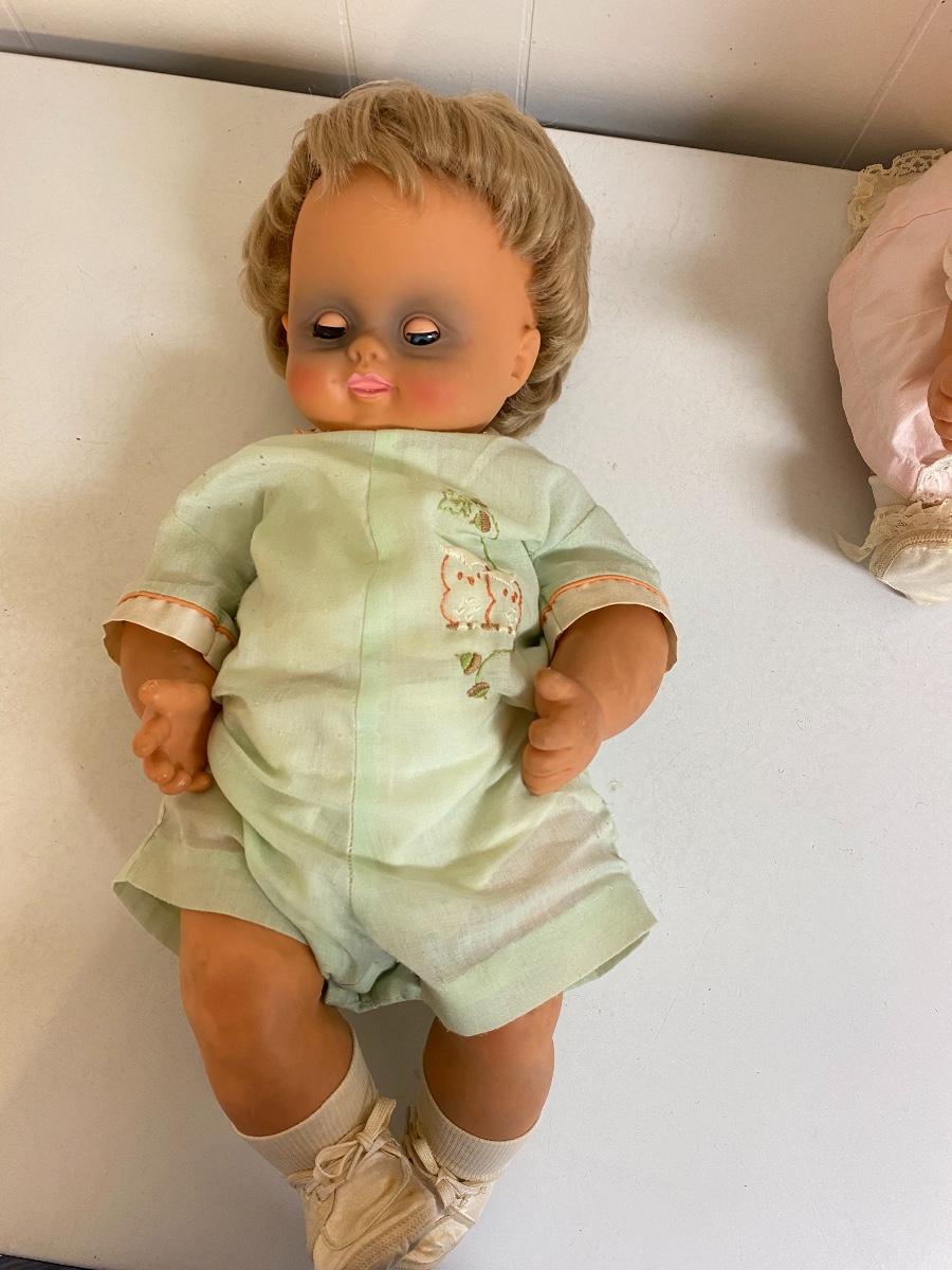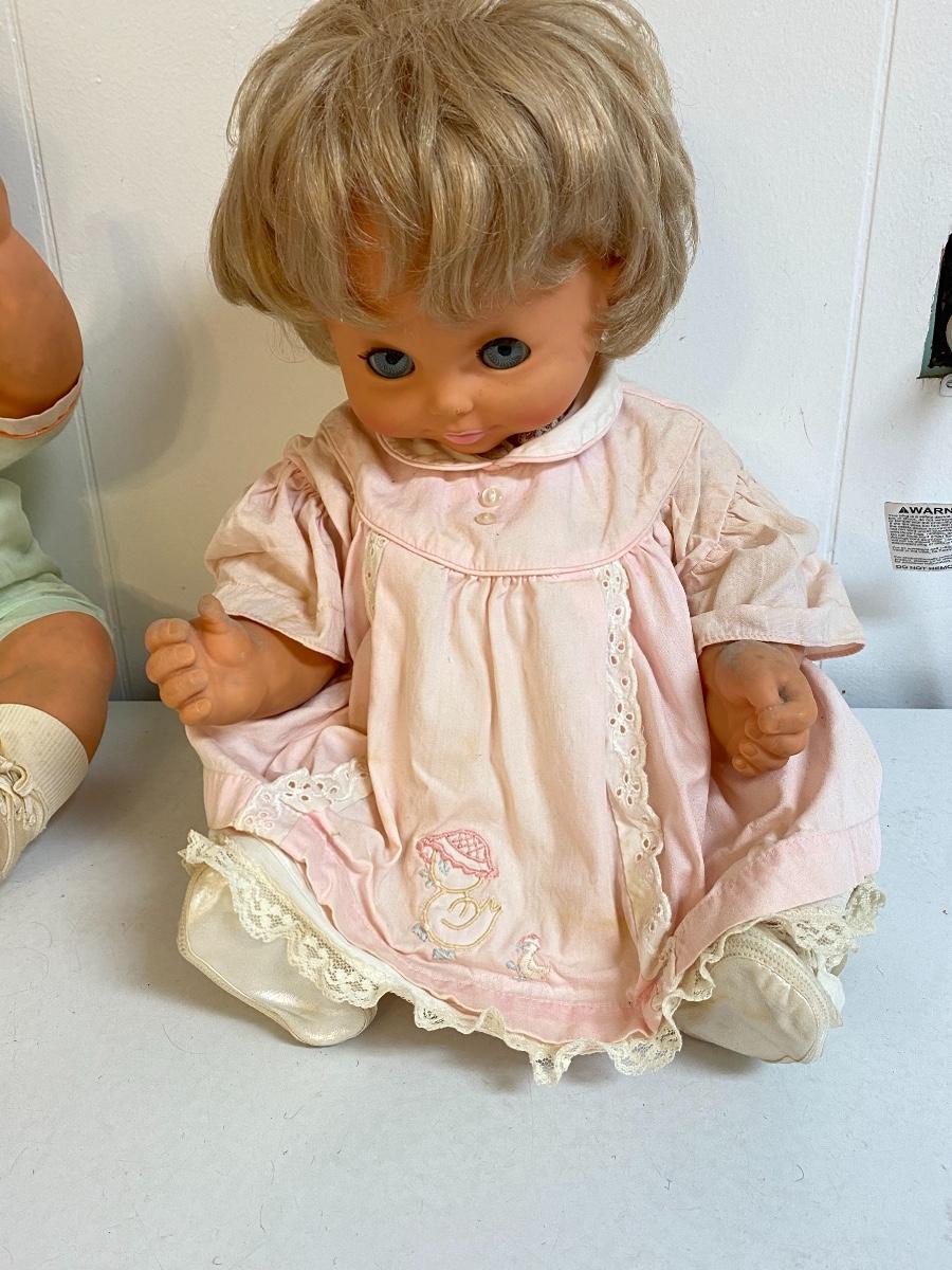 , jointed arms and legs 20”. Sleepy eyes with eyelashes, boy is missing eyelashes on left eye. Includes outfits, shoes, booties, and diapers. In good vintage condition.