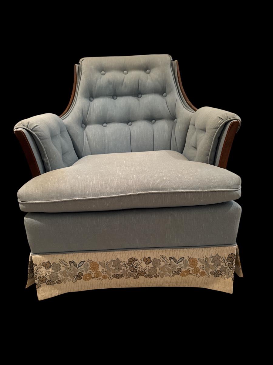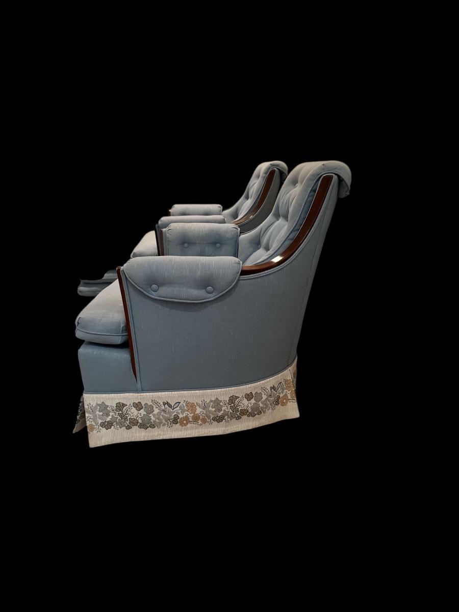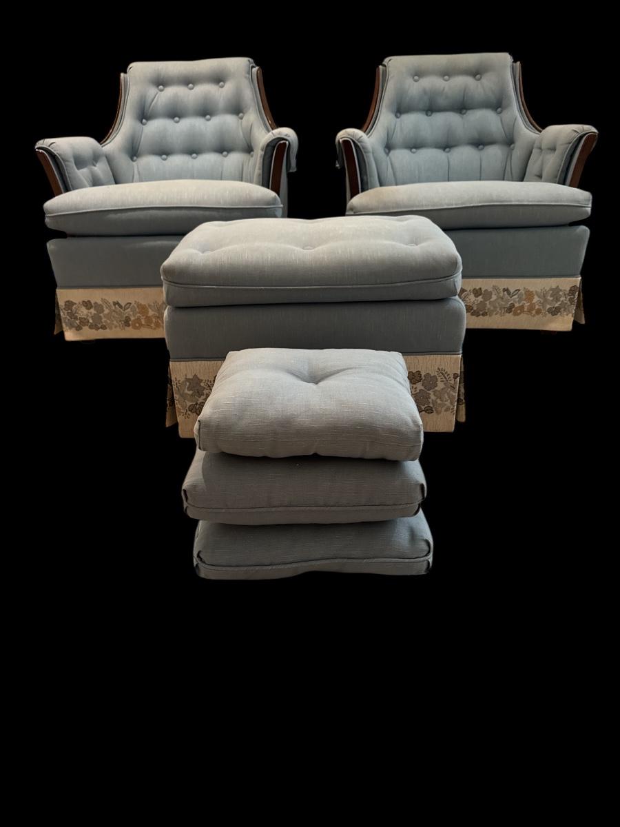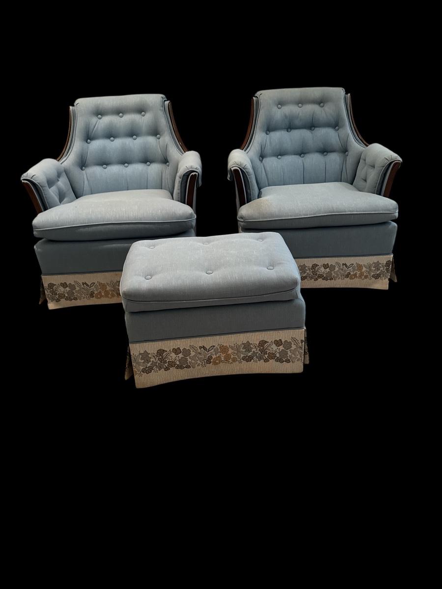 Elegant pair of vintage tufted club chairs upholstered in soft blue fabric with subtle texture. Each chair features curved wood trim, rolled arms, and a floral skirt accent in coordinating cream and earth tones. Set includes a matching ottoman and three additional loose cushions for added comfort or décor flexibility.