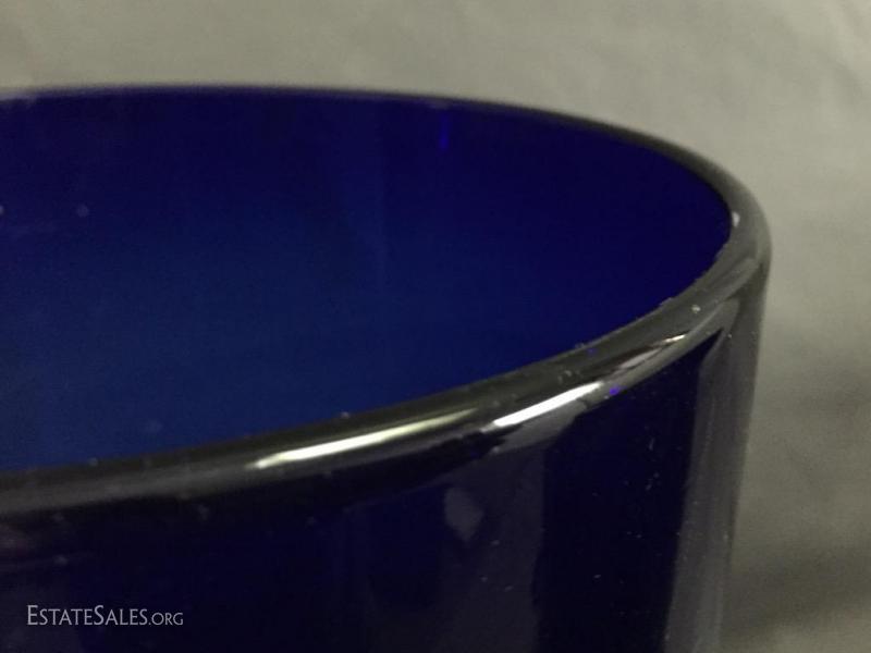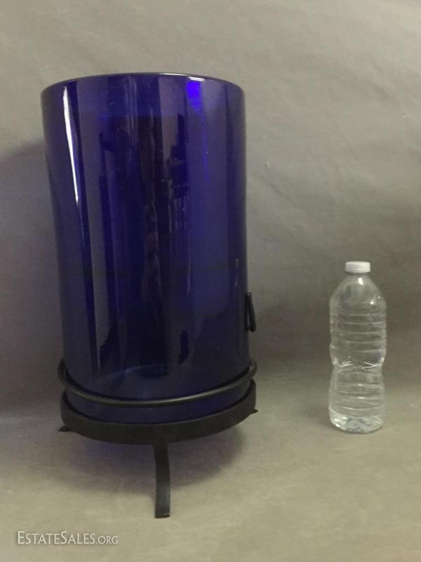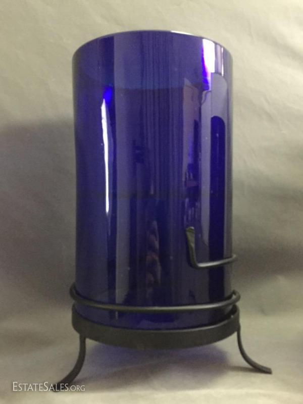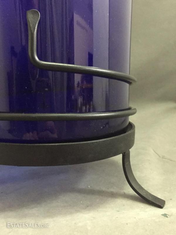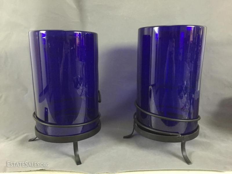 Pair of Cobalt Blue Art Glass candle holder / vases on wrought iron stands, 15" tall (with stand)