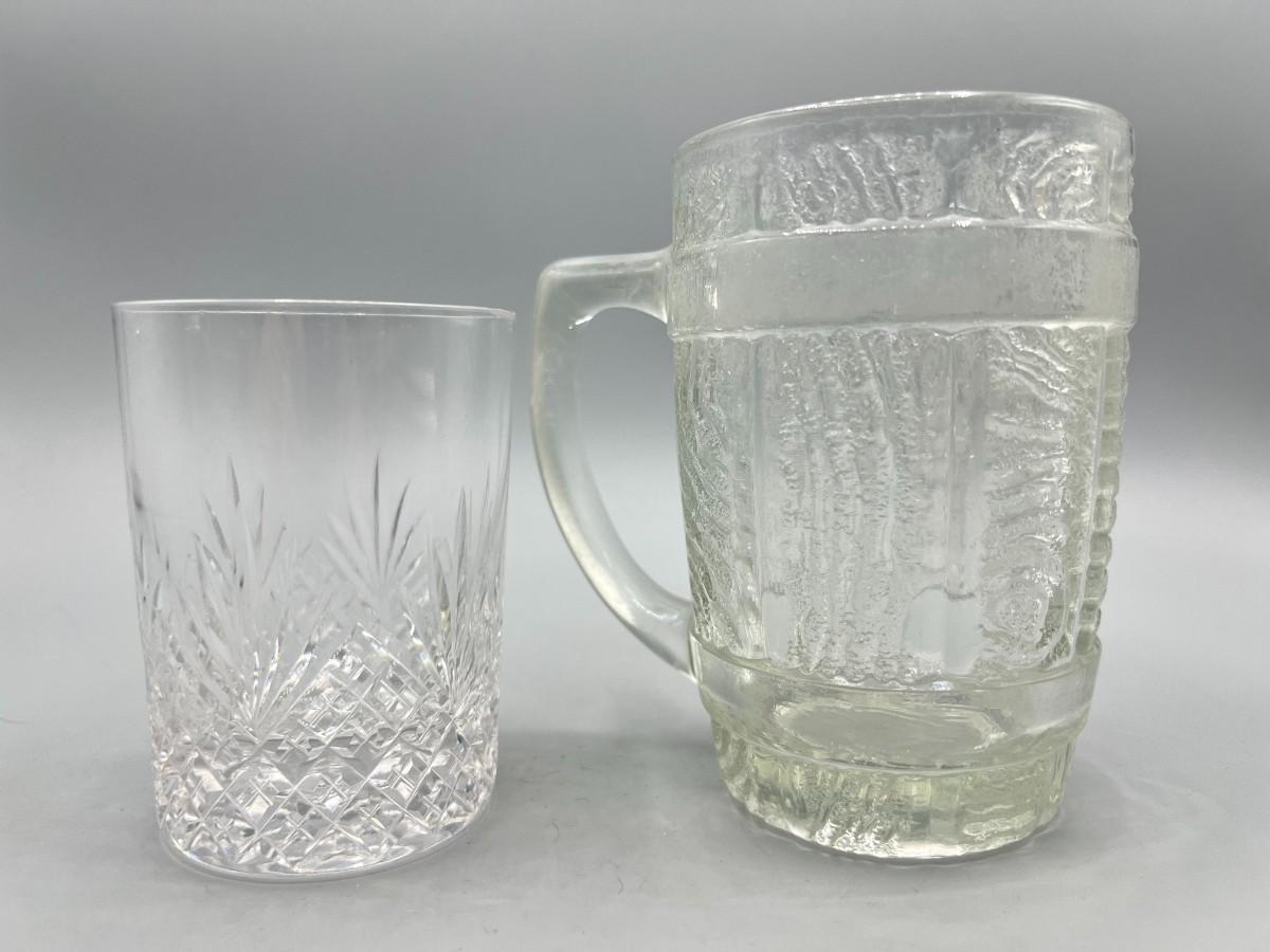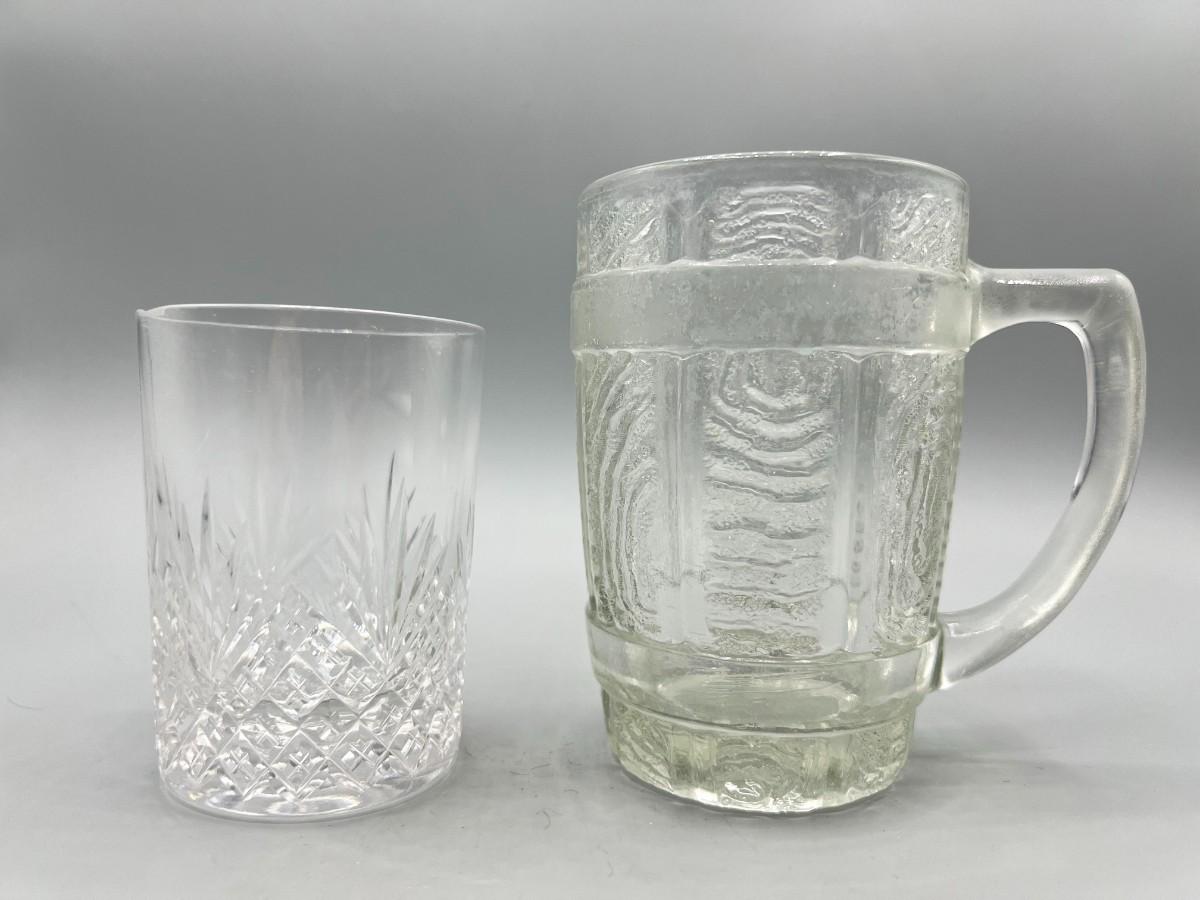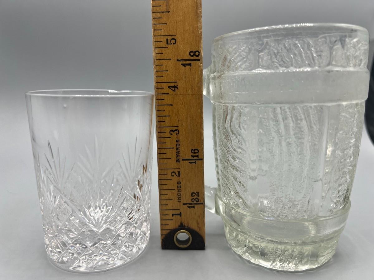 Pair of Collectible Mismatch Drink Glasses. Small cut crystal glass and an embossed barrel pattern handled mug. 5" and smaller.