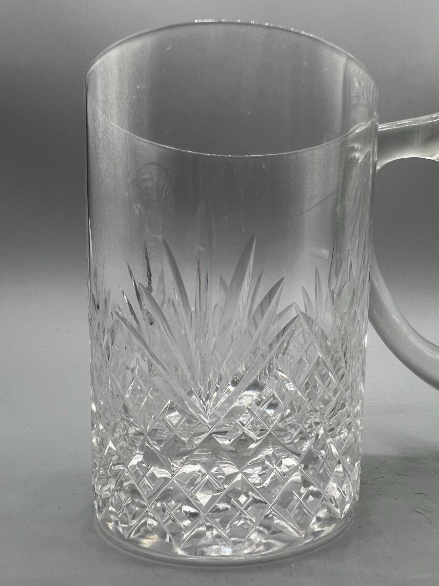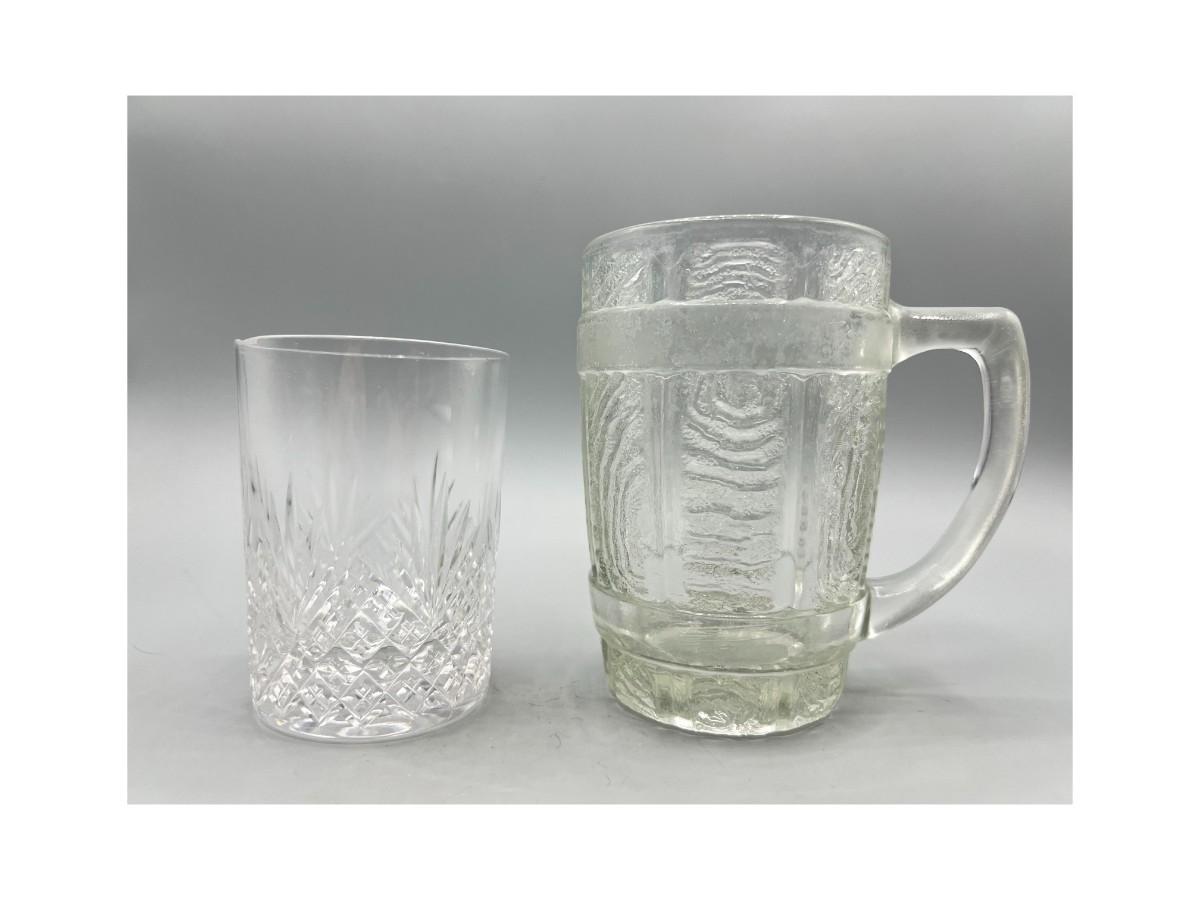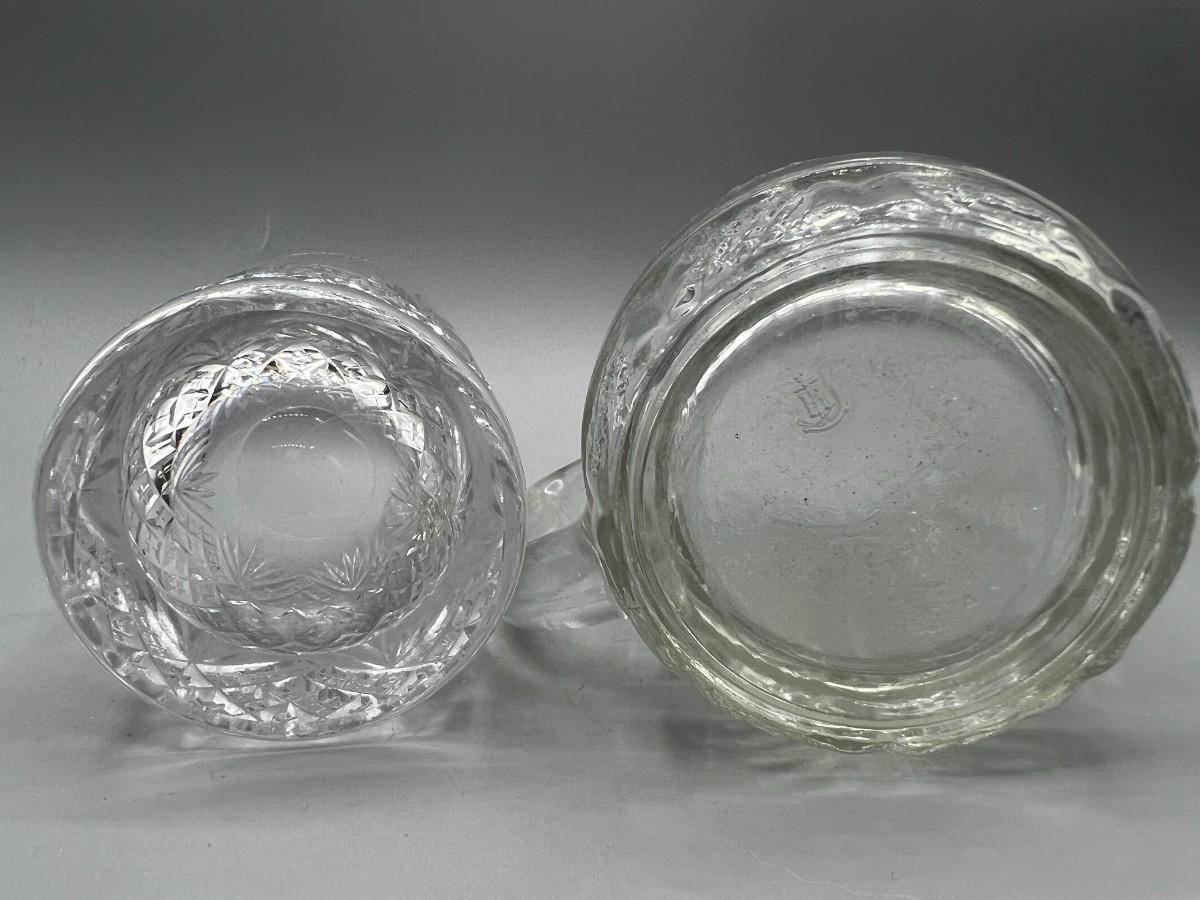 Pair of Collectible Mismatch Drink Glasses. Small cut crystal glass and an embossed barrel pattern handled mug. 5" and smaller.