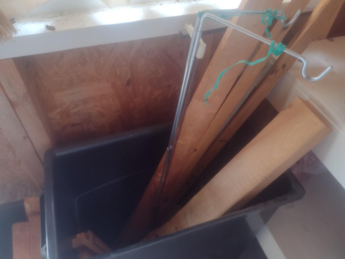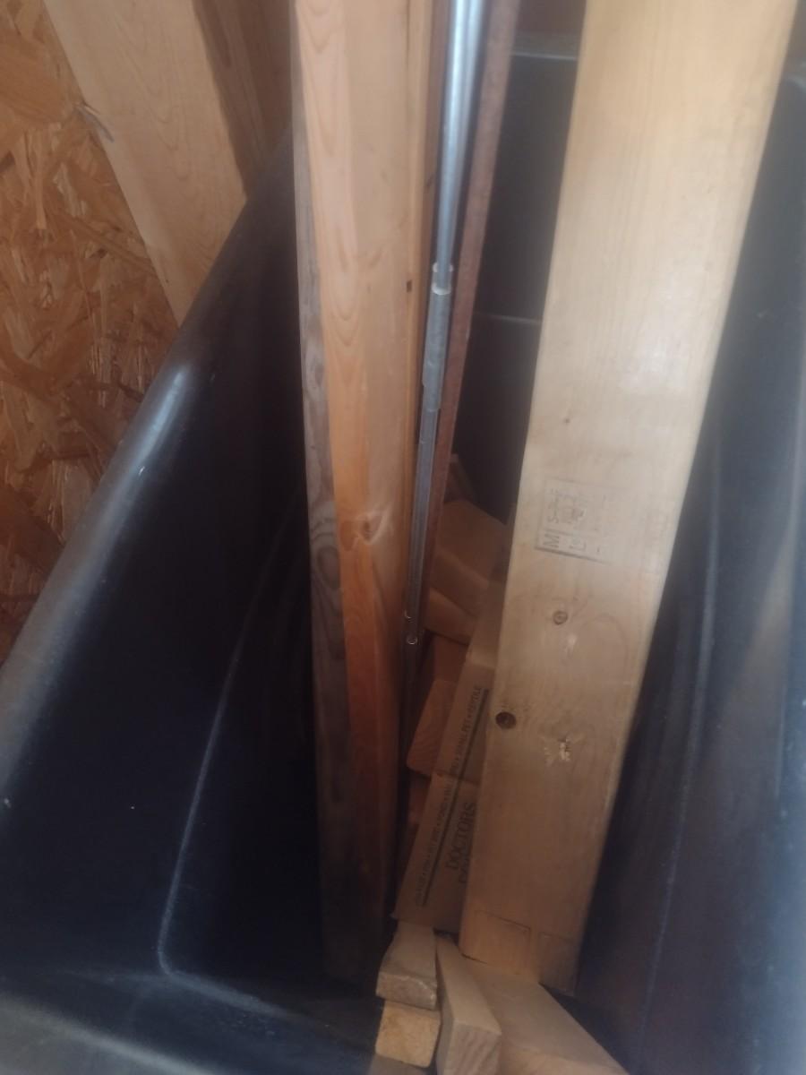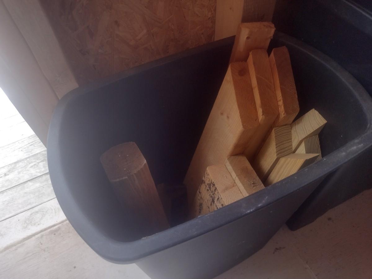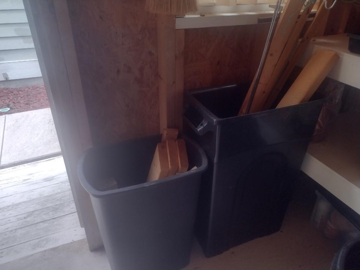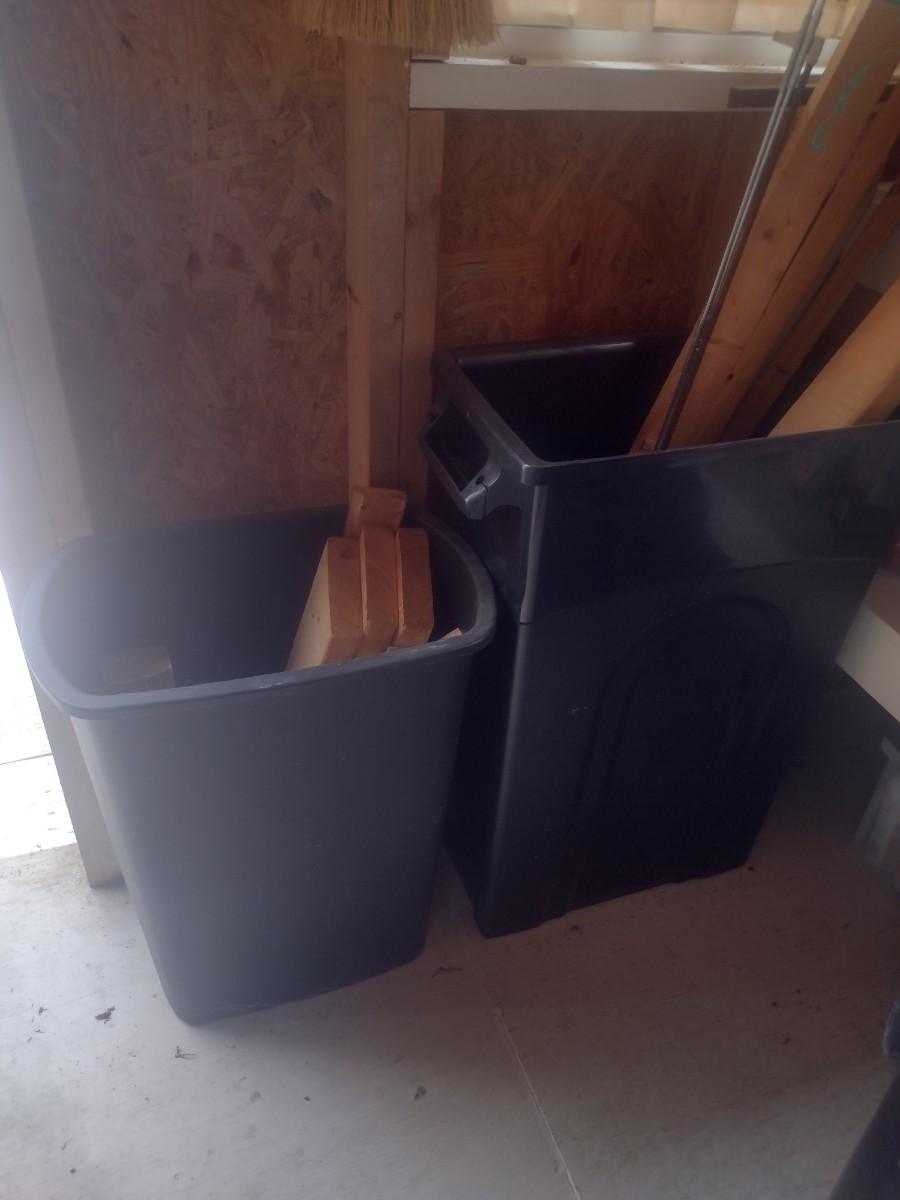 Pair of Composite Trash Receptacles and Wood Remnants
