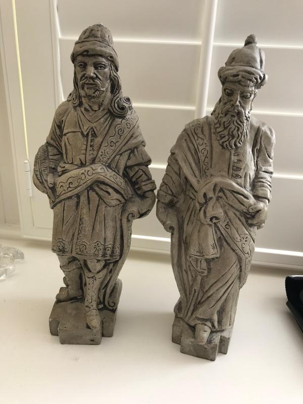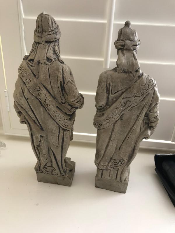 Pair of glazed concrete 12" H figurines of ancient scholars. One appears to be Chinese and the other Middle Eastern/Latin.