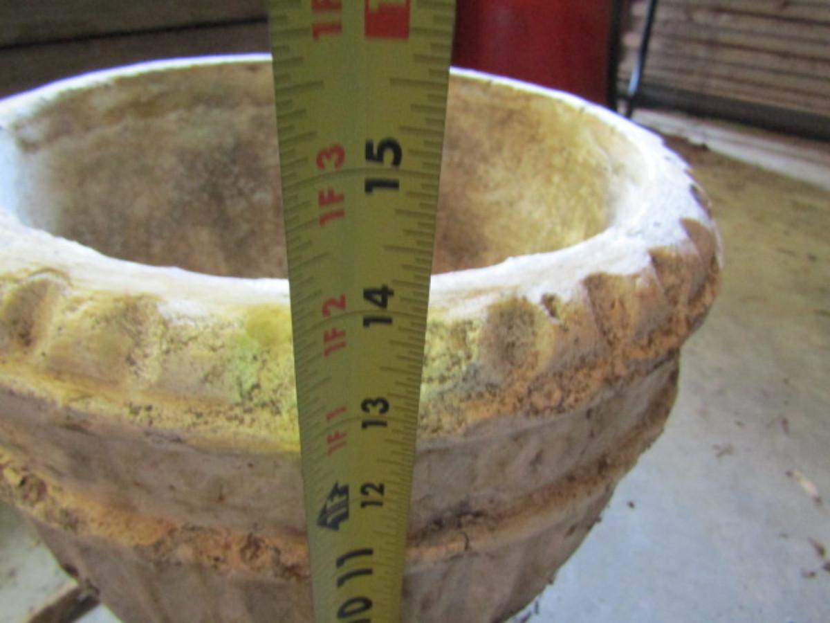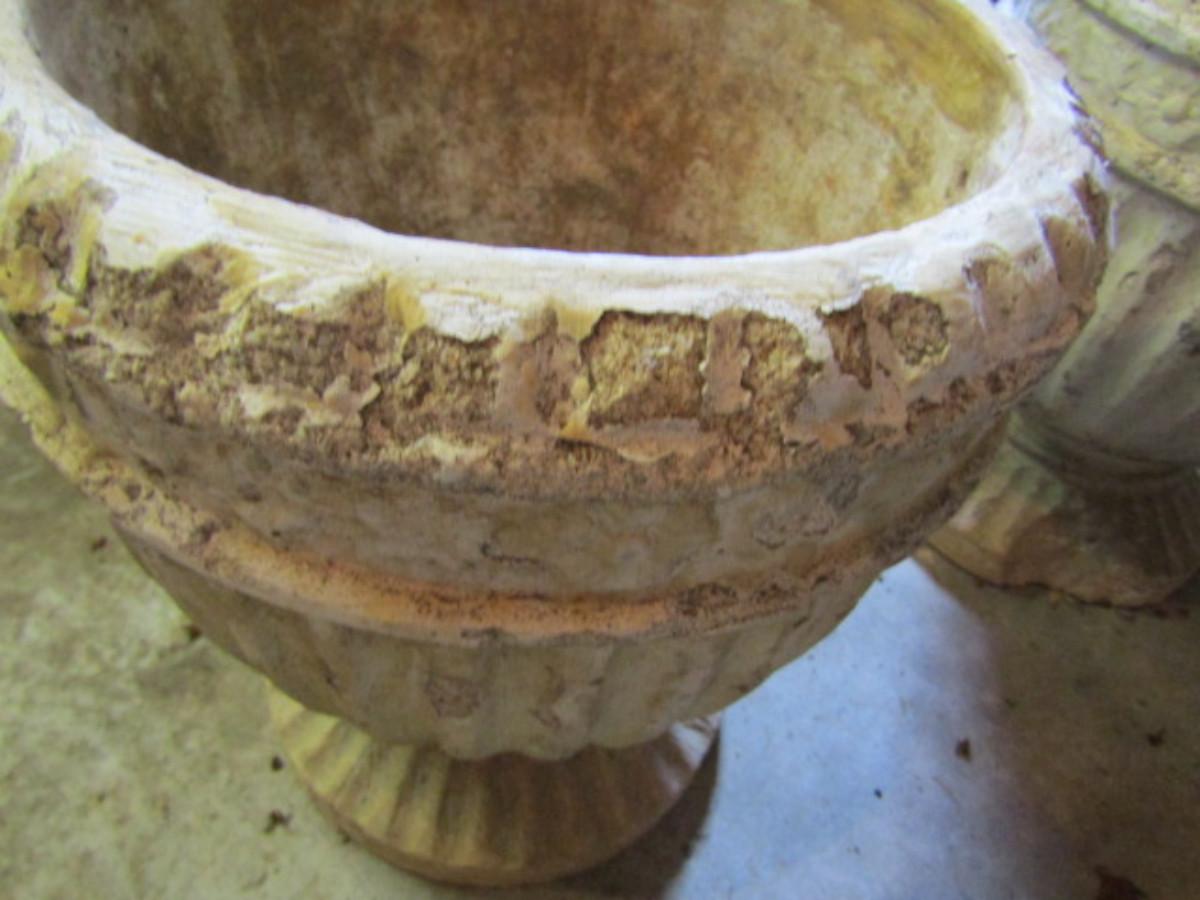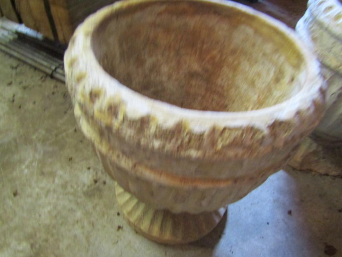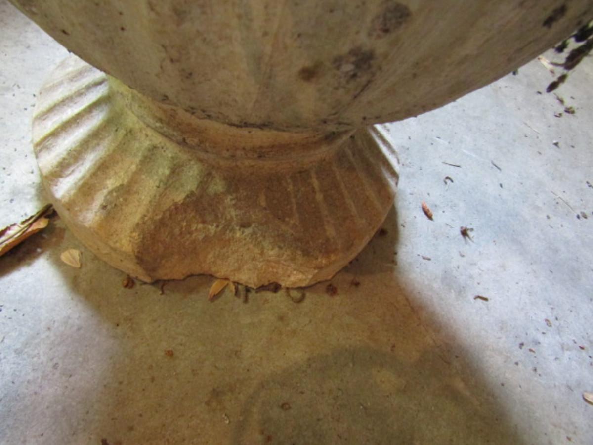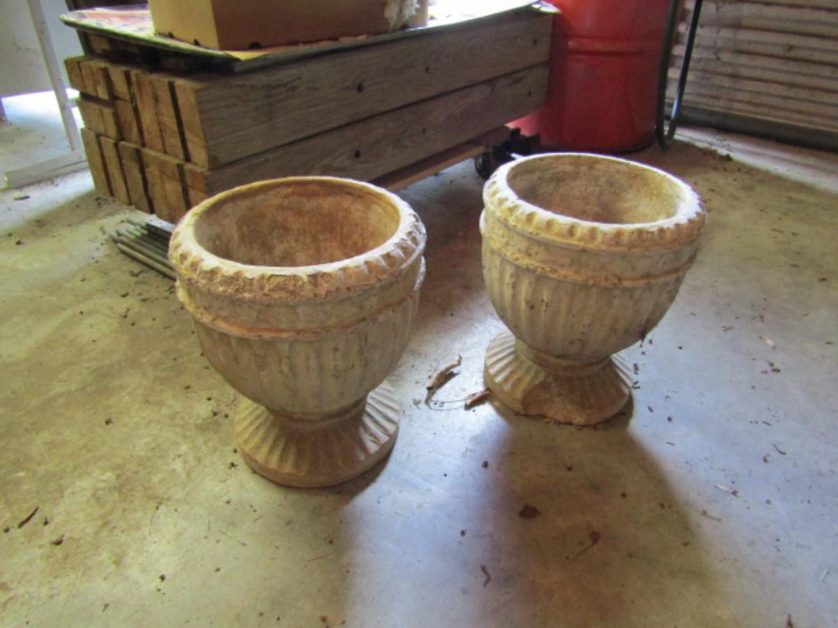 Pair of Concrete Urn Planters. Please see all pictures- one is damaged on base. Also, some pitting on edges.
