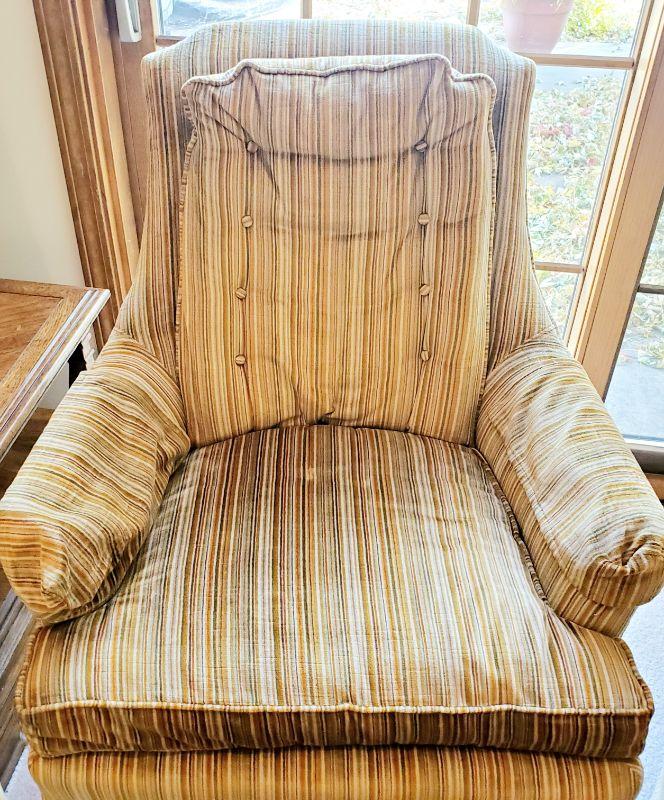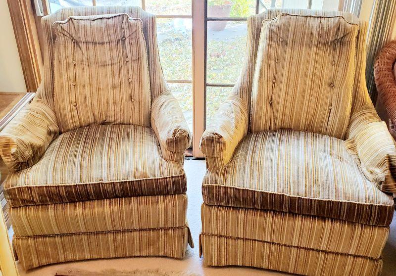 Chairs are in good condition (no rips or stains). Such a funky pair of chairs that swivel! Approx measurements 28 x 27 x 35.5