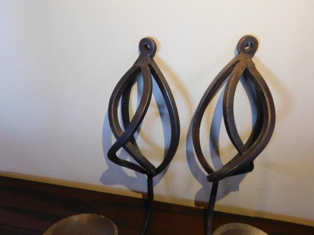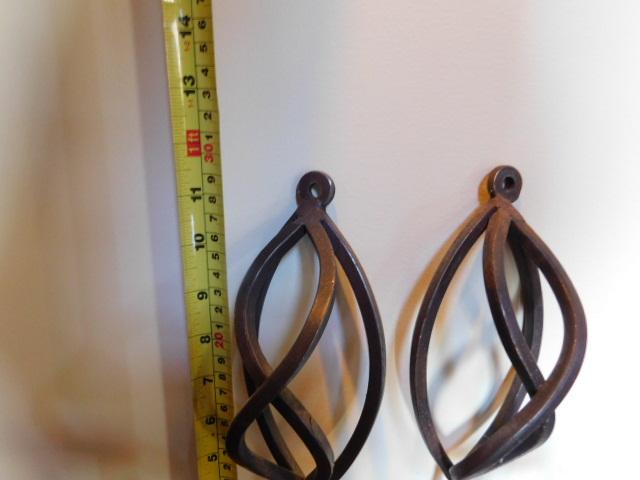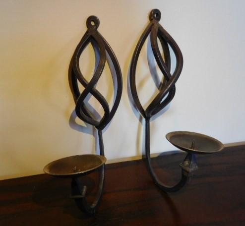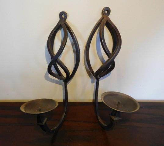 Pair of Contemporary Design Wrought Iron Wall Sconce Candle Holders 12" in very good condition with appealing design and heavy quality metal.
