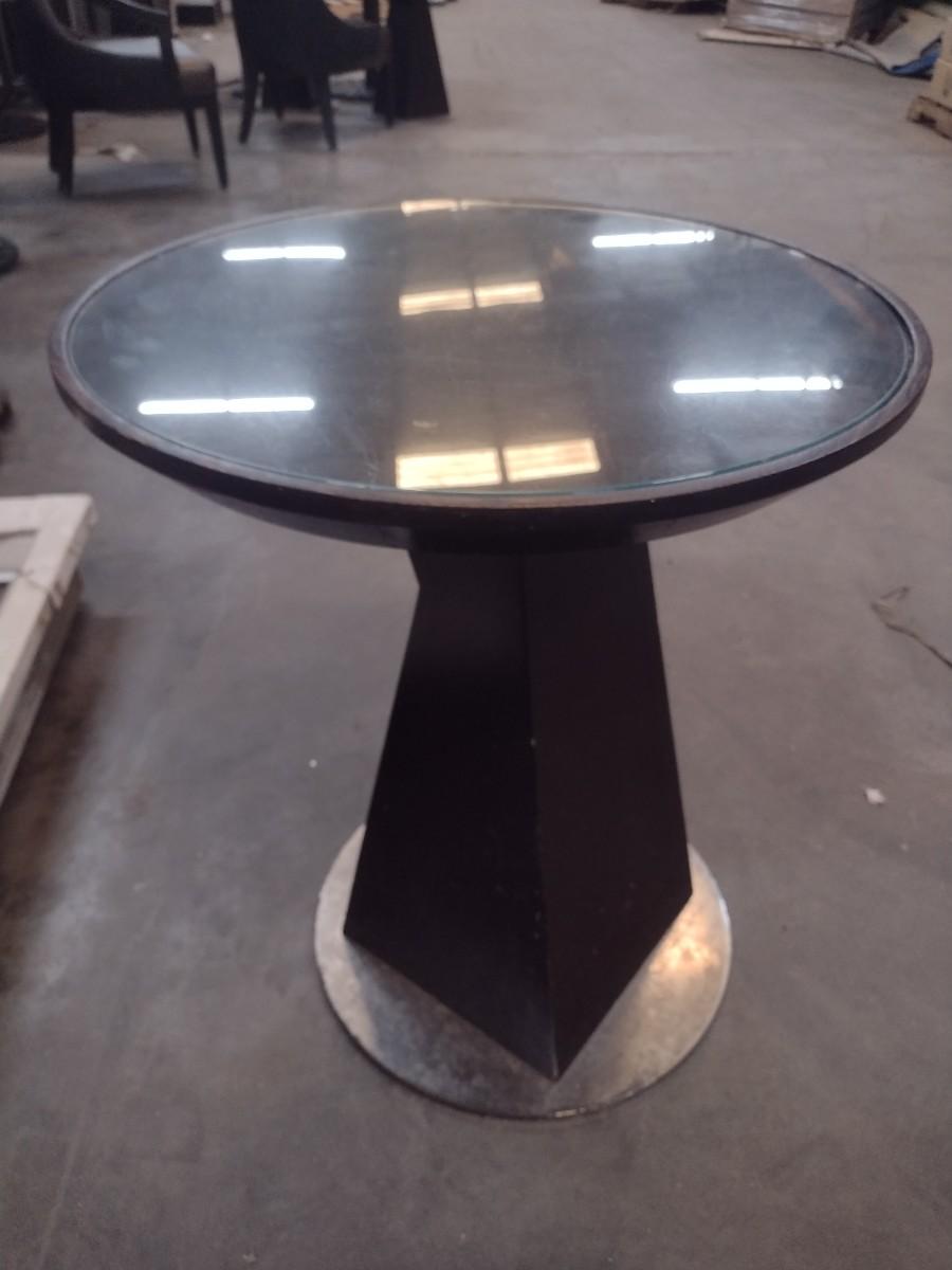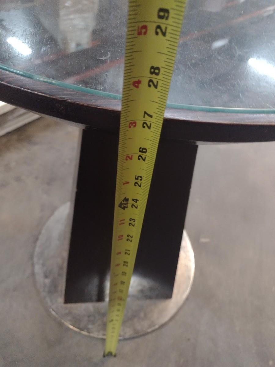 Pair of Contemporary Round Top Side Table with Glass Top and Metal Plate Base Wood Post
