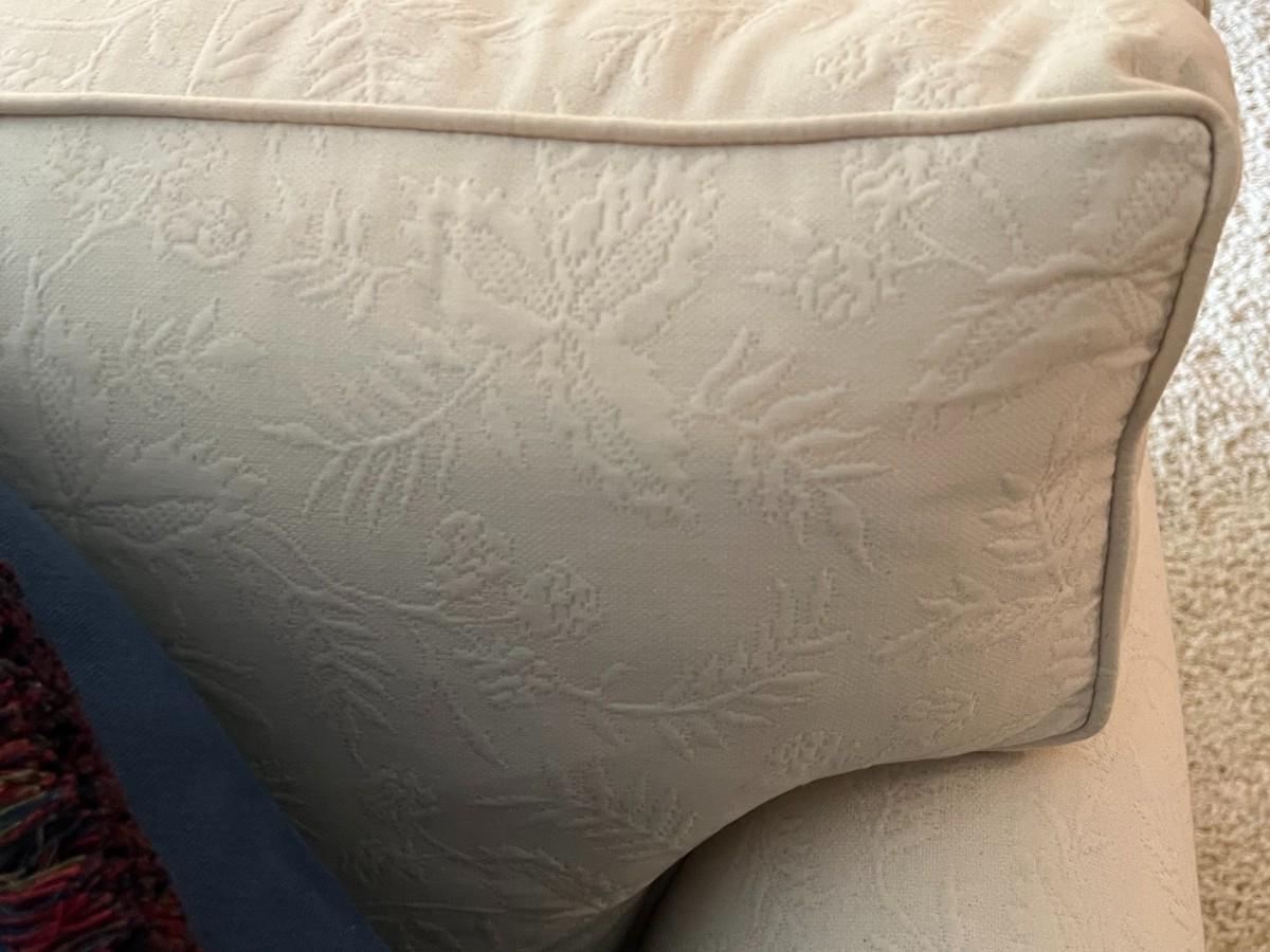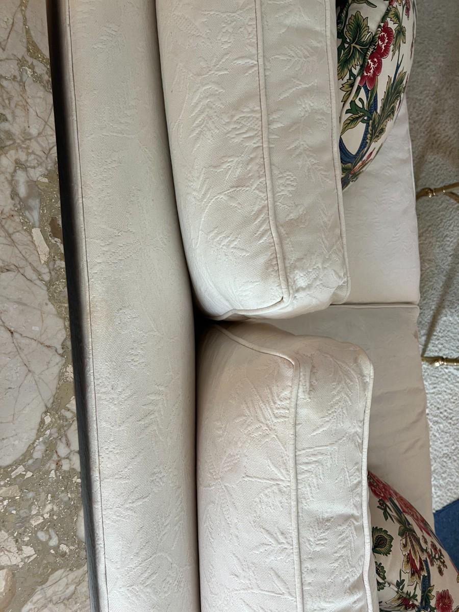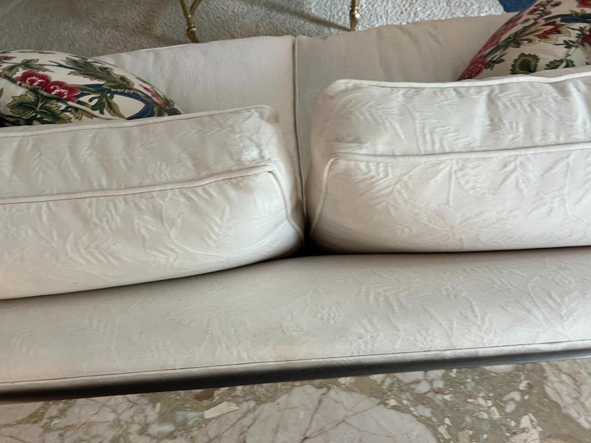 Pair of Contemporary White Couches Nail Head Trim Sofa & Love Seat. White upholstery has a white-on-white botanical pattern. In good used condition. Light signs of wear, there is one light spot on a cushion.