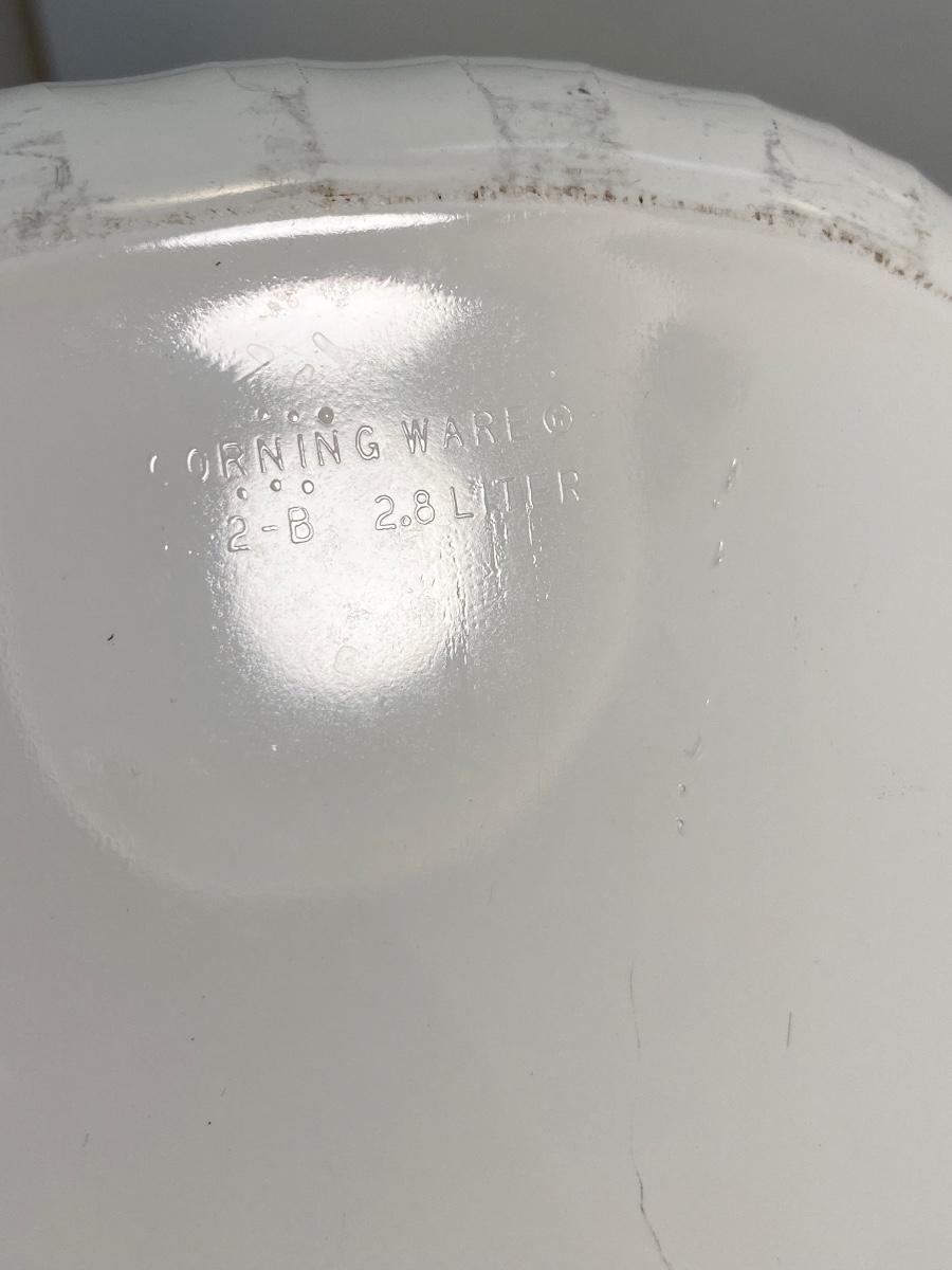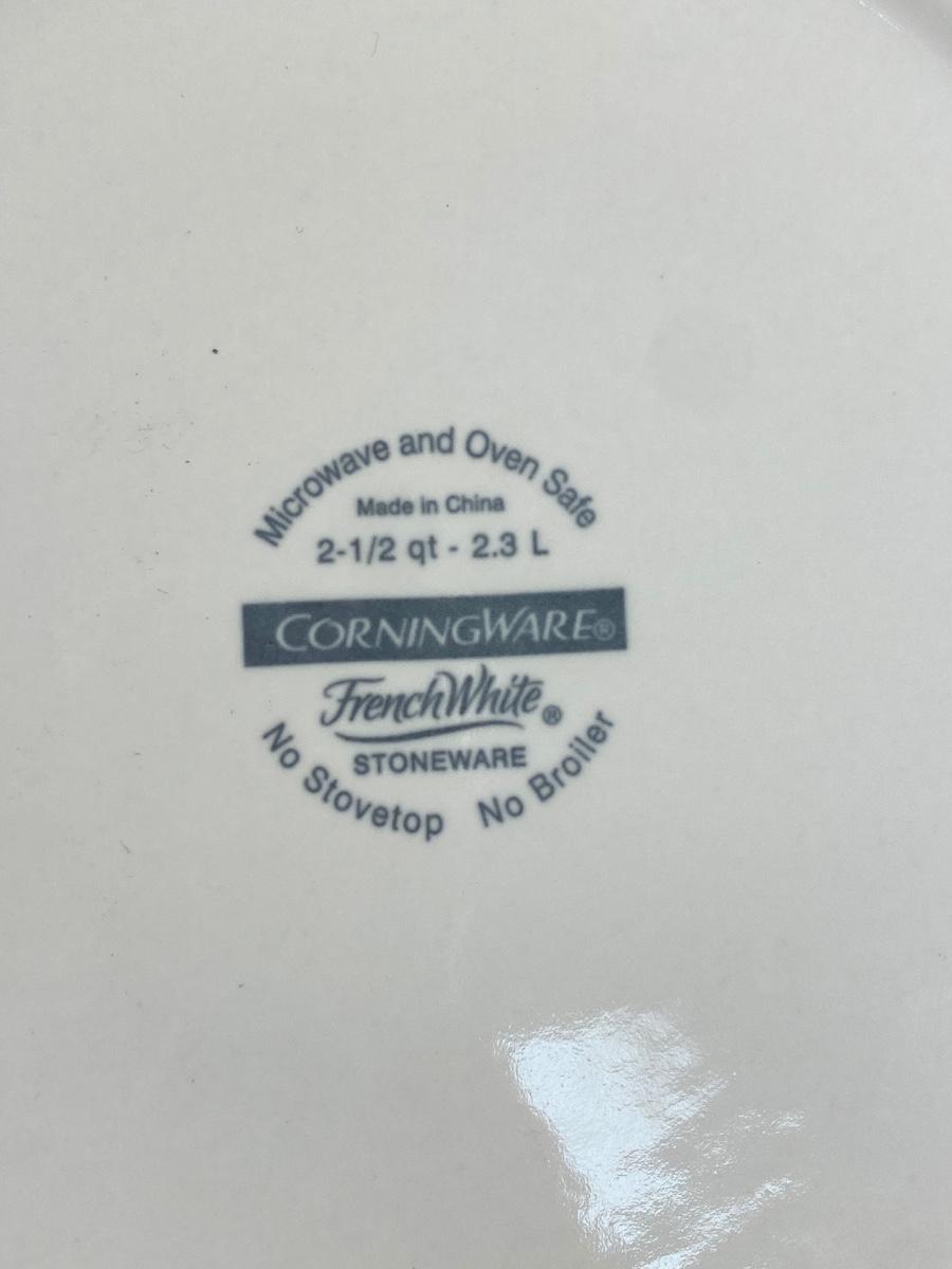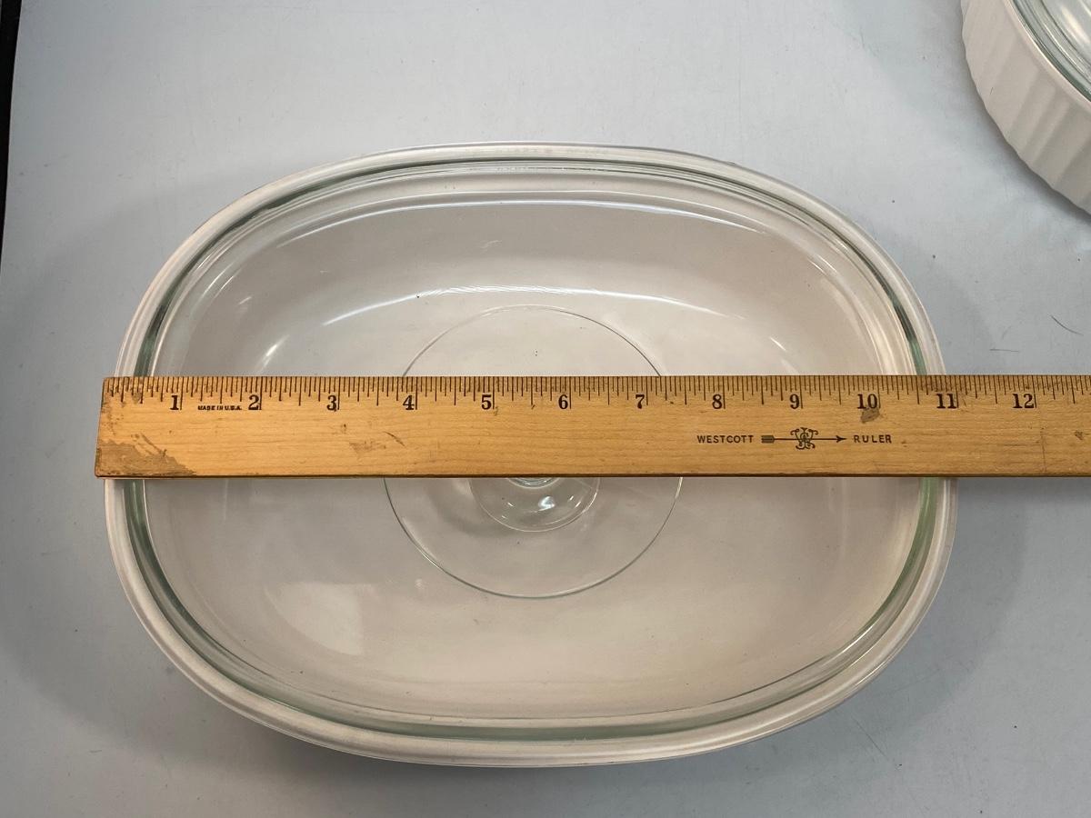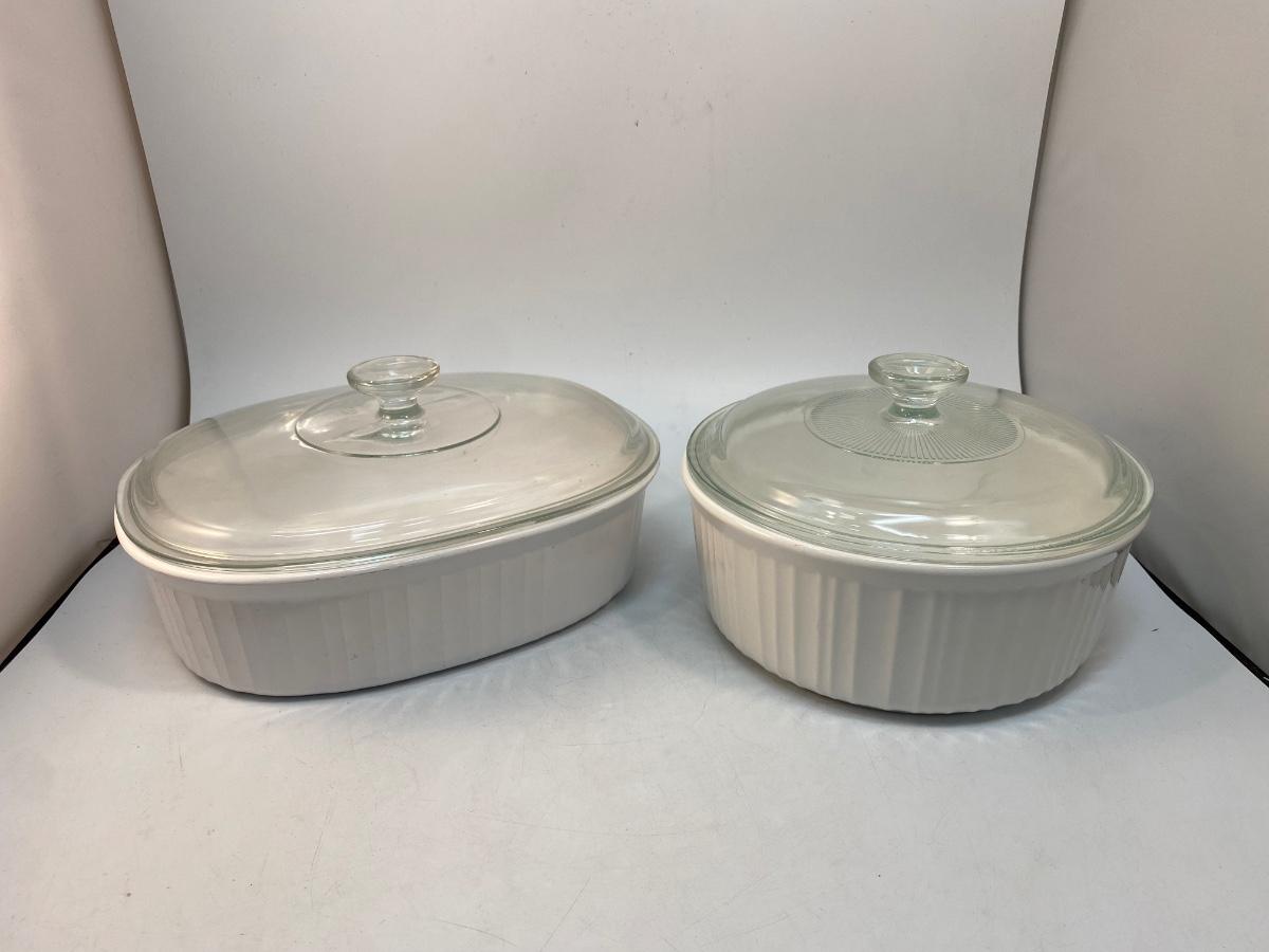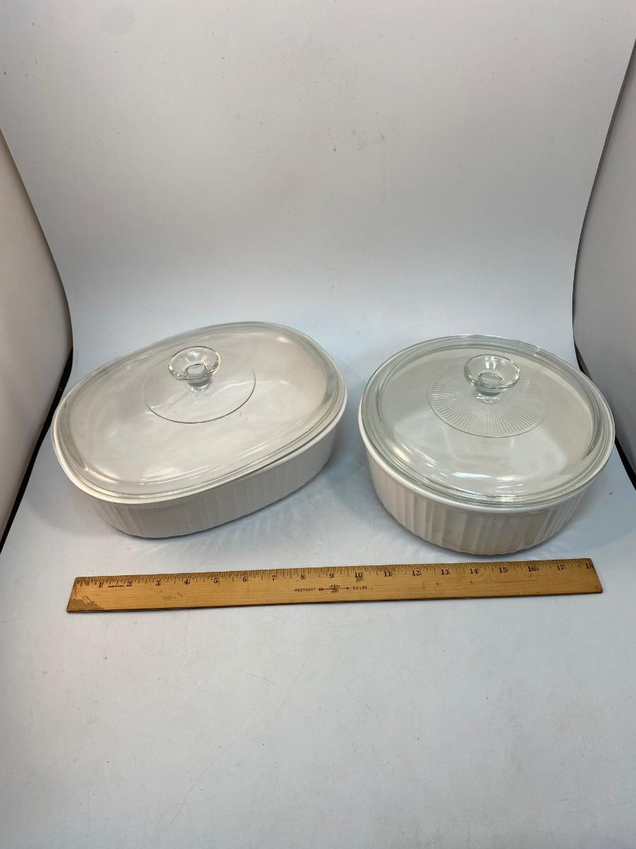 Pair of Corning Ware French White Stoneware Casserole Dishes with Lids. Both are in good condition, no chips. 2.5qt and 3qt size.