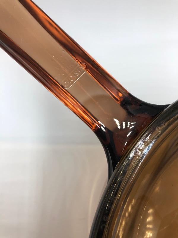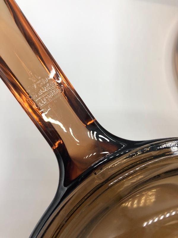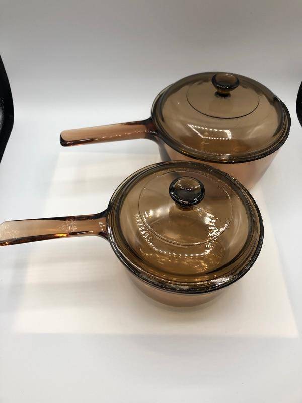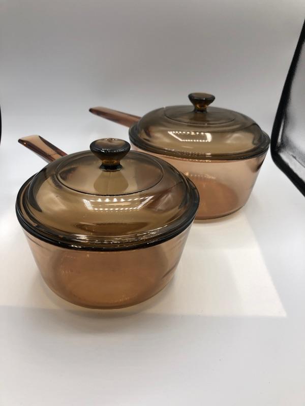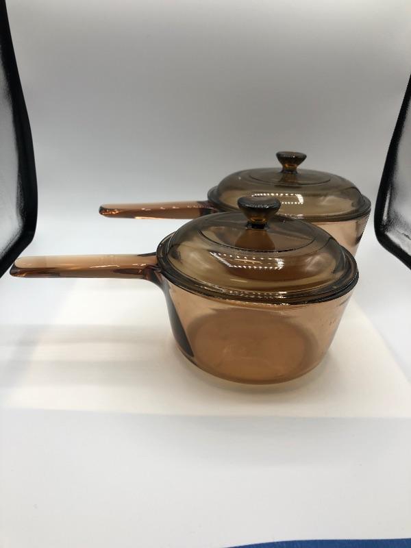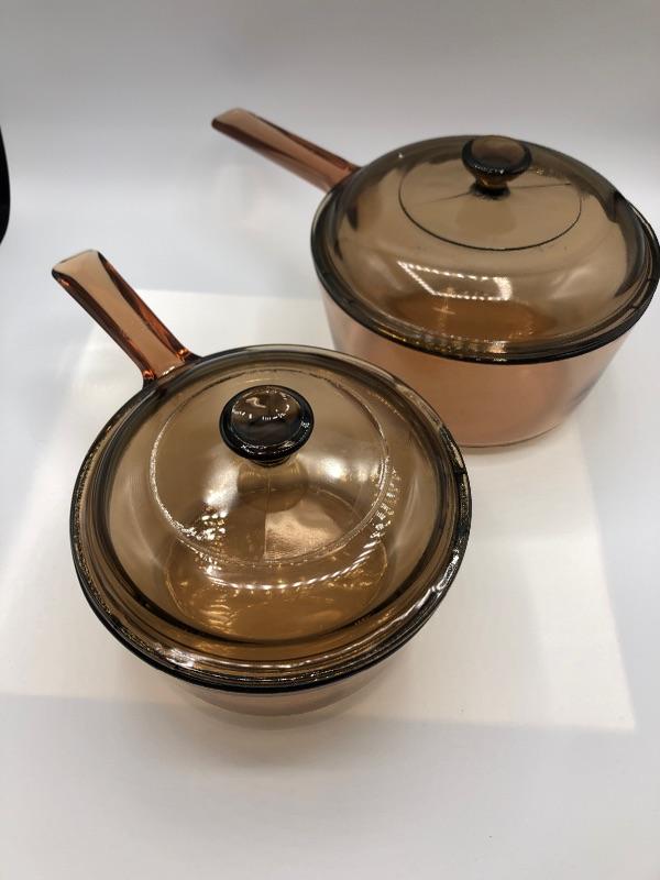 Corning Ware Visions Glass Saucepans with lids. Amber color. Both are 1 liter size. Used but in good condition.