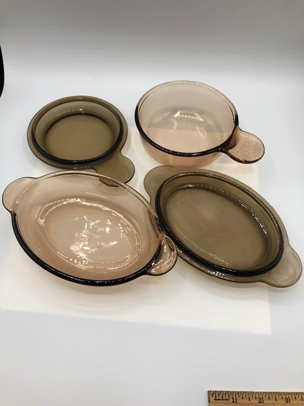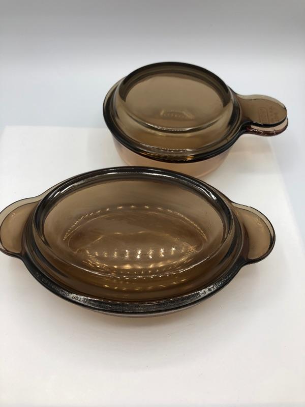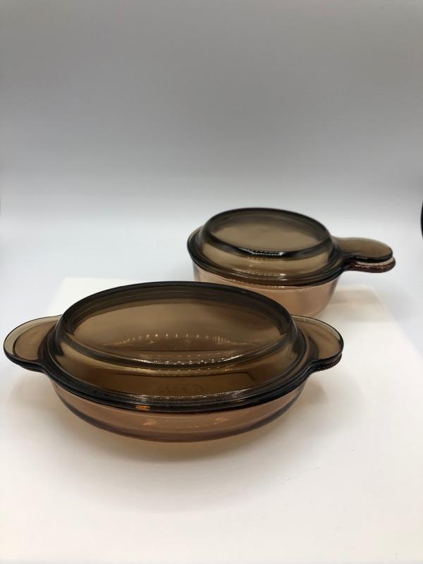 Corning Ware Visions cookware. A shallow casserole and a small sauce pan. Both pieces are lidded. Good Condition.