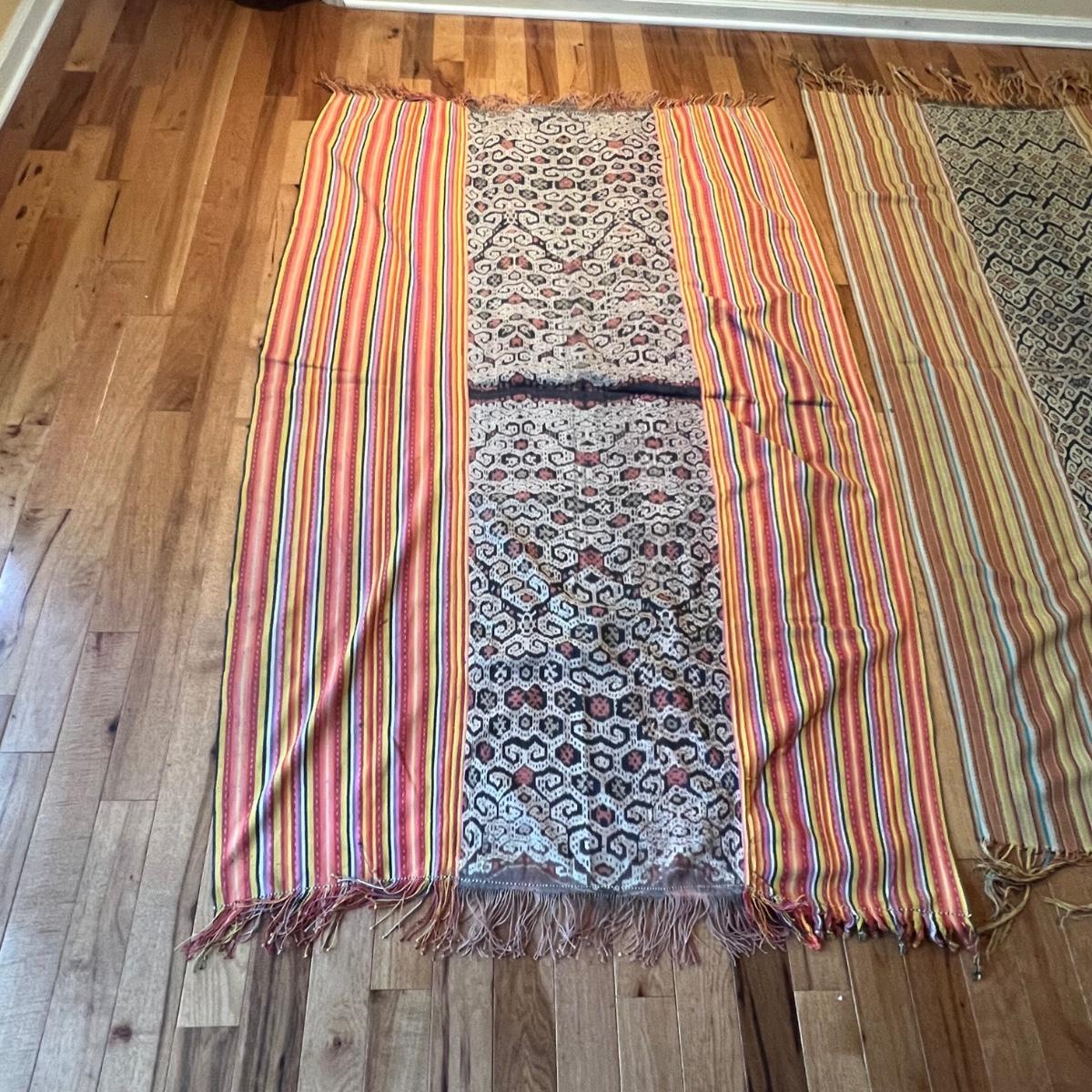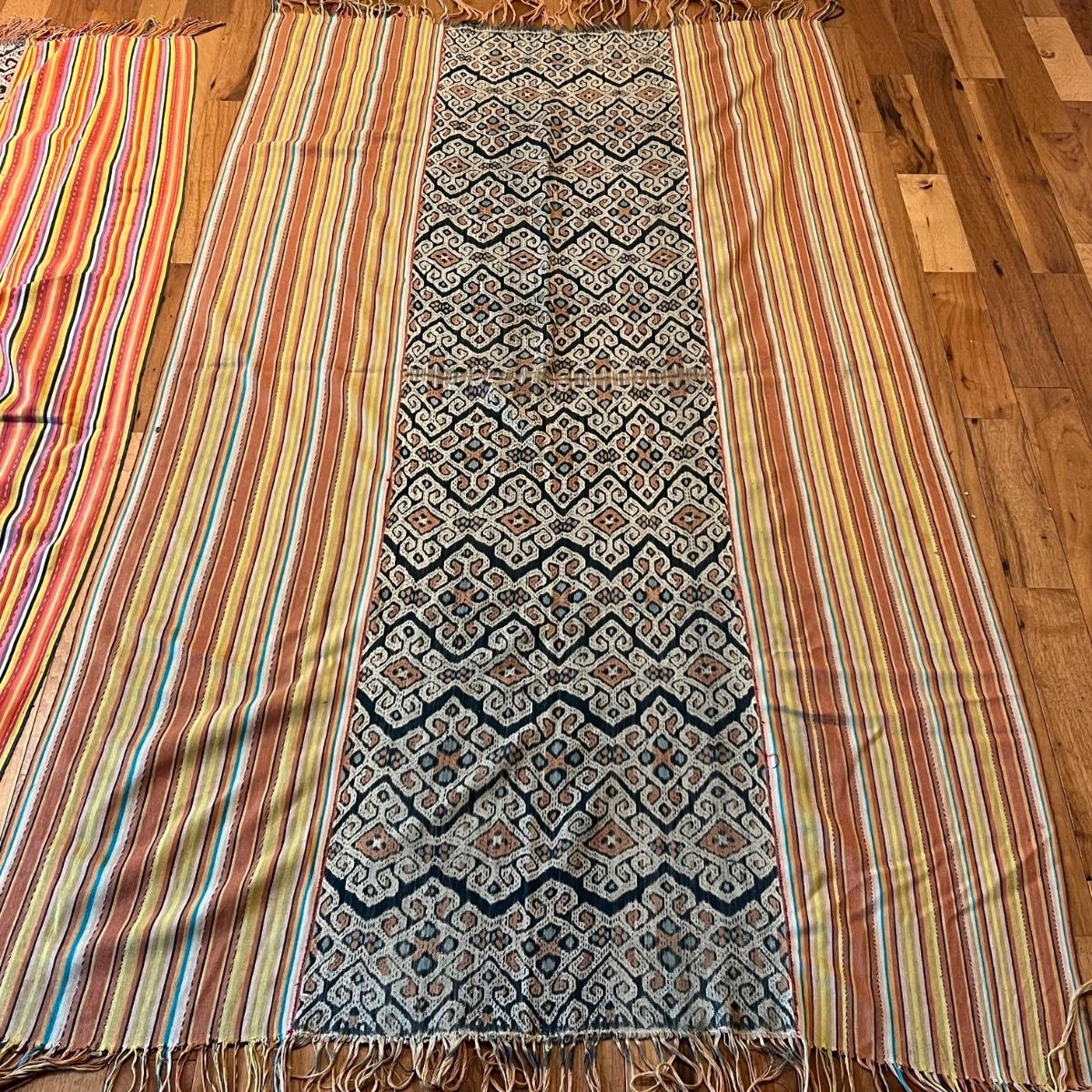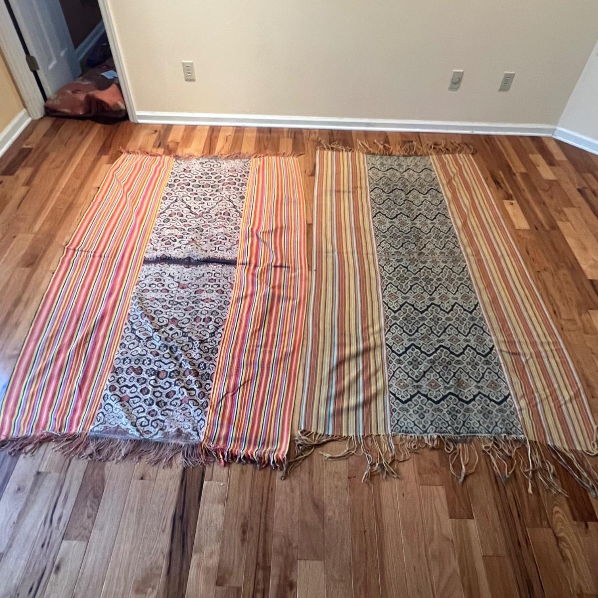 A pair of shawls most likely from Indonesia. They appear to be cotton warp ikat and have the distinctive design from this traditional dyeing technique. These shawls measure 41” x 72” and could be also be used as tablecloths, throws or wall hangings. One shawl has a light mark that most likely happened during the dyeing process and the other item has a 3” area where the thread has come apart but could easily be re-sewn.