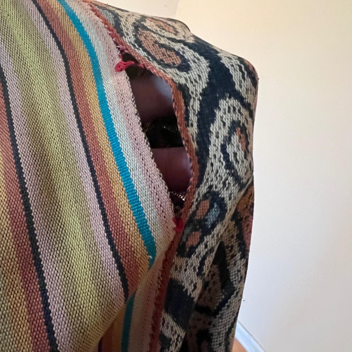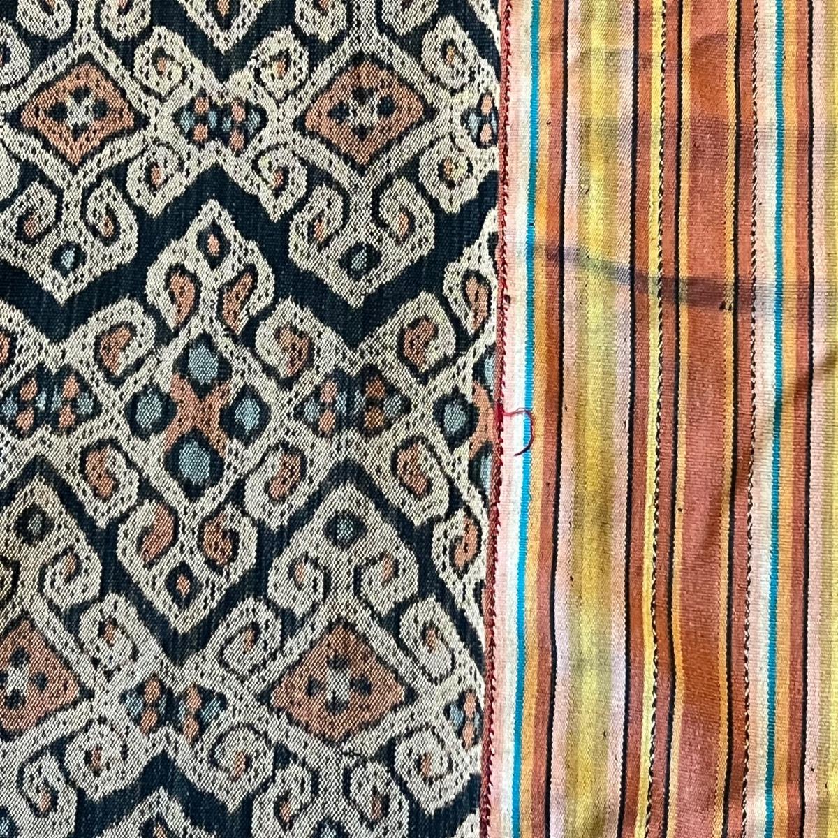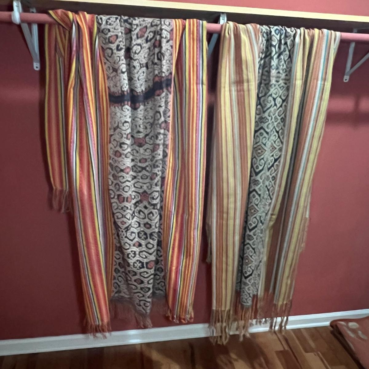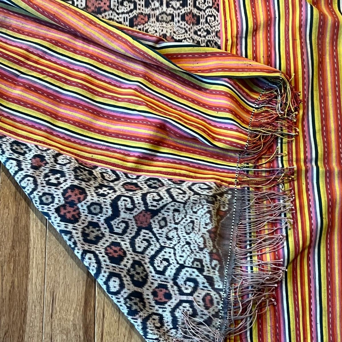 A pair of shawls most likely from Indonesia. They appear to be cotton warp ikat and have the distinctive design from this traditional dyeing technique. These shawls measure 41” x 72” and could be also be used as tablecloths, throws or wall hangings. One shawl has a light mark that most likely happened during the dyeing process and the other item has a 3” area where the thread has come apart but could easily be re-sewn.