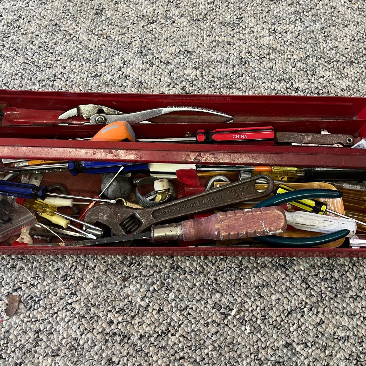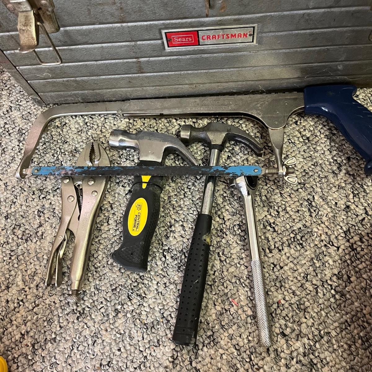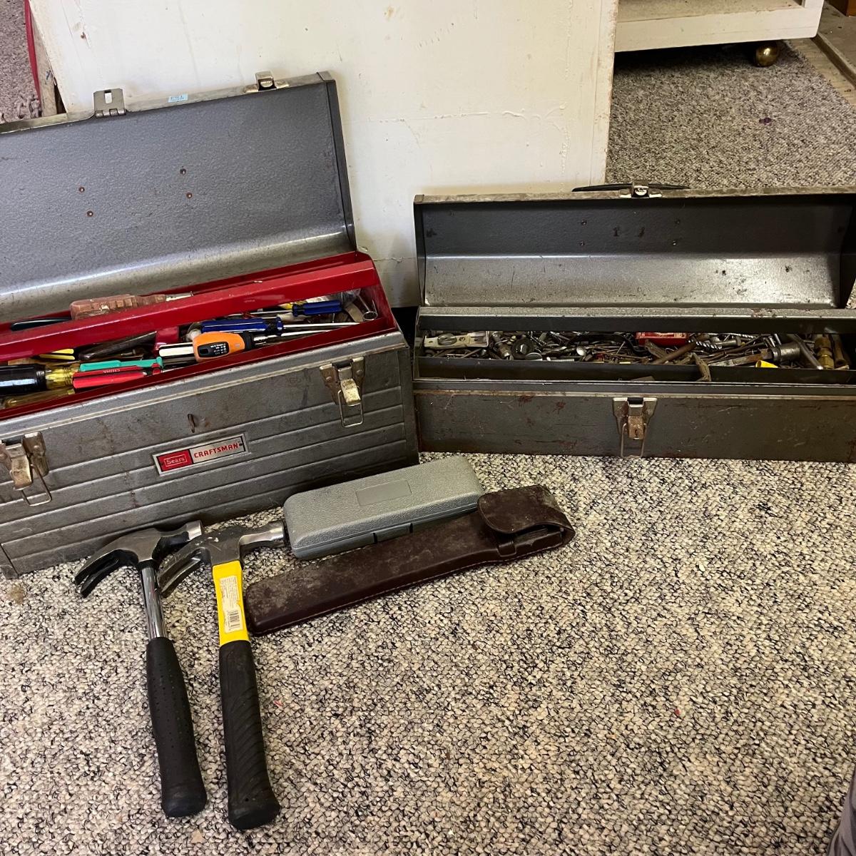 Lot contains two metal Craftsman toolboxes with their contents that includes hammers, hex keys, pliers, screwdrivers, saws, slide rule and more. Largest toolbox measures 8” x 18” x 9”.