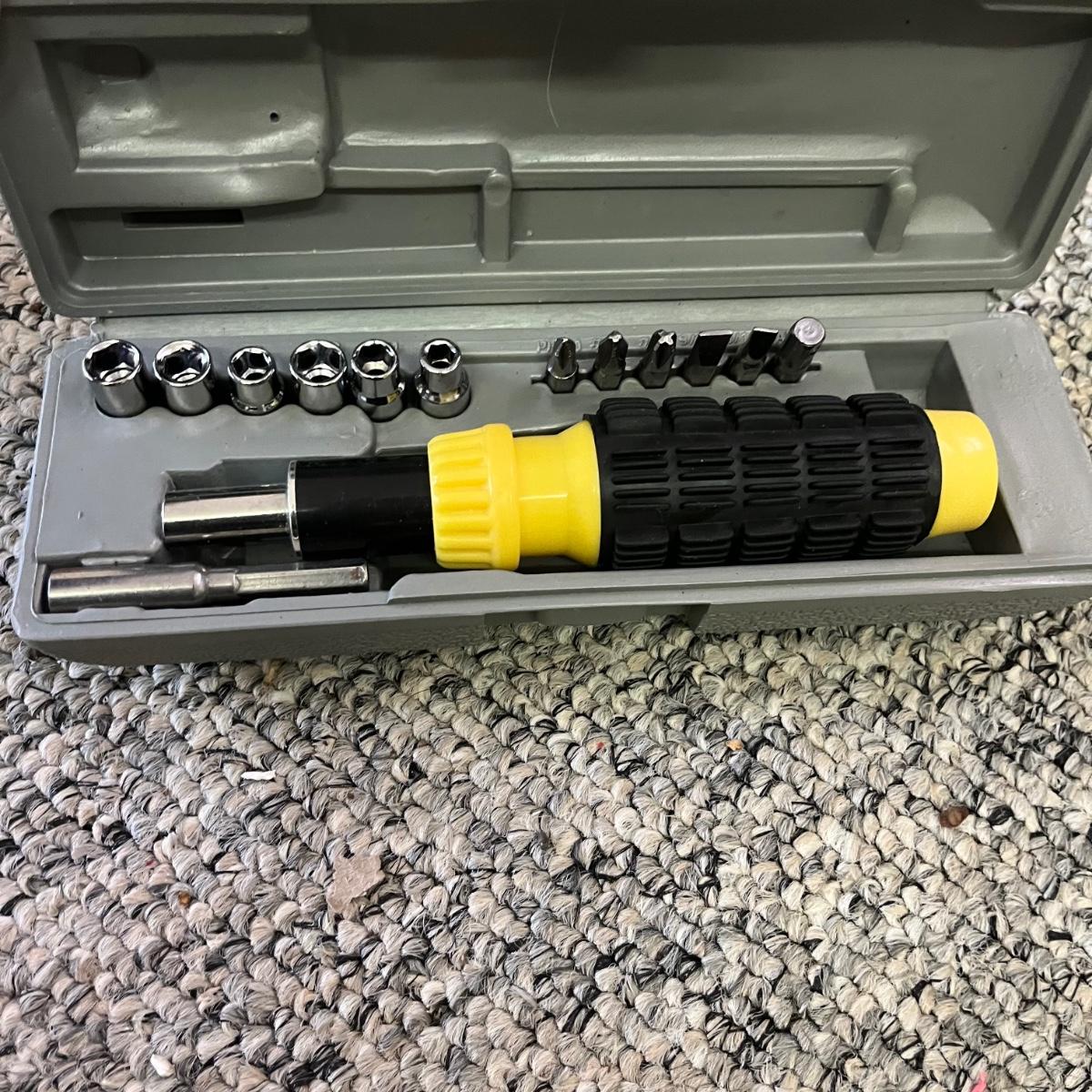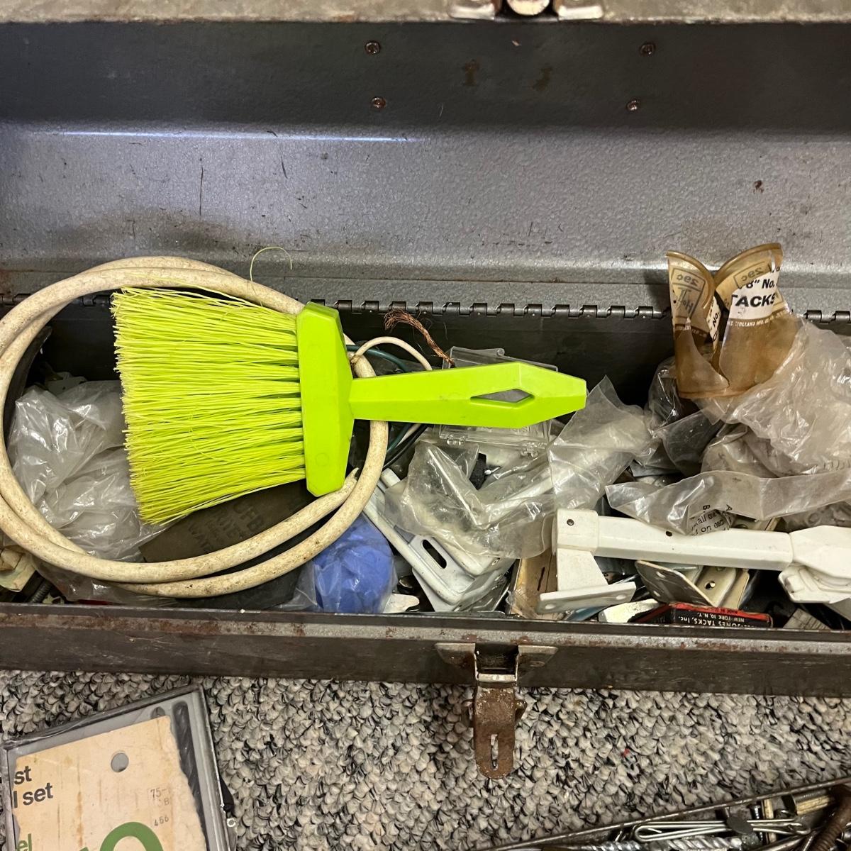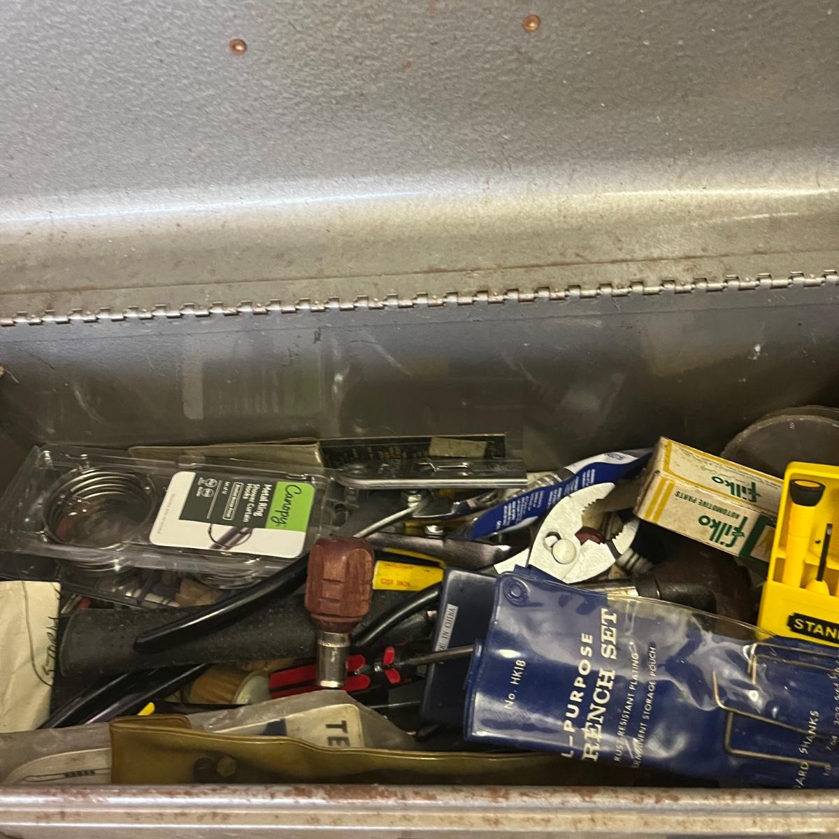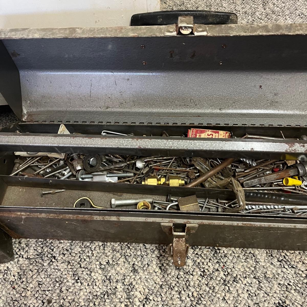 Lot contains two metal Craftsman toolboxes with their contents that includes hammers, hex keys, pliers, screwdrivers, saws, slide rule and more. Largest toolbox measures 8” x 18” x 9”.