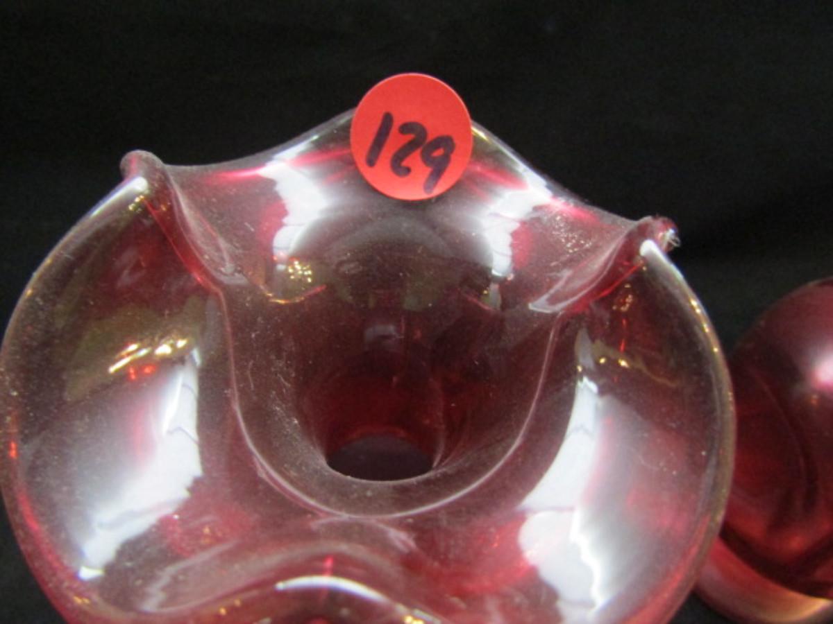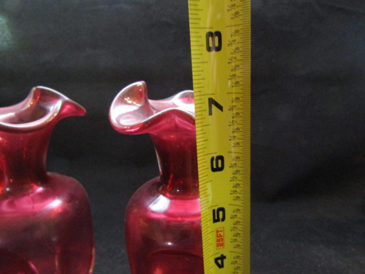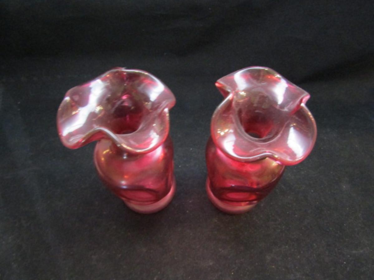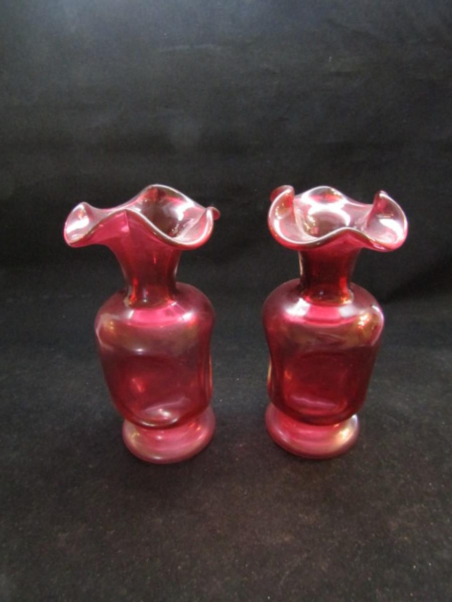 Pair of Cranberry Glass Vases with Ruffled Tops- Possibly Fenton (#129)