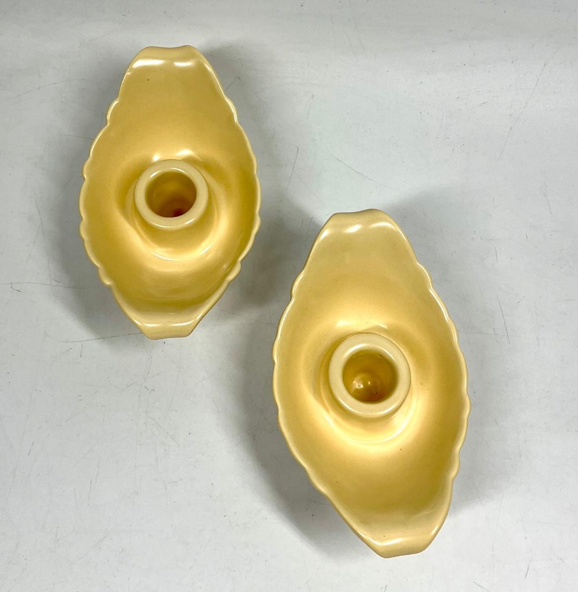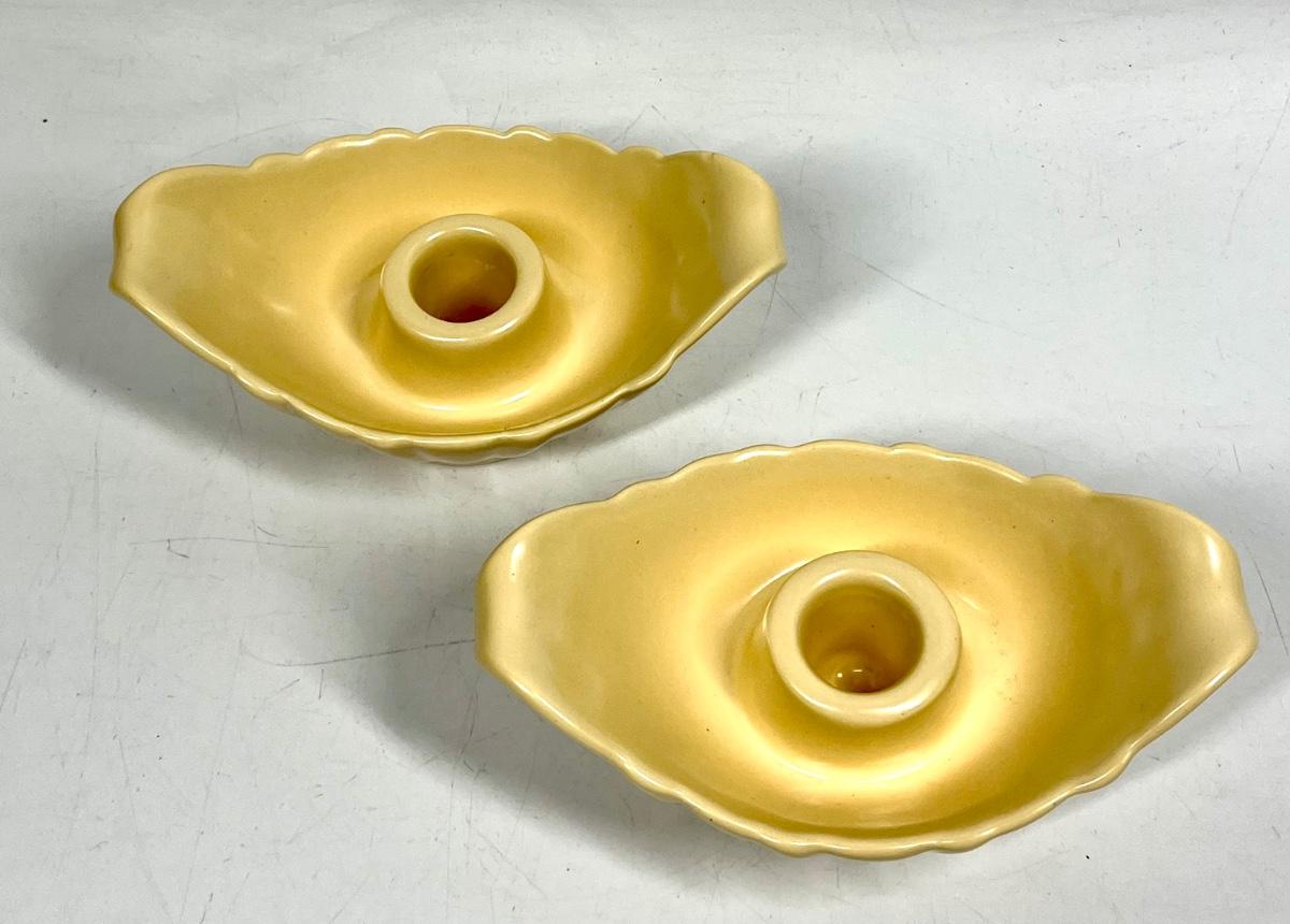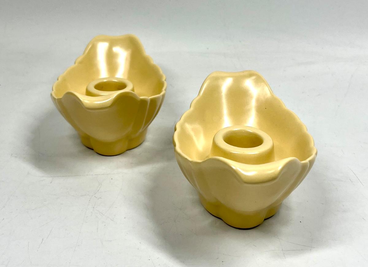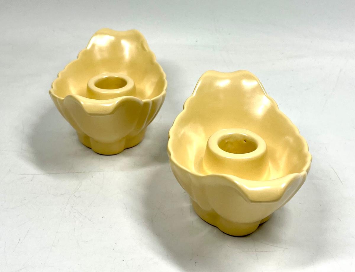 Vintage Ceramic Pale Peachy Yellow Satin Finish Taper Candlestick Holders. In good vintage condition. Unmarked.