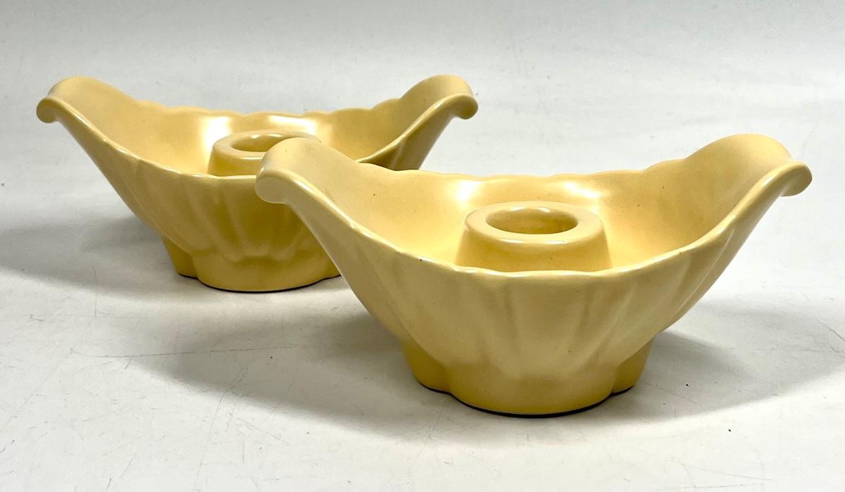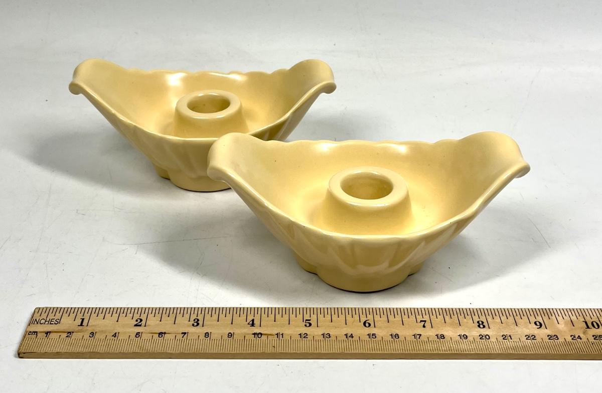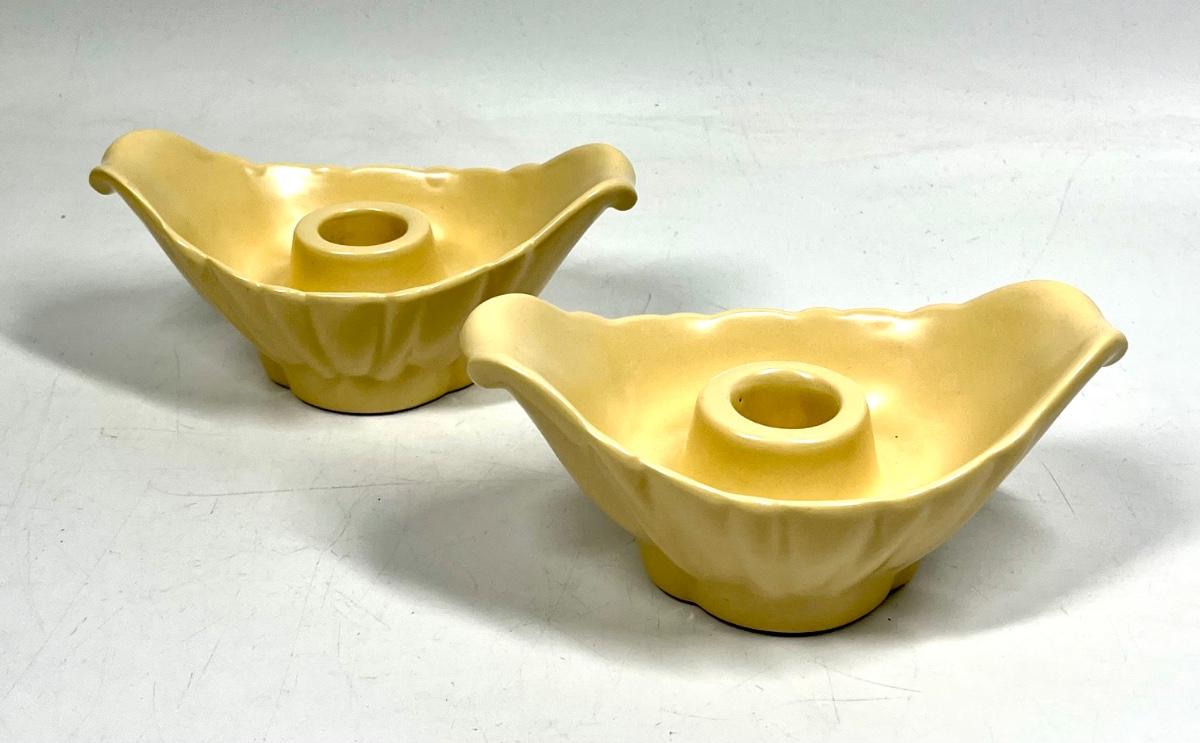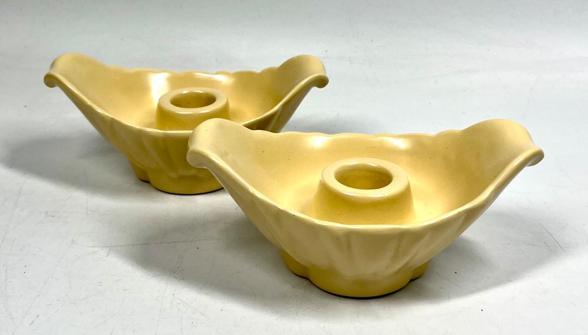 Vintage Ceramic Pale Peachy Yellow Satin Finish Taper Candlestick Holders. In good vintage condition. Unmarked.