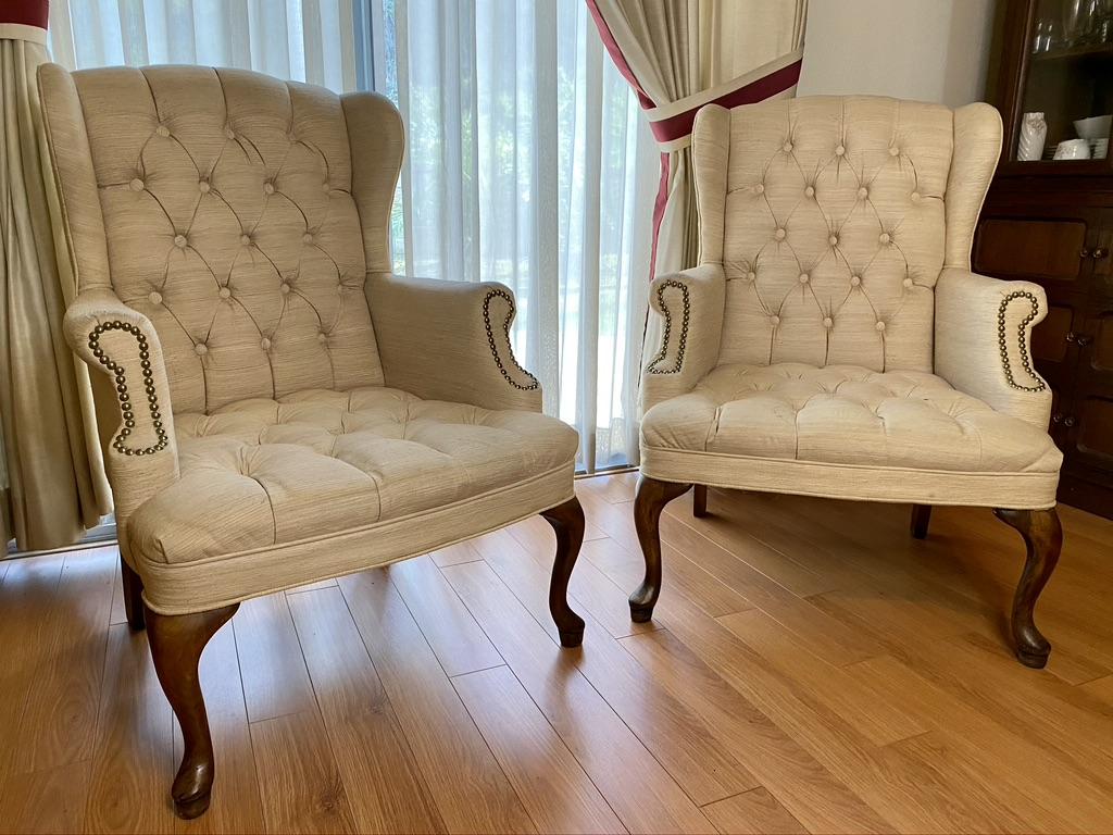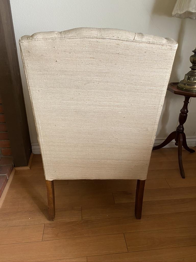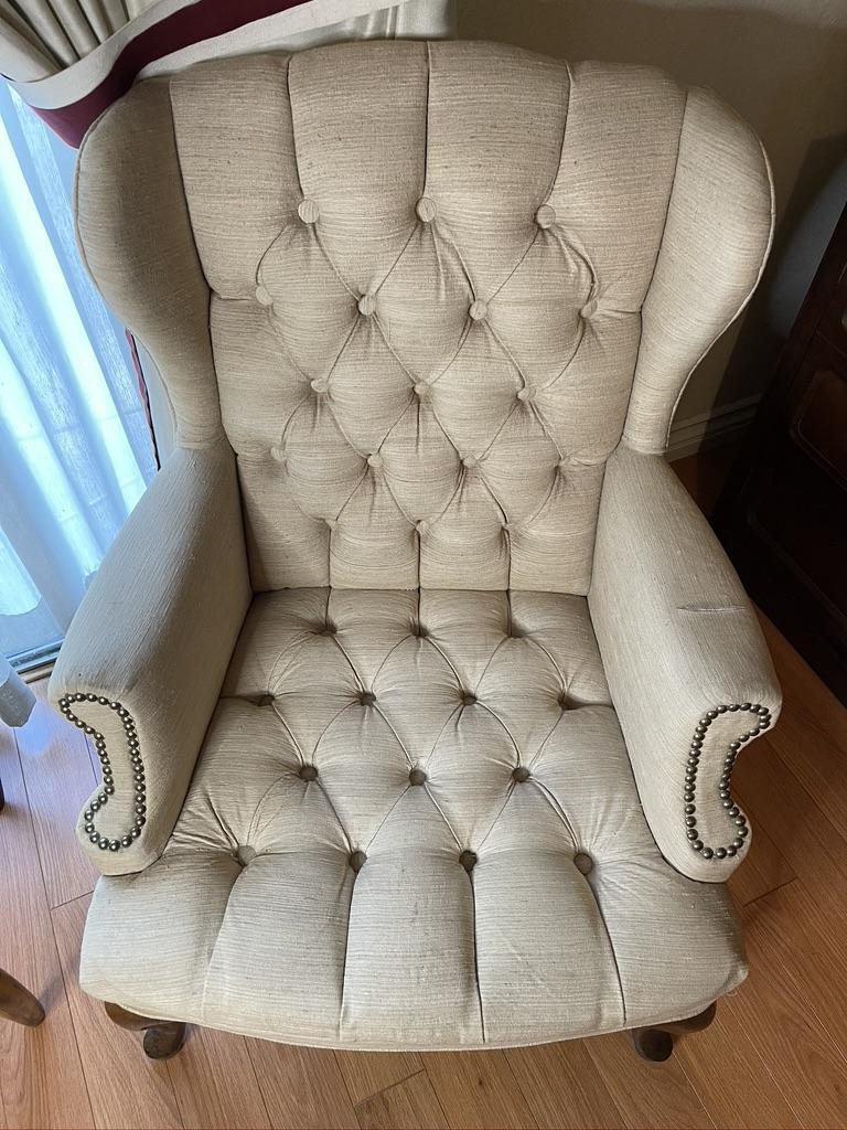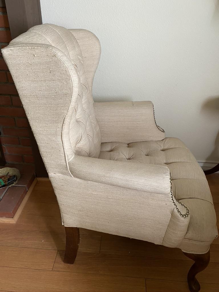 Pair of Cream Winged chairs with Tuffing. Each chair has a small tear on the arm and light stains