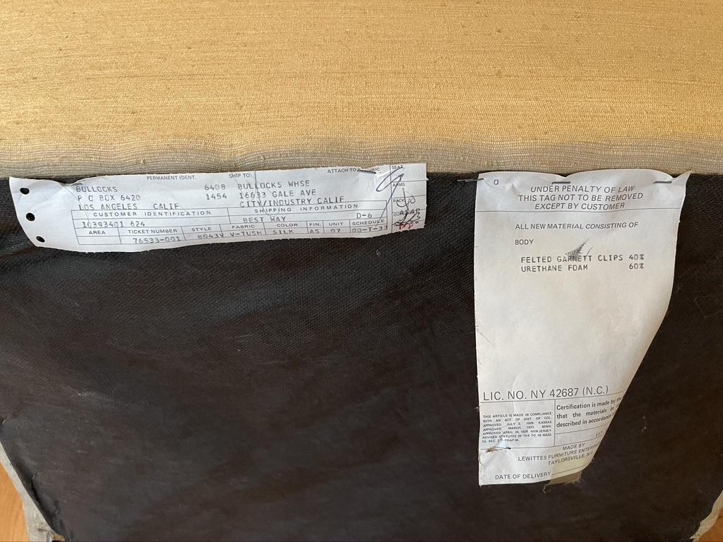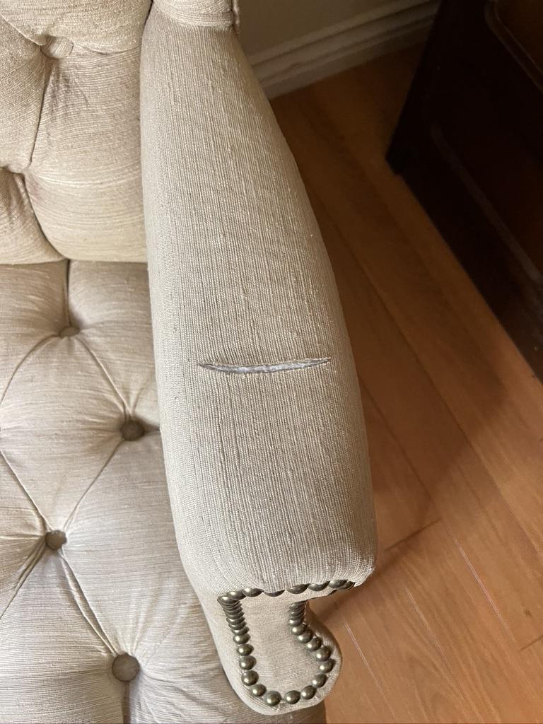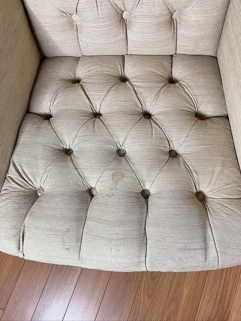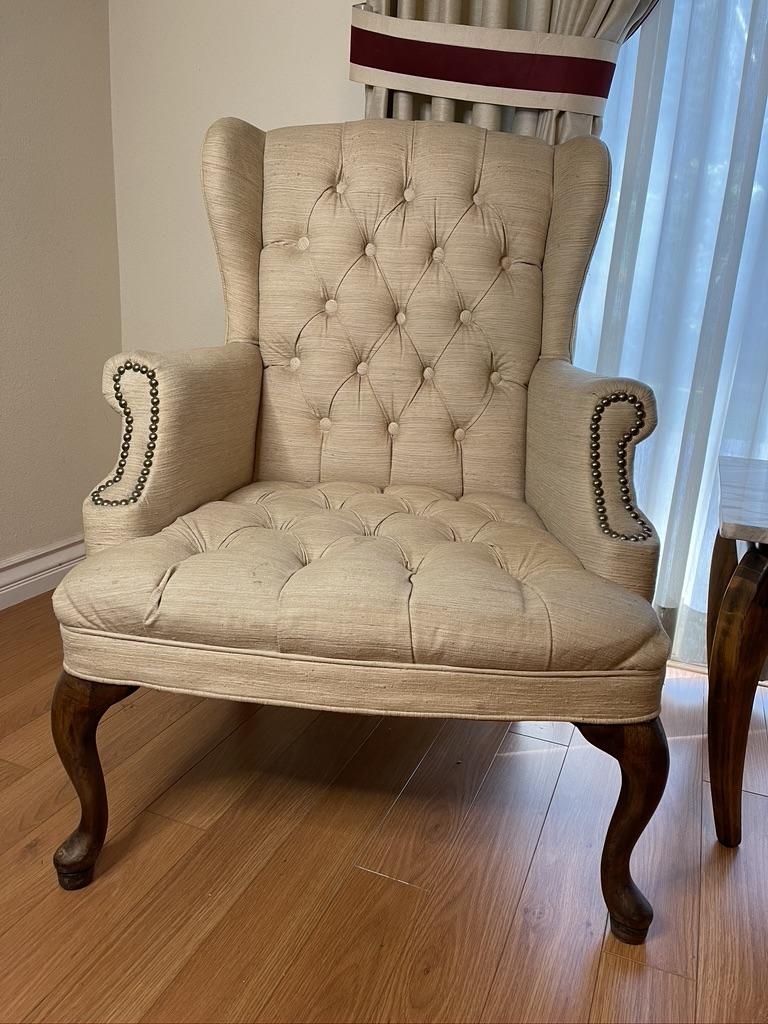 Pair of Cream Winged chairs with Tuffing. Each chair has a small tear on the arm and light stains