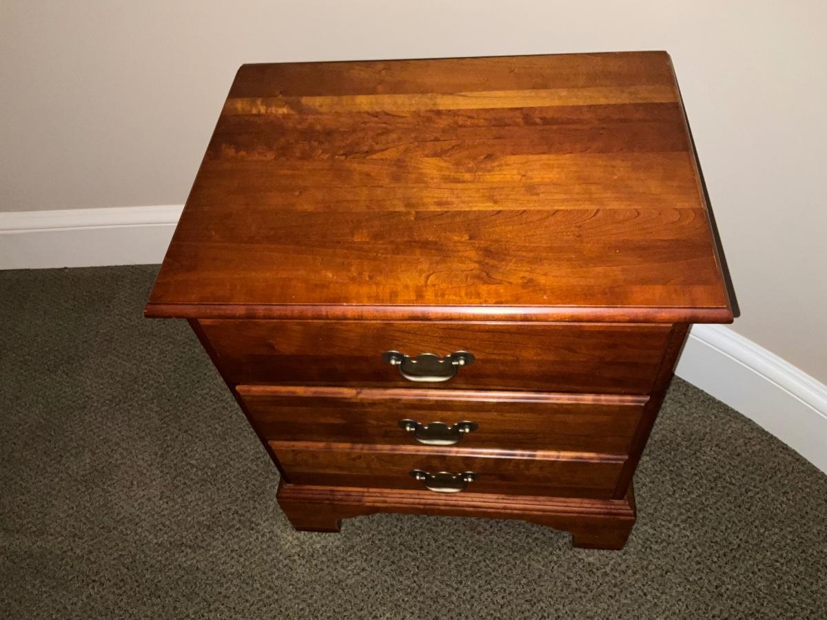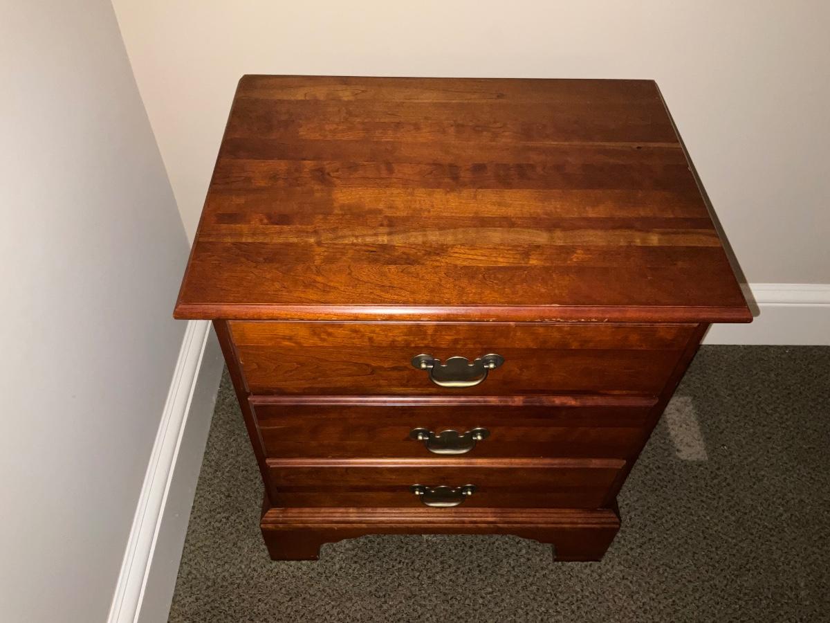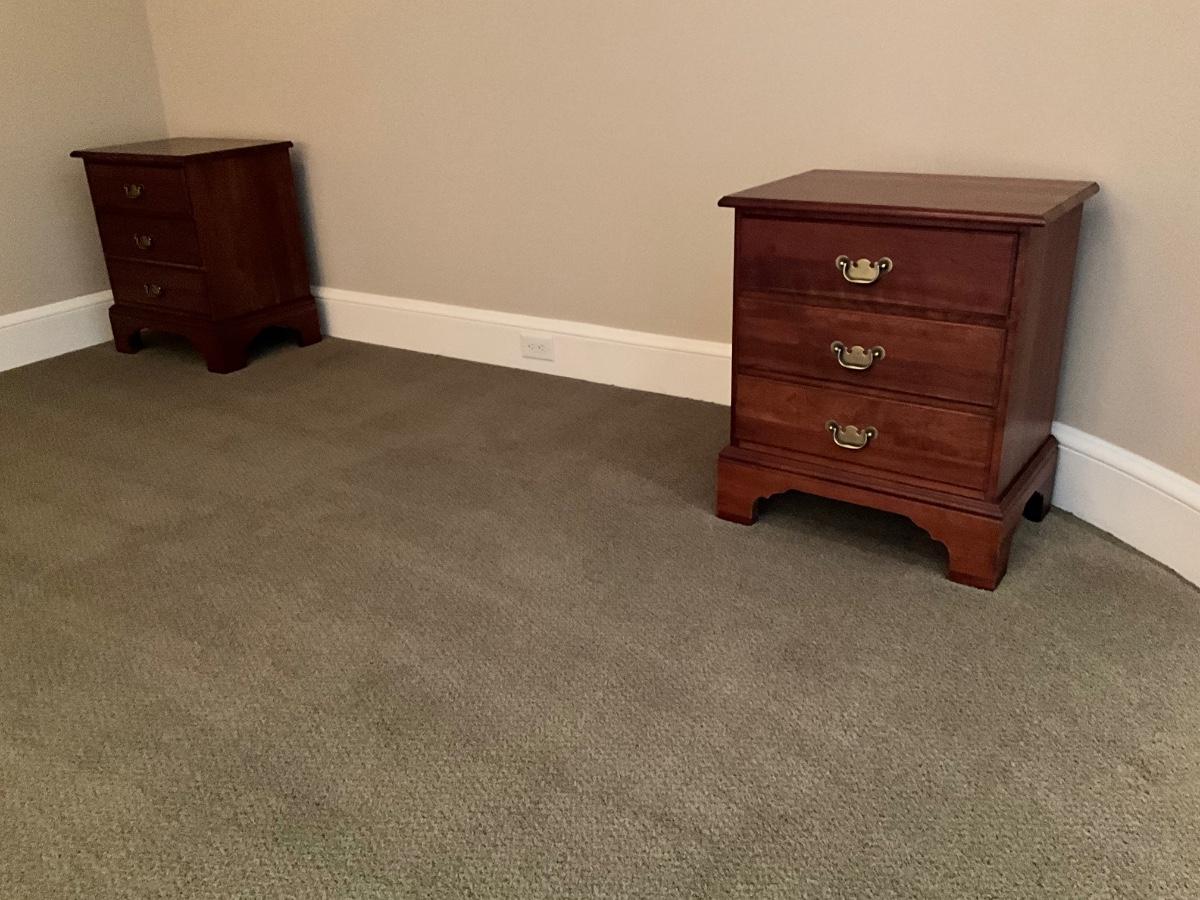Solid Cherry wood, nightstands Crescent furniture. May find very few scratches, etc. They are 23 inches wide, 17 inches deep, and 27 inches