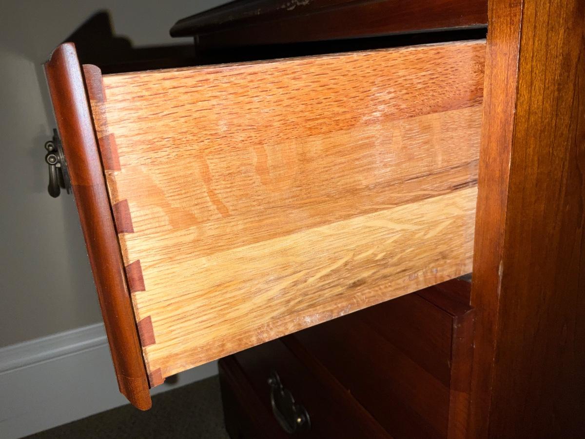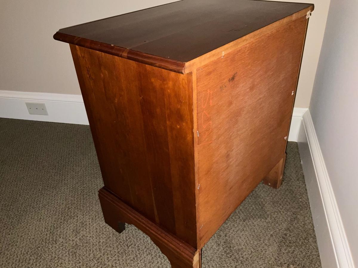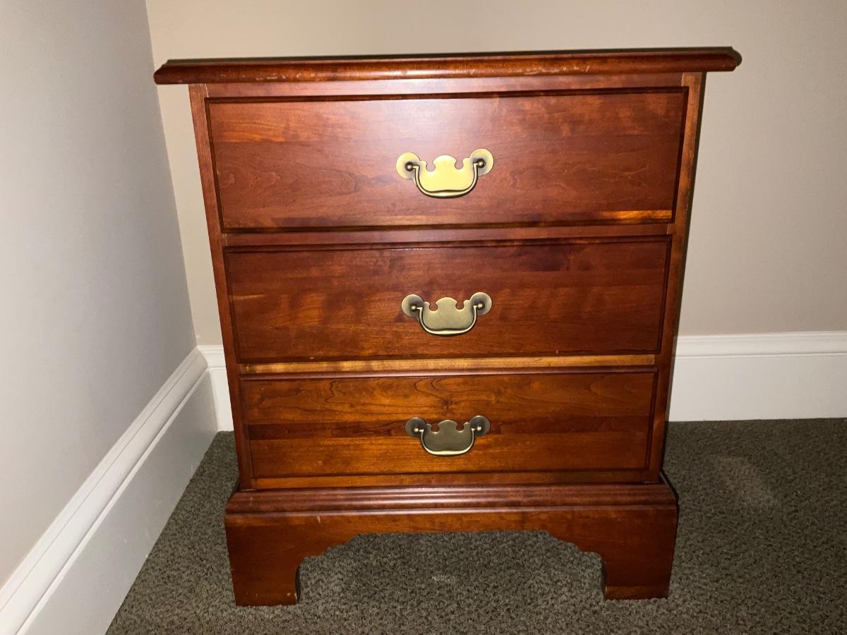 Solid Cherry wood, nightstands Crescent furniture. May find very few scratches, etc. They are 23 inches wide, 17 inches deep, and 27 inches