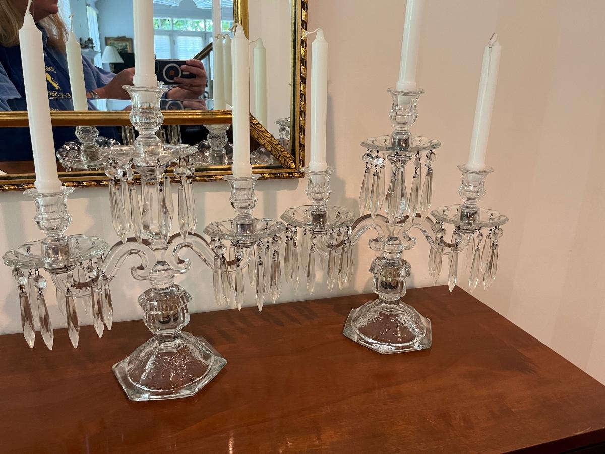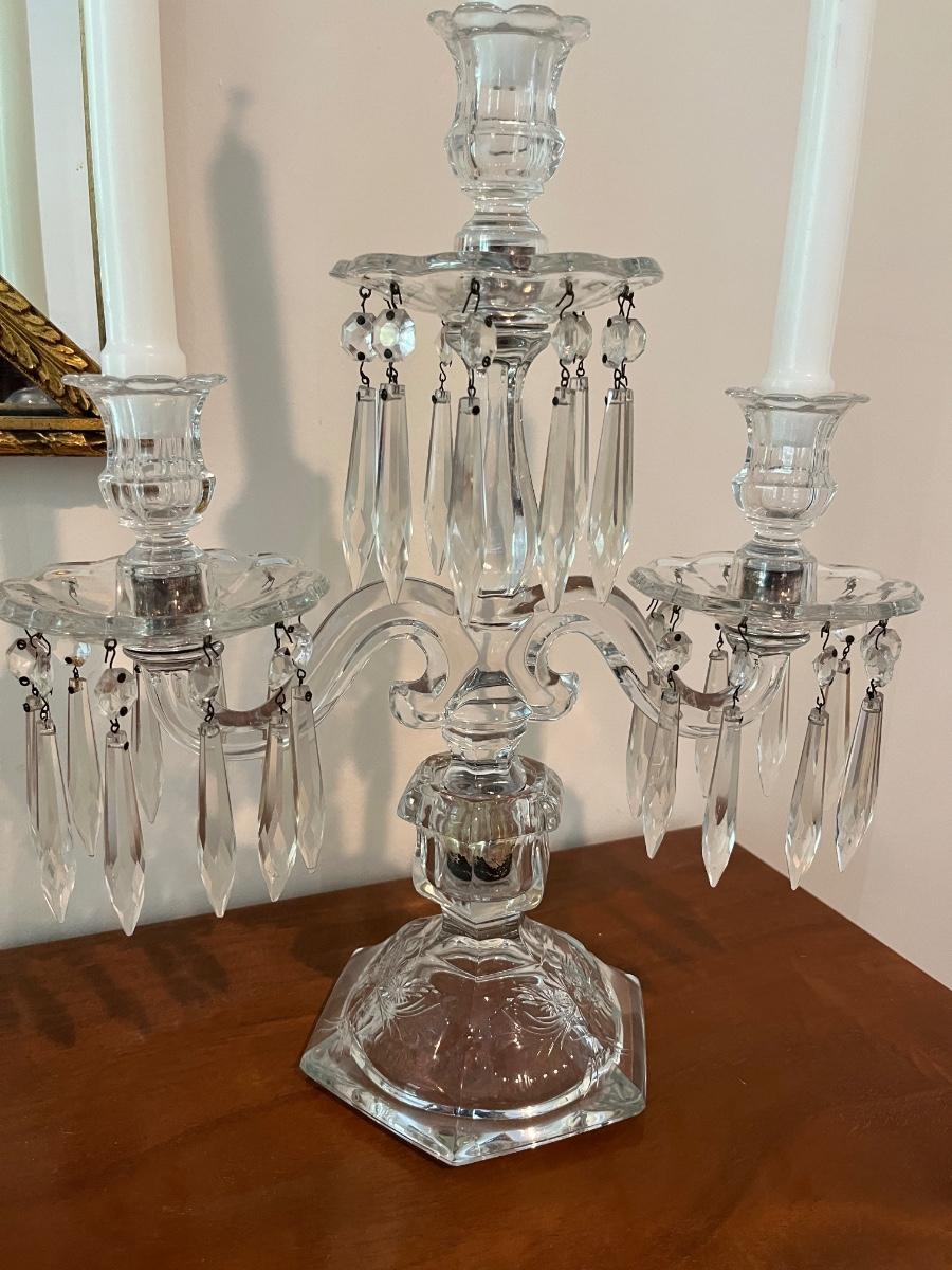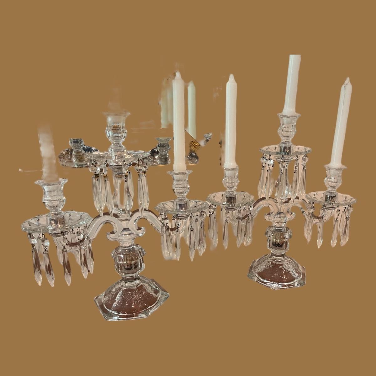 PAIR OF CRYSTAL 3 ARM CANDELABRA WITH CRYSTAL PRISMS