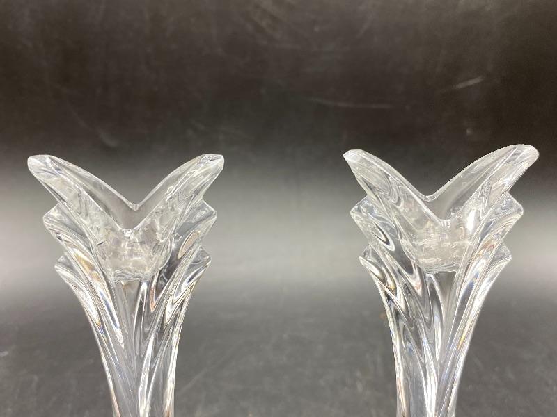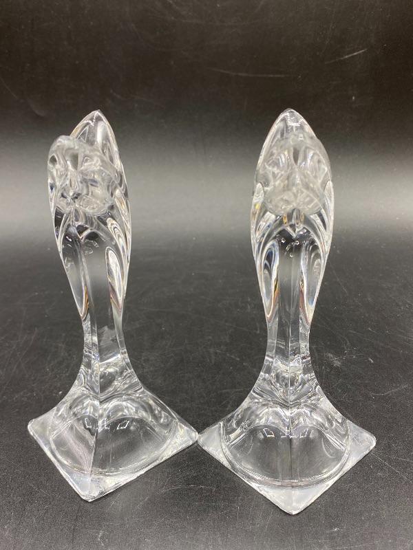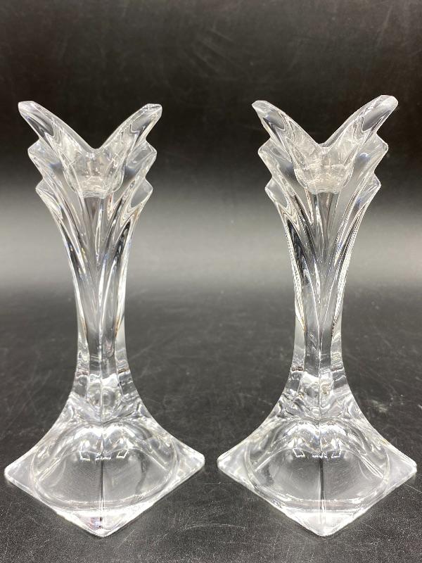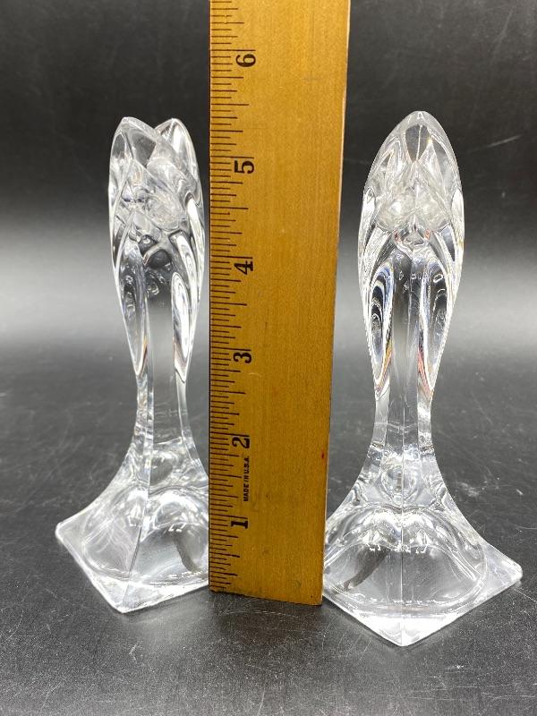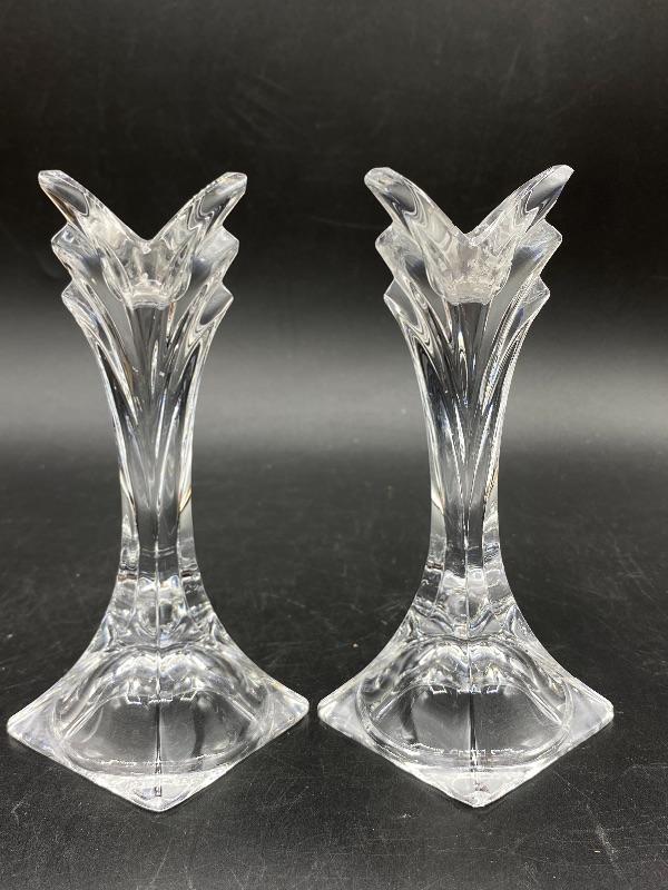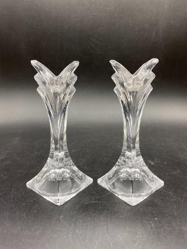 Pair of small crystal candlestick holders. Simple elegant design. About 5.5" tall. Hold taper candles.