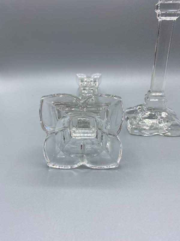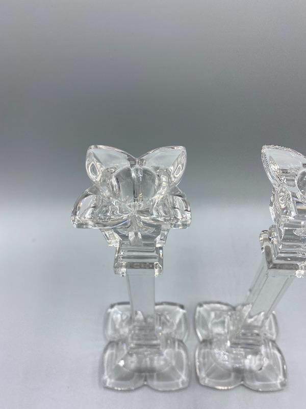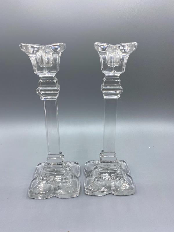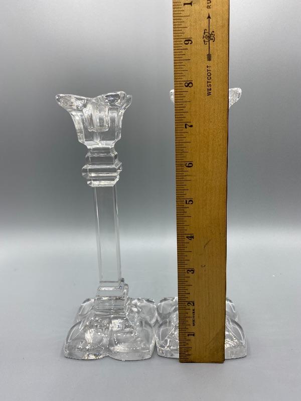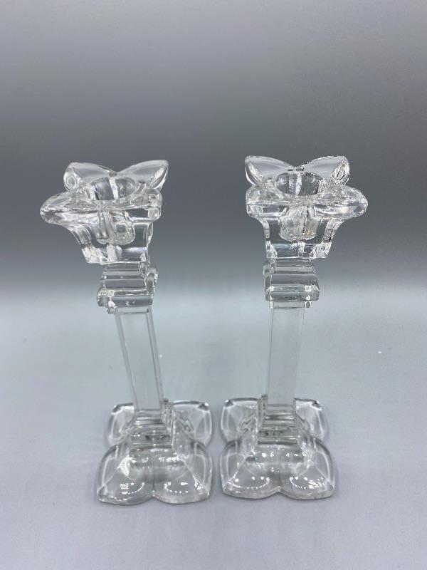 Pair of crystal candlestick holders. Elegant simple design for any table setting. Beautifully clear crystal. Unbranded. About 8" tall.