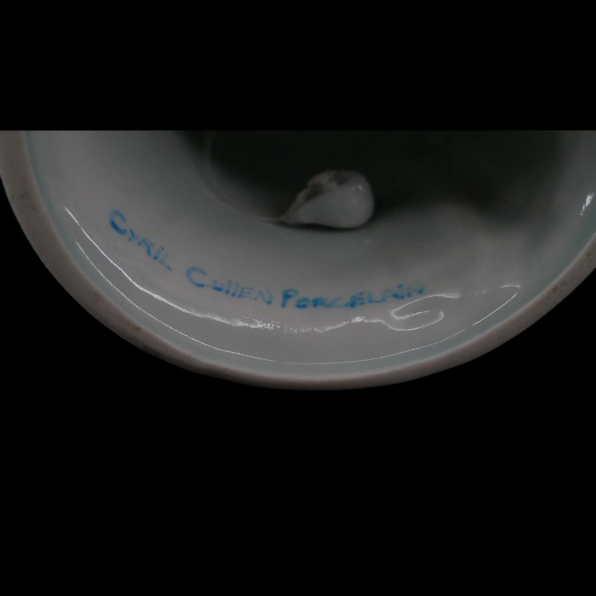 Two vintage, handmade porcelain bells. Signed Cyril Cullen inside. Large bell with depiction of wedding couple measures L 3.5" x H 6.5". Small bell with girl and bird on branch measures L 2.5 x H 4.5". Both in superb condition! No issues found. Lot weighs 8 oz. (C119)