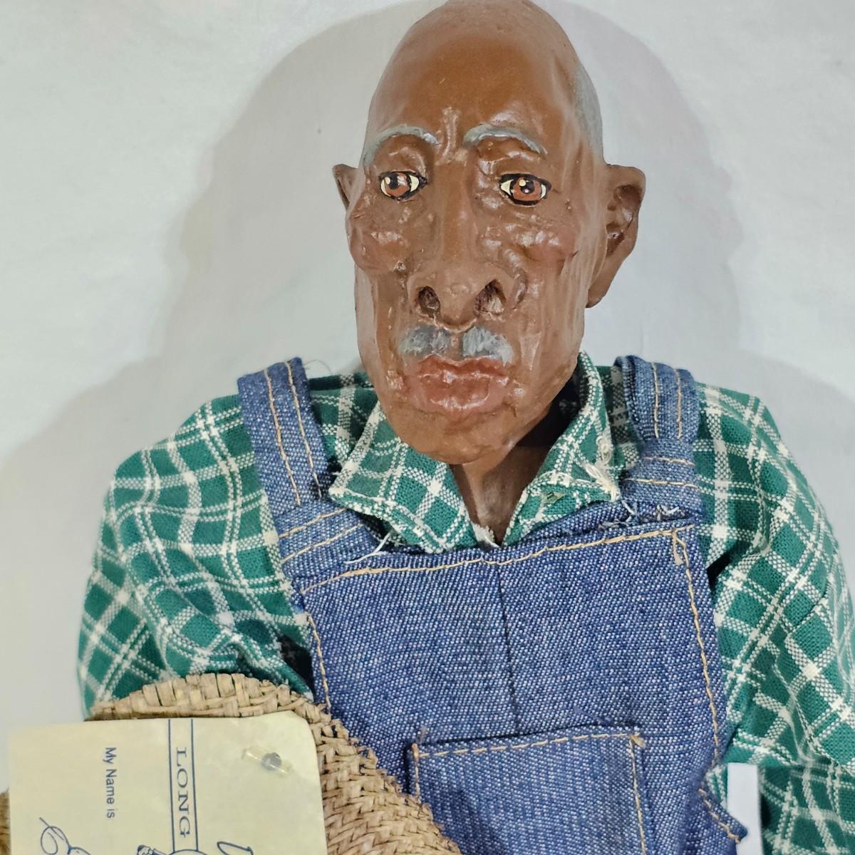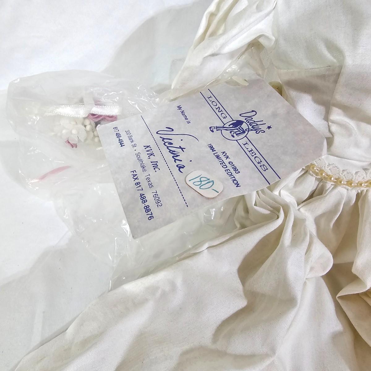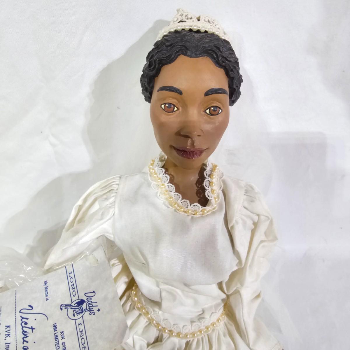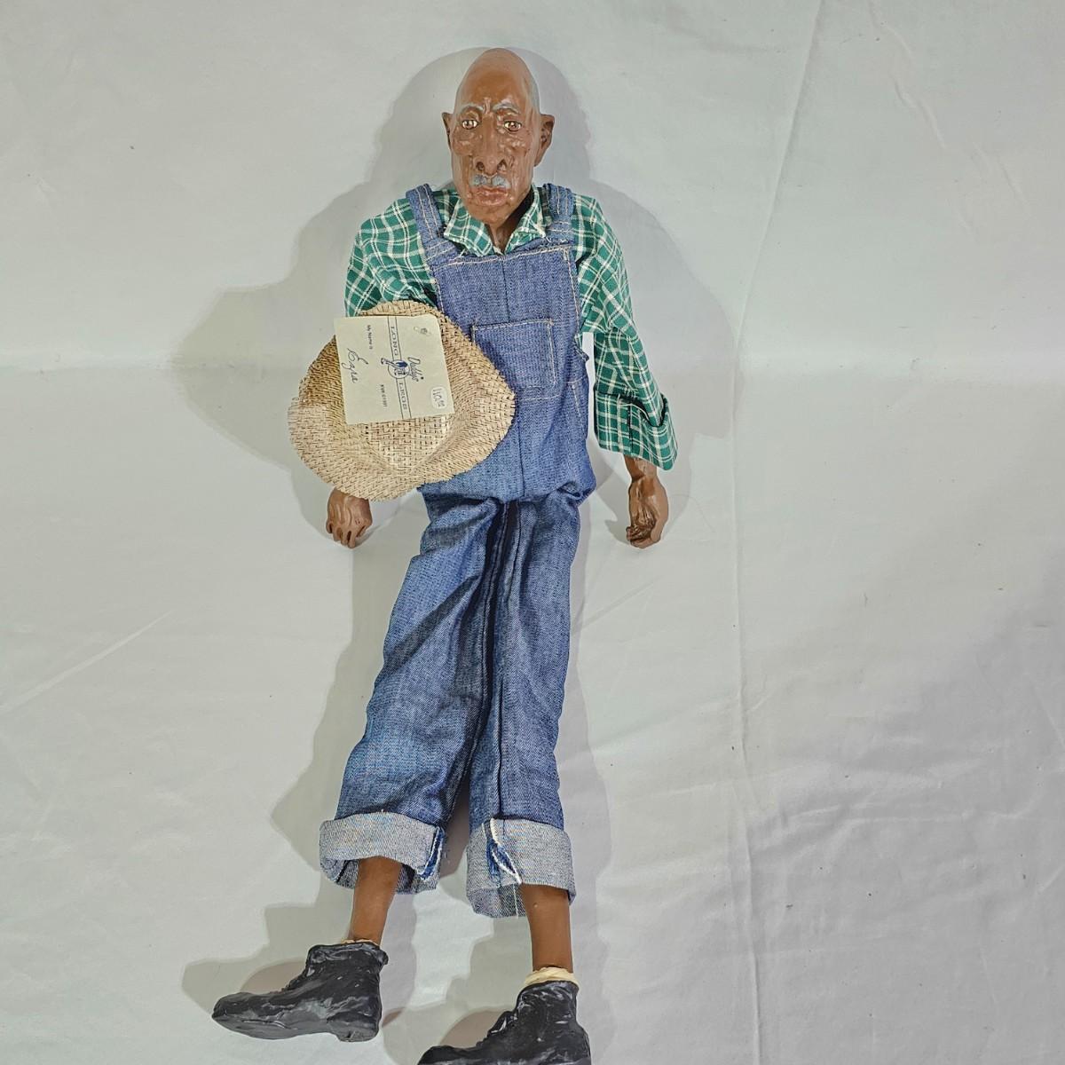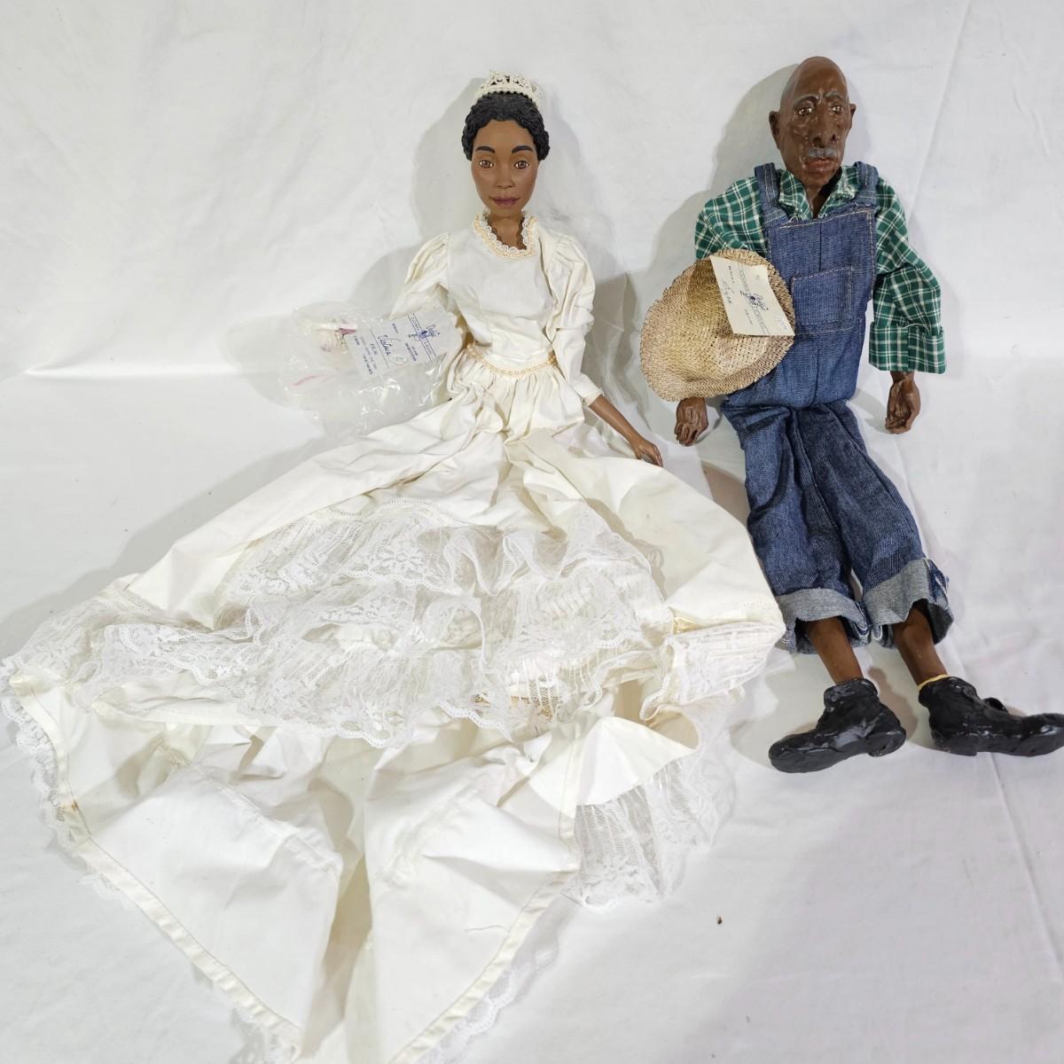 Two collectible dolls by Daddy's Long Legs of Texas. Both in original boxes, we have Victoria the bride at 21" long with full train dress and veil, and also Ezra at 22" in denim and flannel. Dolls have resin heads, arms and legs, great detail and accessories. See photos for details. Shipping available.