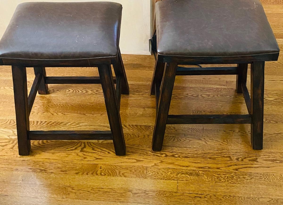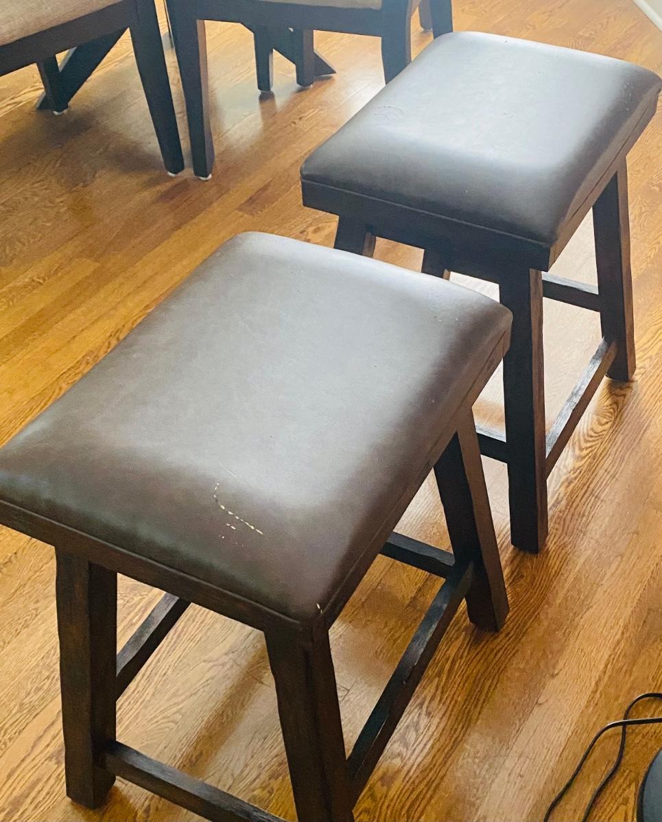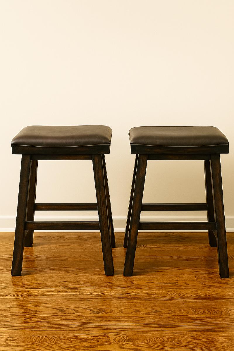 This matching pair of barstools offers both style and comfort with their rich dark wood frames and cushioned faux leather seats. Designed at counter height, they’re perfect for kitchen islands, breakfast bars, or casual dining spaces. The sleek profile and neutral tones make them a versatile fit for any decor style—from rustic to modern.