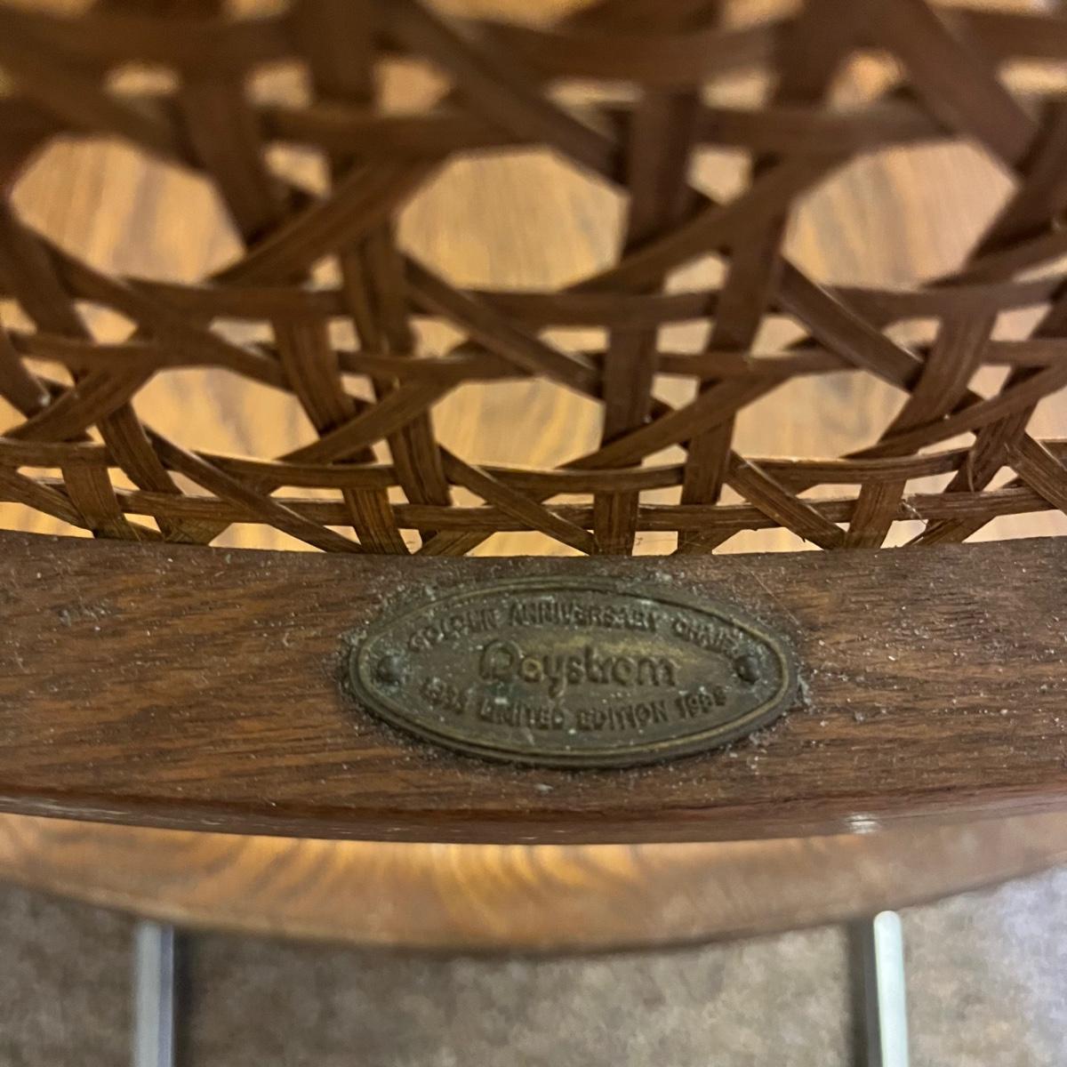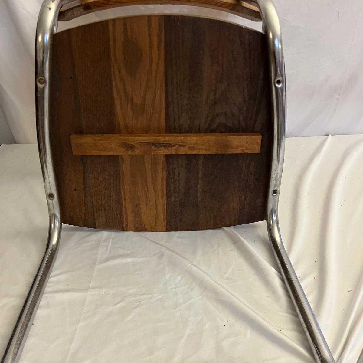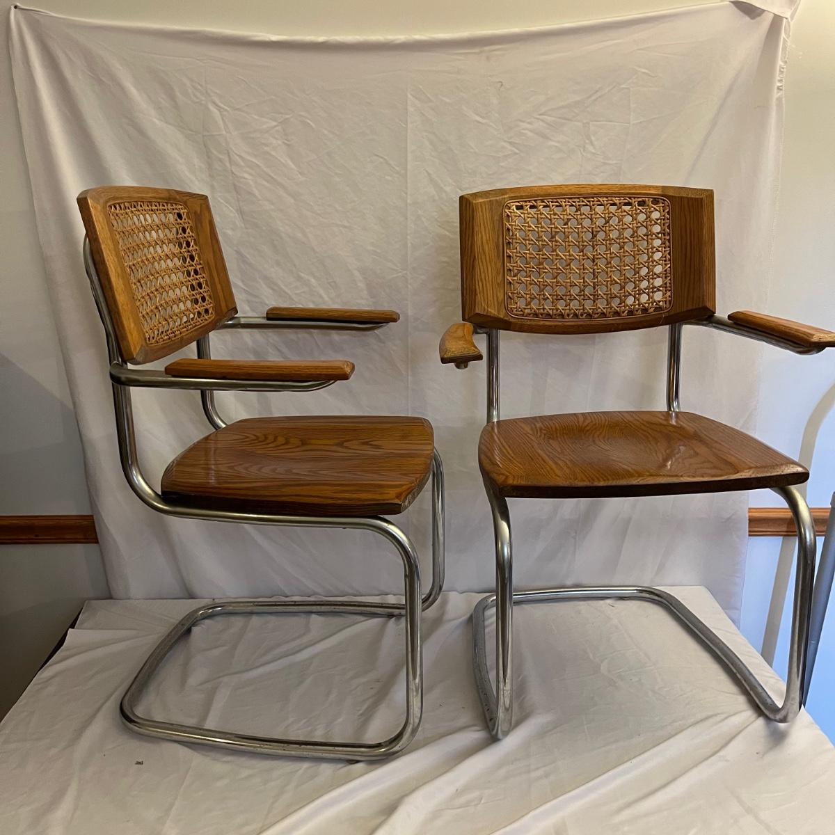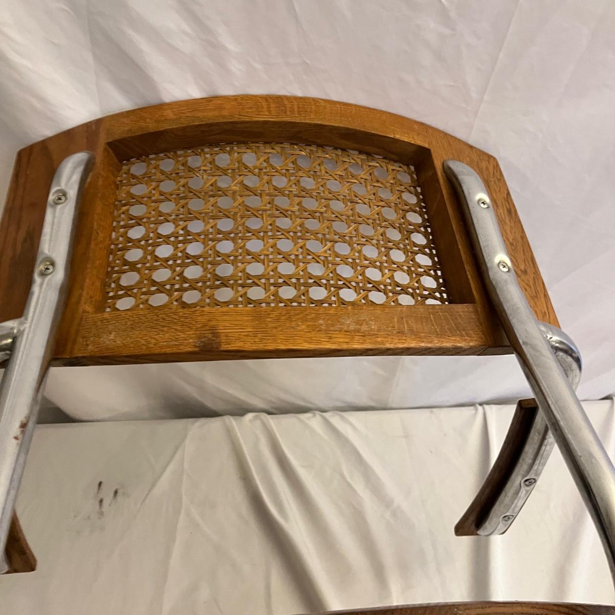 Lot includes two Daystrom golden anniversary chairs with chrome frame, wooden seat and cane back. Chrome has a few rust spots, see pictures. Chairs measure 21” x 23.5” x 34.5” with a 17” seat height.