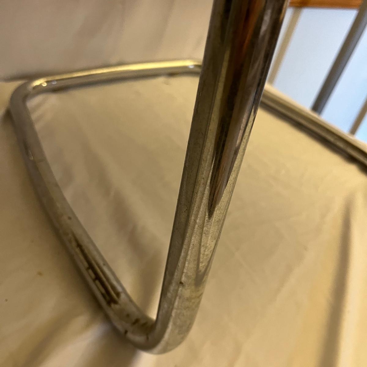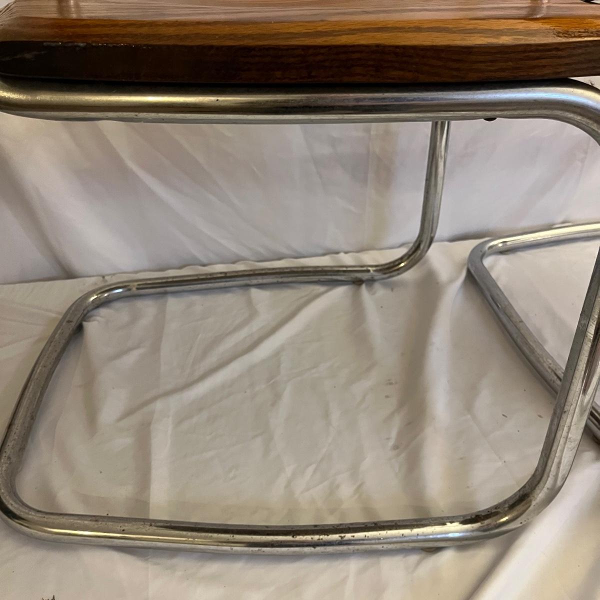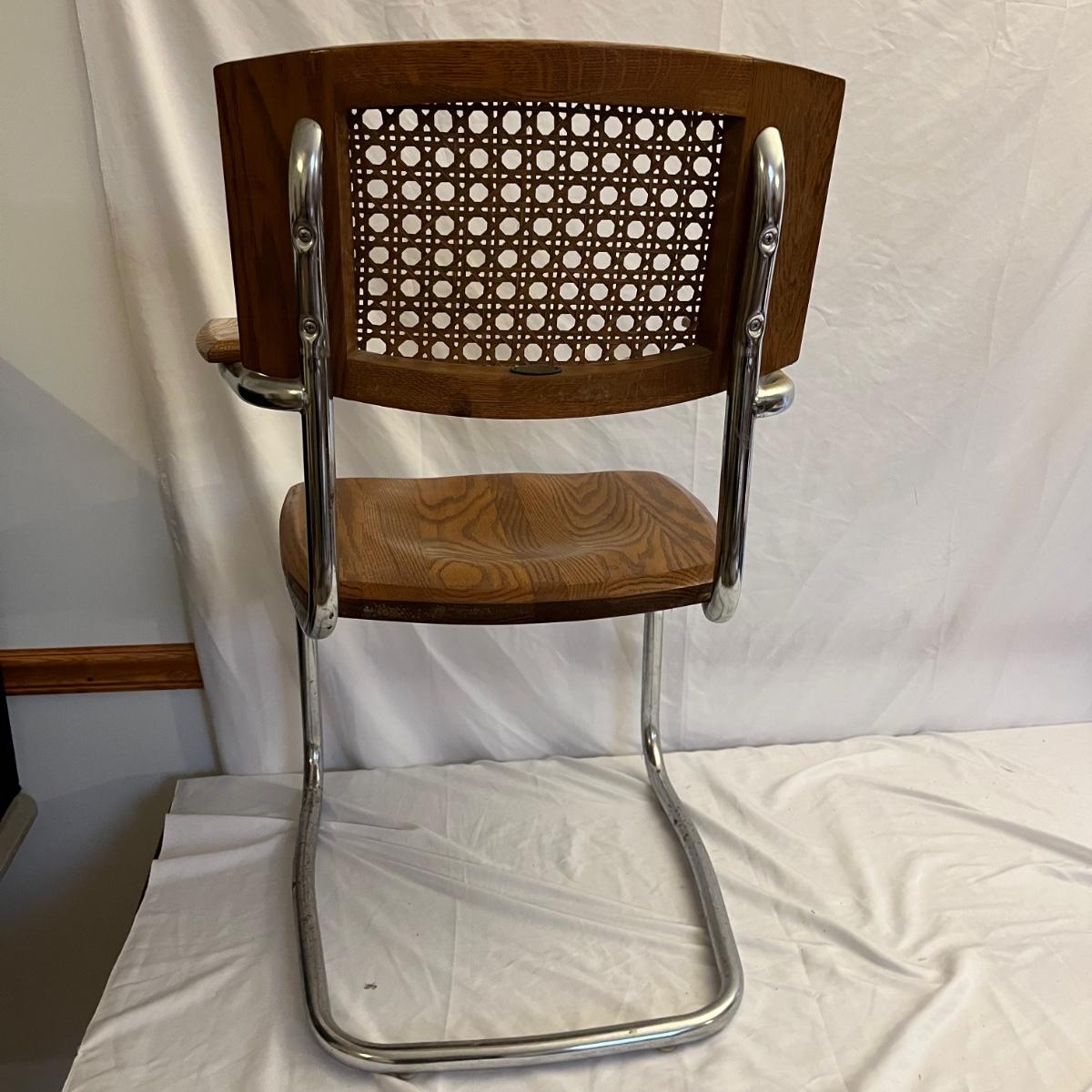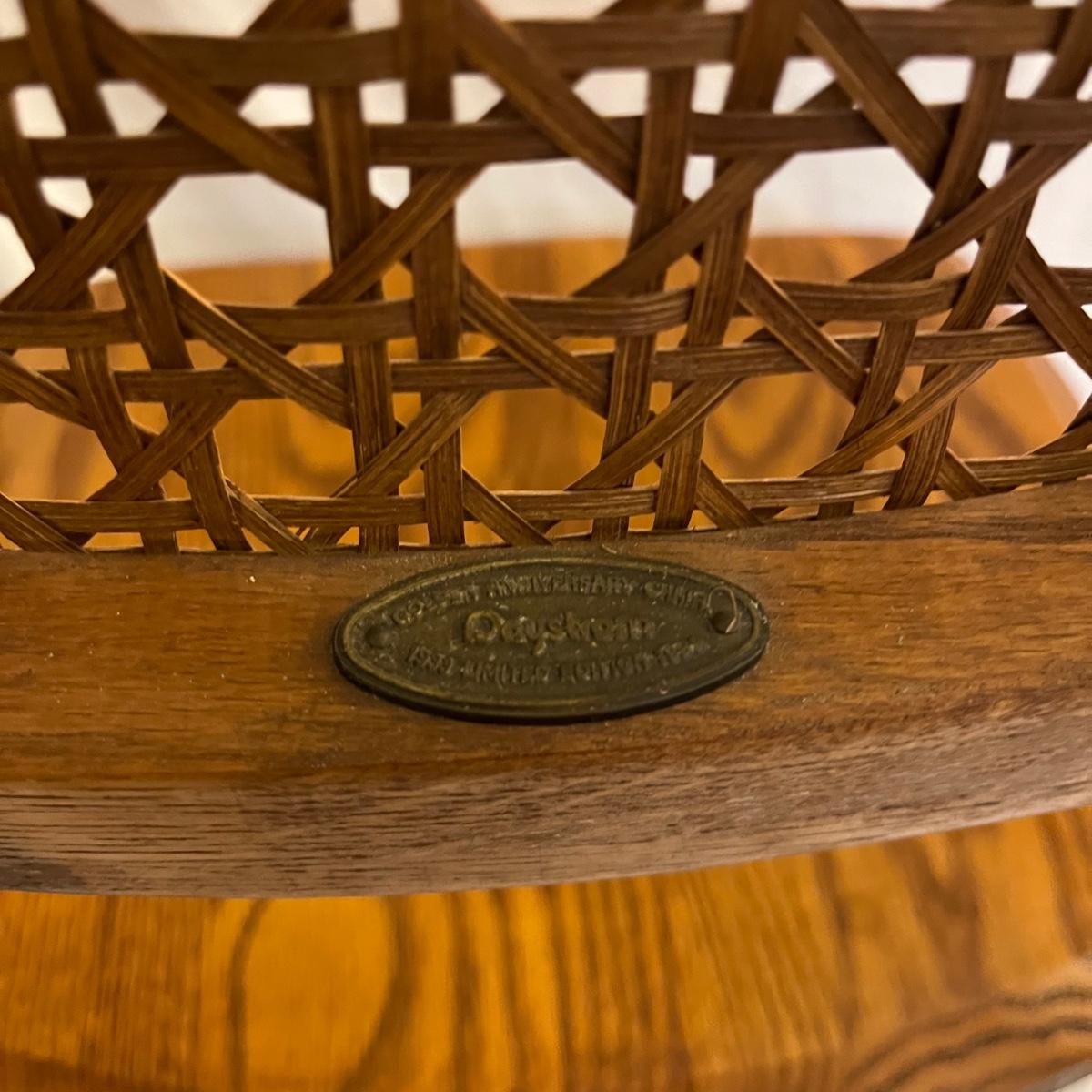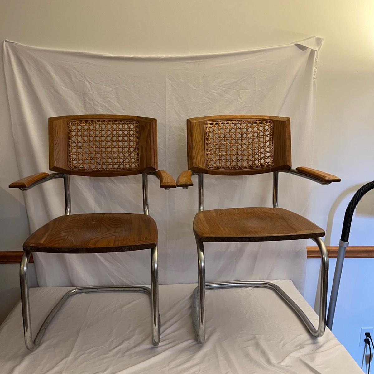 Lot includes two Daystrom golden anniversary chairs with chrome frame, wooden seat and cane back. Chrome has a few rust spots, see pictures. Chairs measure 21” x 23.5” x 34.5” with a 17” seat height.