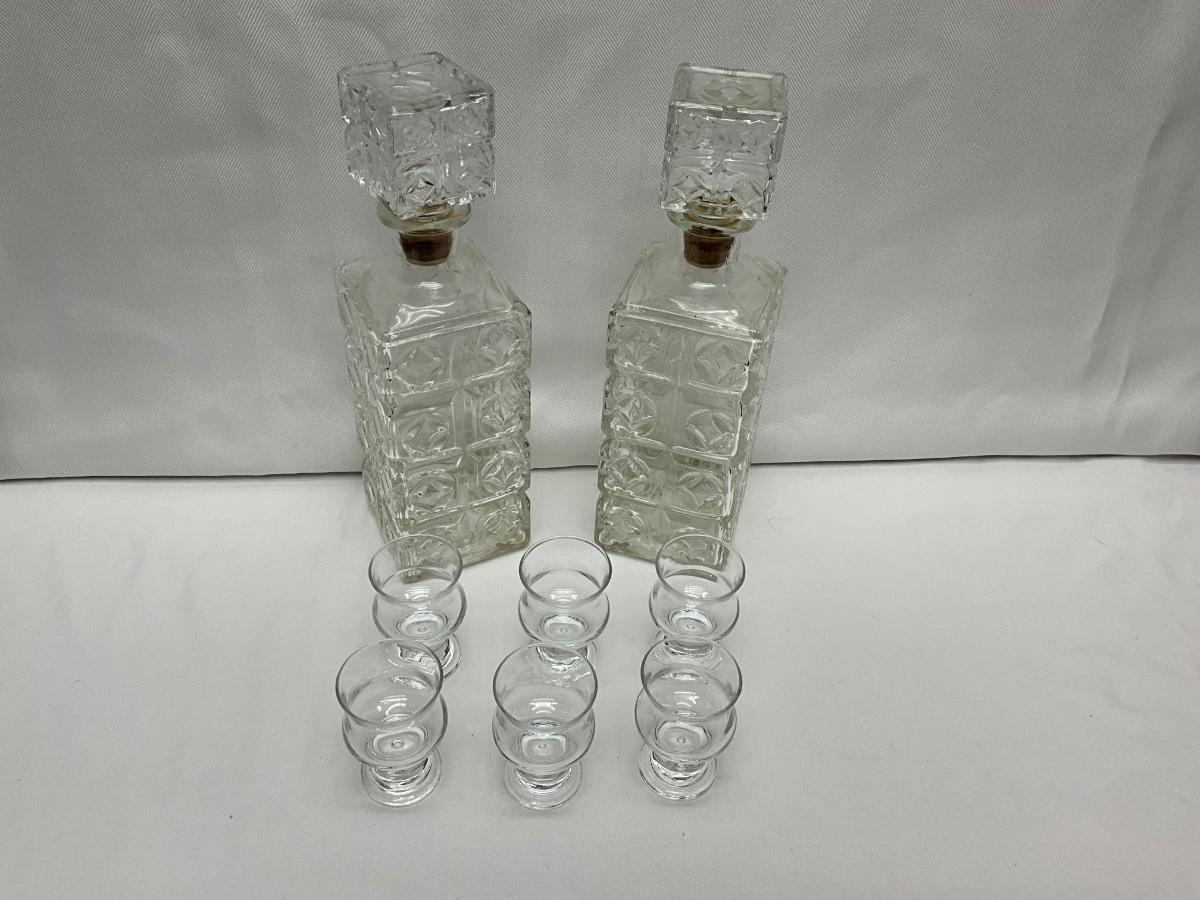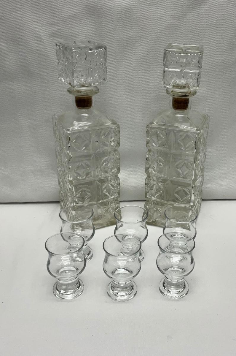 Vintage cut glass Pair of Decanters 1960's with 6 footed liqueur glasses