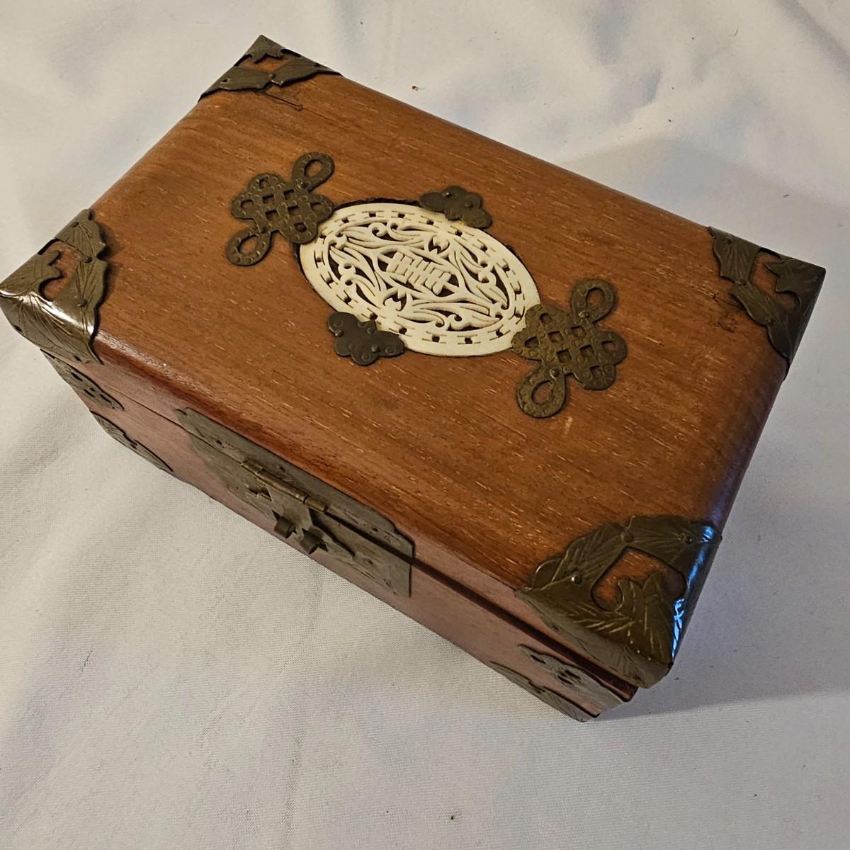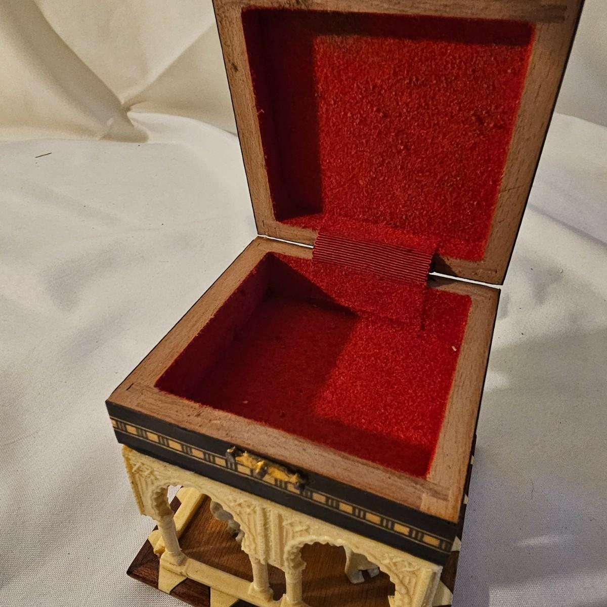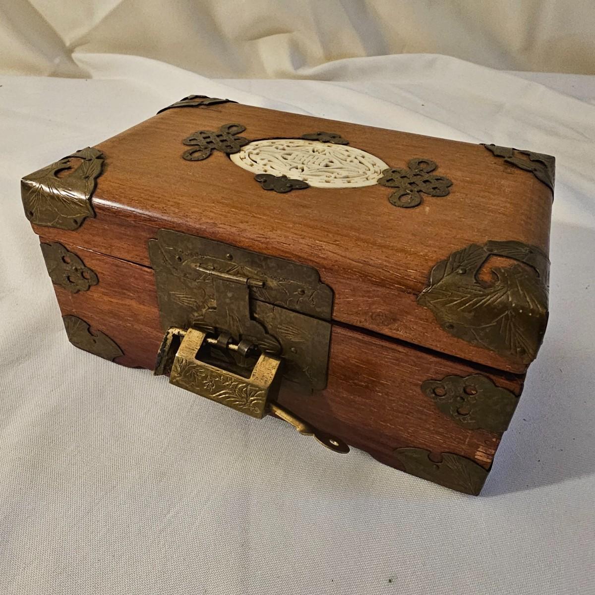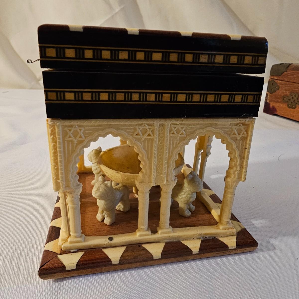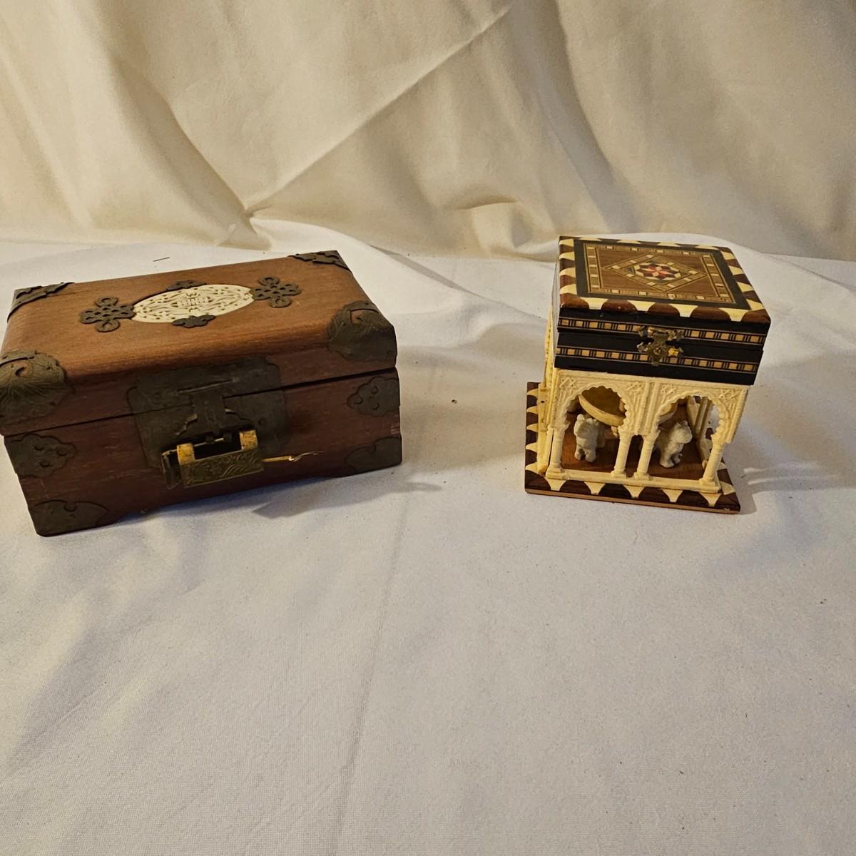 Two highly detailed and decorated boxes. Small item has storage in top, intricate carved columns and figures shown below. Measures 4" x 4" x 4" H. Other piece has carved and inlaid piece in top, brass hardware and corner pieces and a Chinese puzzle lock for the hasp. 7" x 4.5"x 3"H. Larger box appears to be for jewelry, has fashioned holders inside for rings and other items. See photos for details. Shipping available.