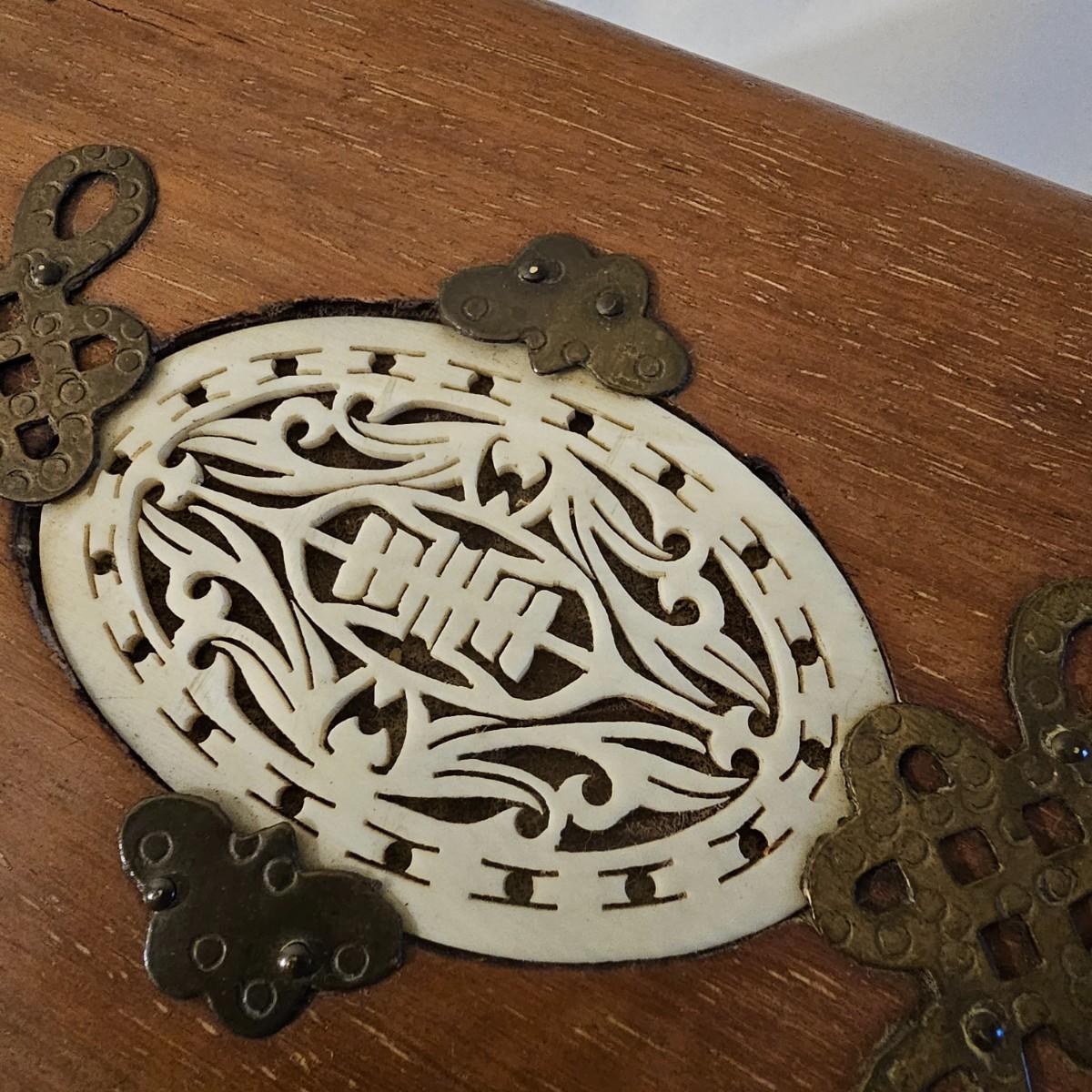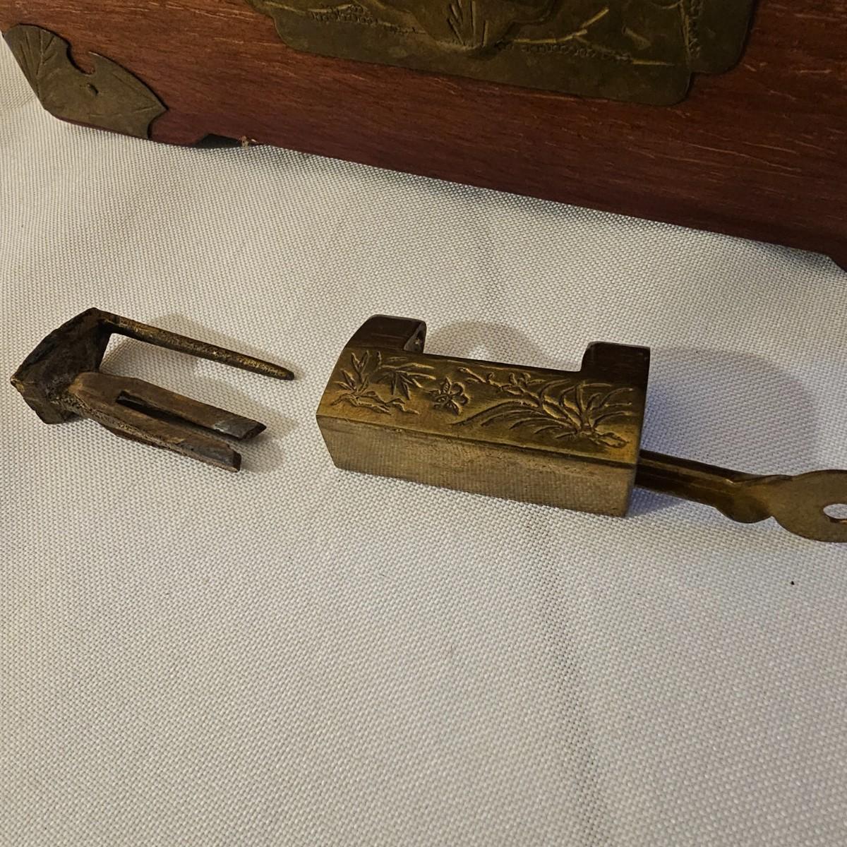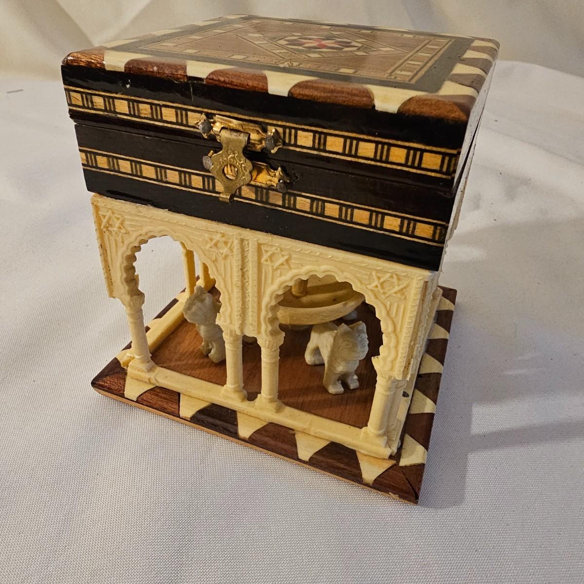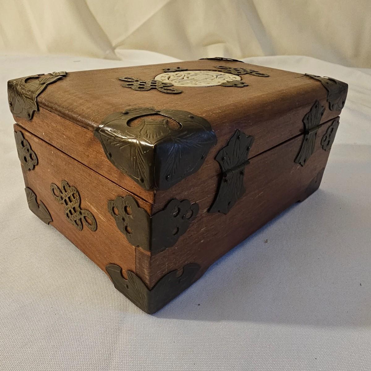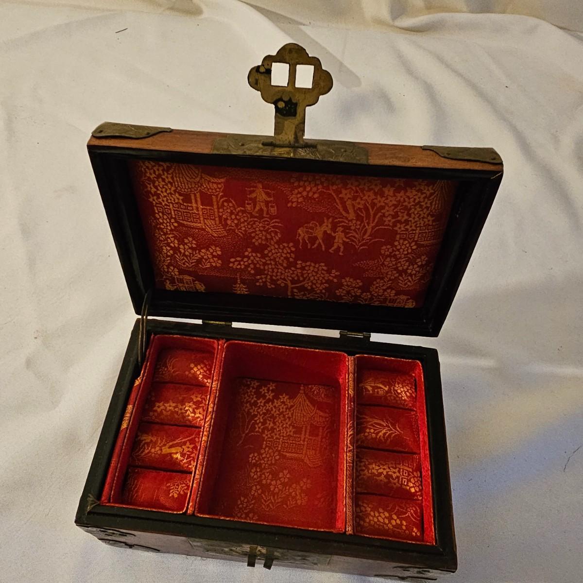 Two highly detailed and decorated boxes. Small item has storage in top, intricate carved columns and figures shown below. Measures 4" x 4" x 4" H. Other piece has carved and inlaid piece in top, brass hardware and corner pieces and a Chinese puzzle lock for the hasp. 7" x 4.5"x 3"H. Larger box appears to be for jewelry, has fashioned holders inside for rings and other items. See photos for details. Shipping available.
