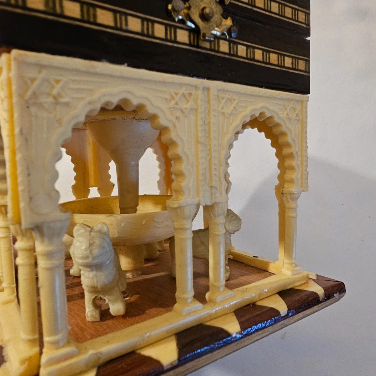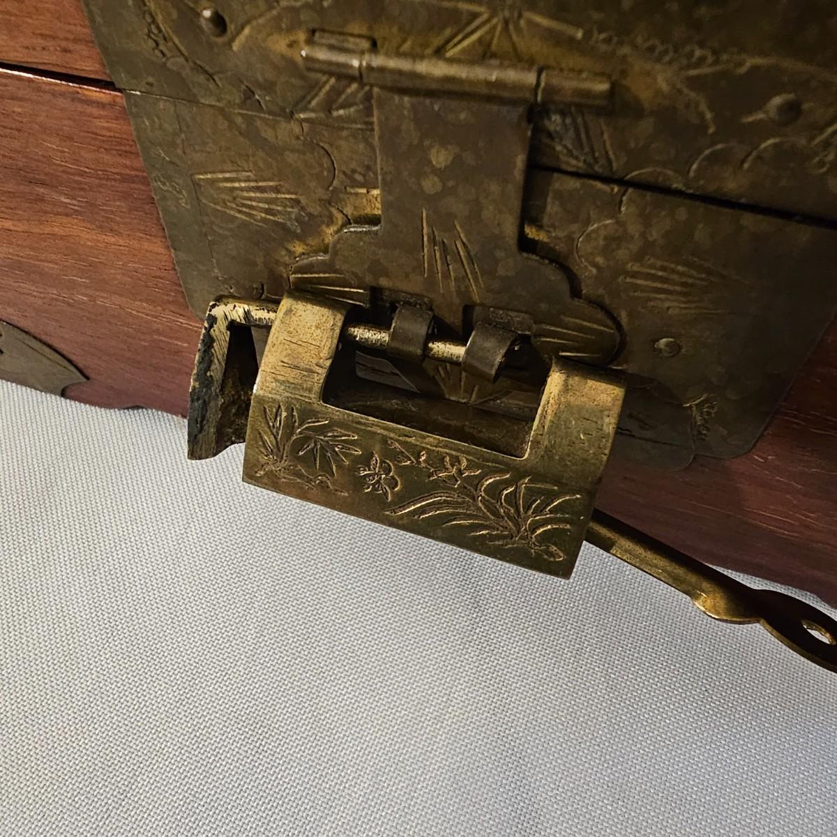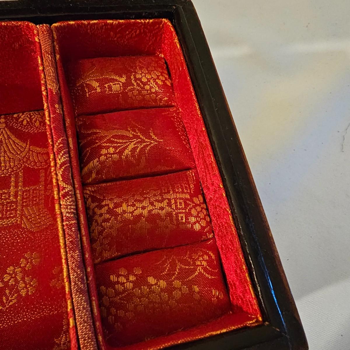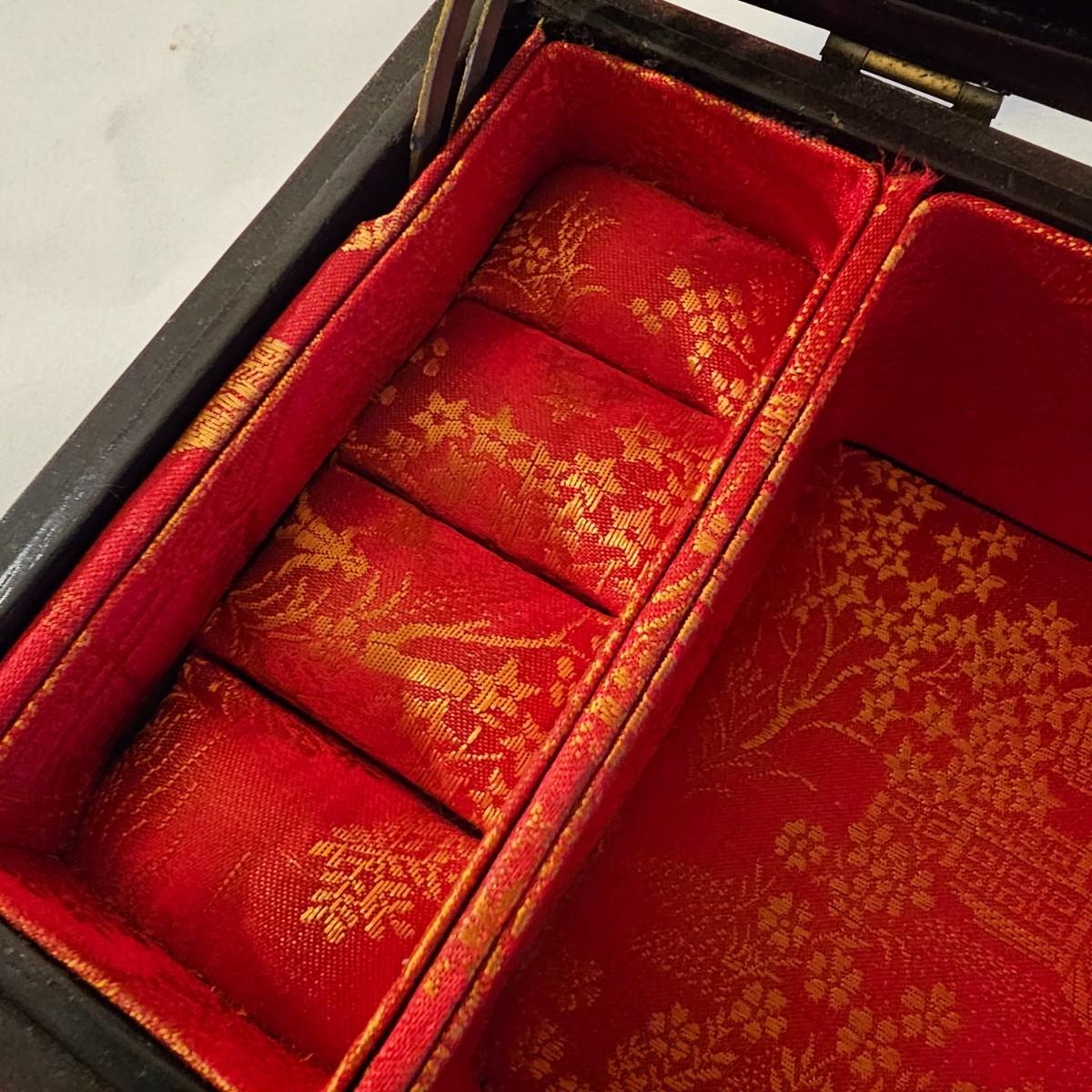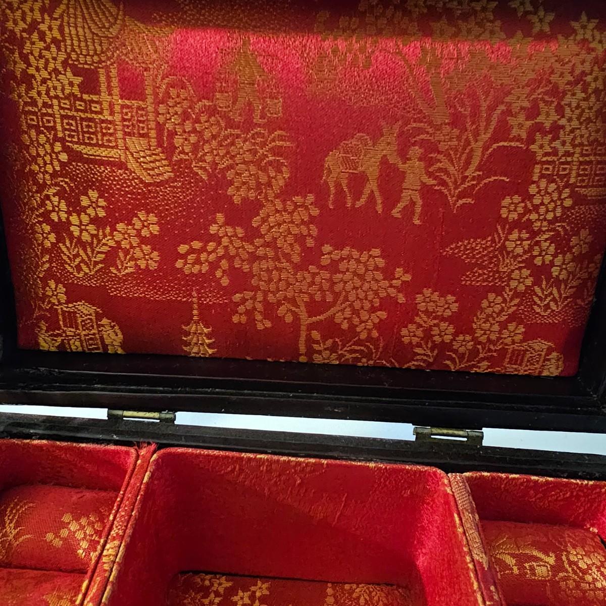Two highly detailed and decorated boxes. Small item has storage in top, intricate carved columns and figures shown below. Measures 4" x 4" x 4" H. Other piece has carved and inlaid piece in top, brass hardware and corner pieces and a Chinese puzzle lock for the hasp. 7" x 4.5"x 3"H. Larger box appears to be for jewelry, has fashioned holders inside for rings and other items. See photos for details. Shipping available.