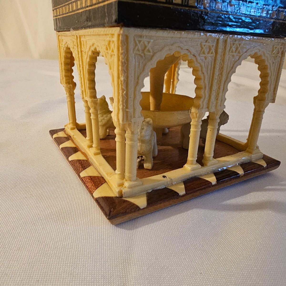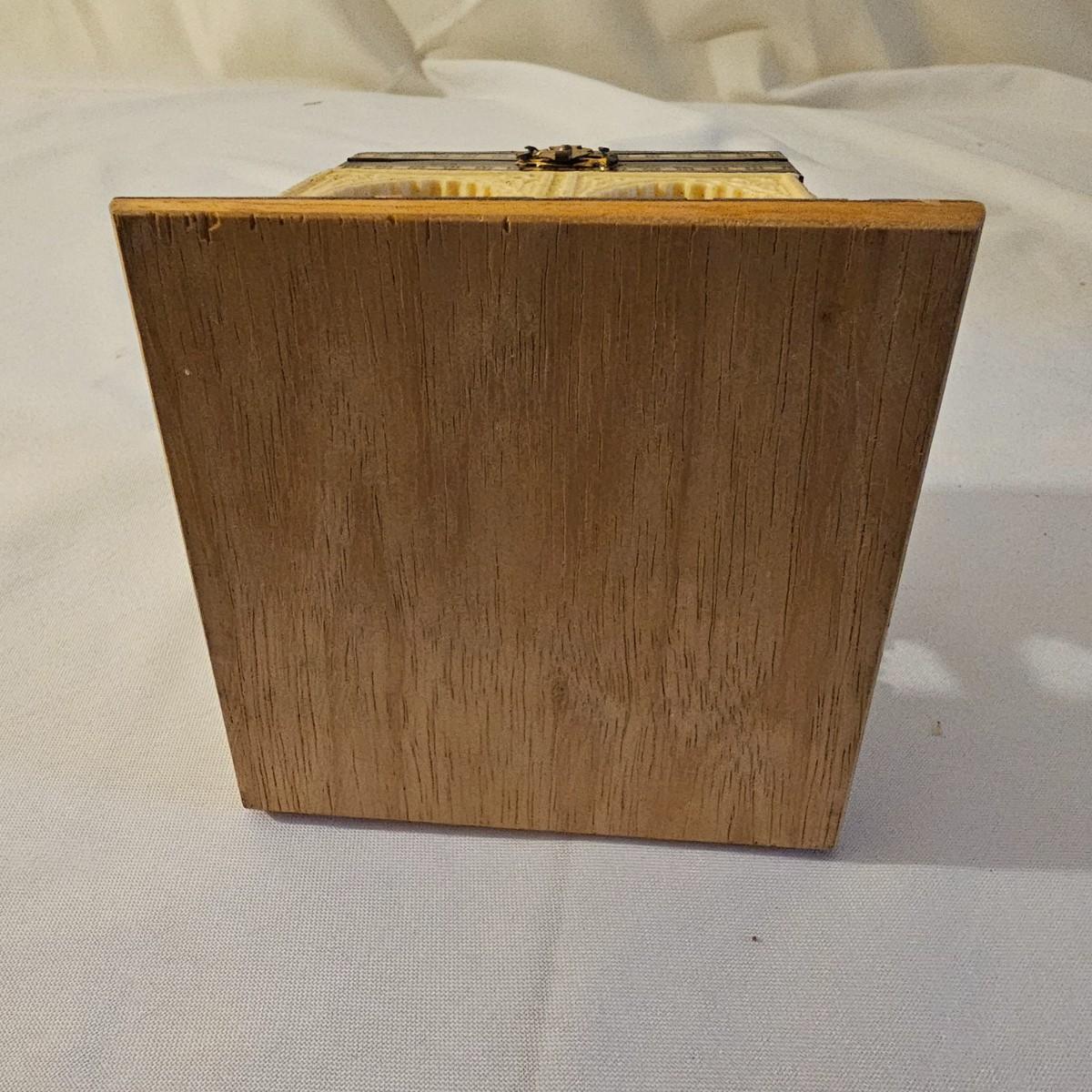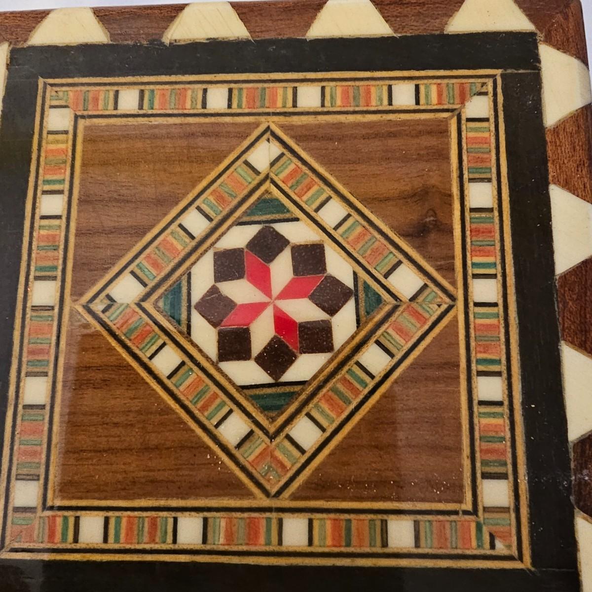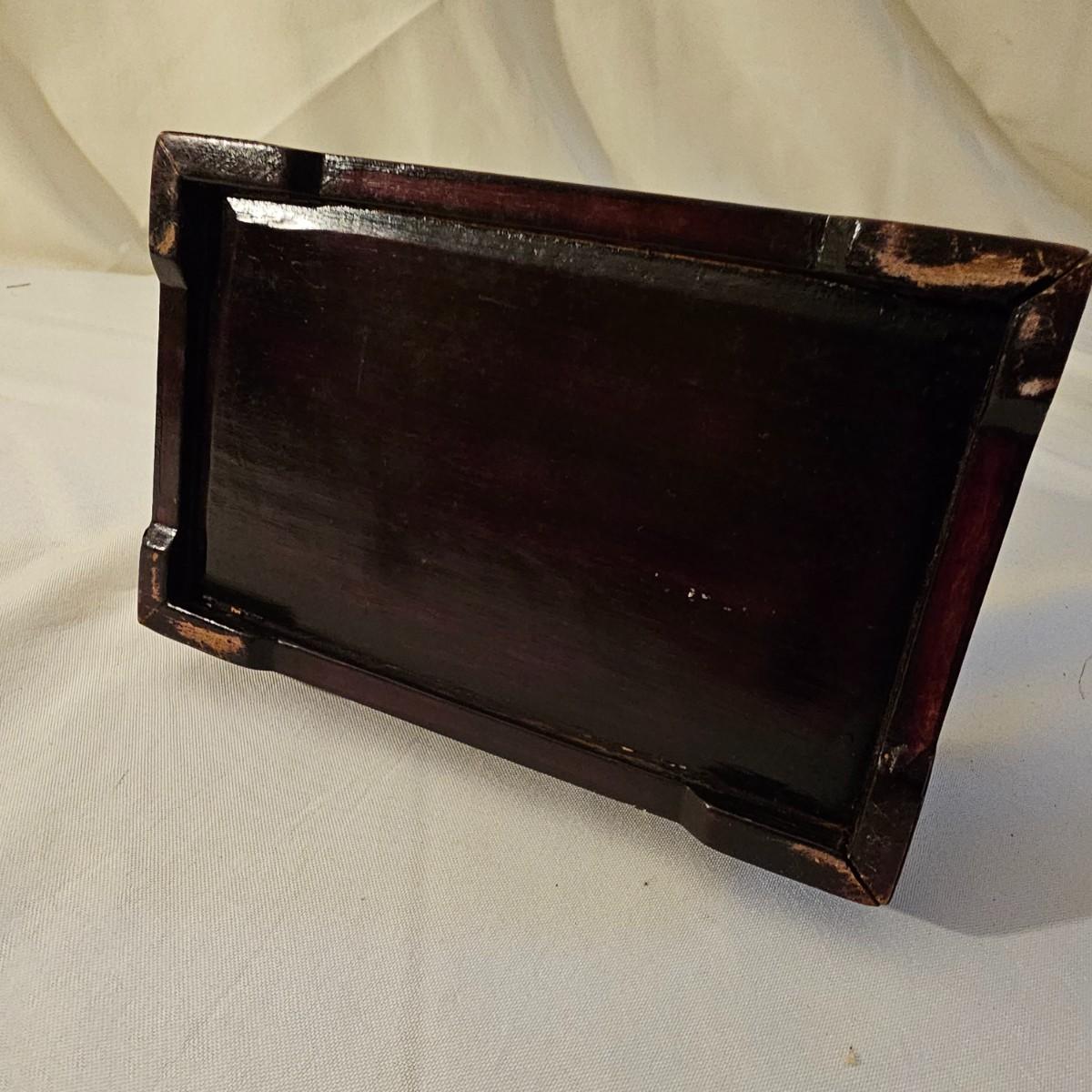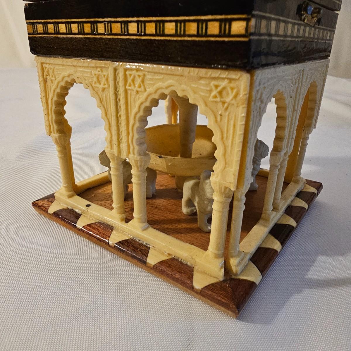 Two highly detailed and decorated boxes. Small item has storage in top, intricate carved columns and figures shown below. Measures 4" x 4" x 4" H. Other piece has carved and inlaid piece in top, brass hardware and corner pieces and a Chinese puzzle lock for the hasp. 7" x 4.5"x 3"H. Larger box appears to be for jewelry, has fashioned holders inside for rings and other items. See photos for details. Shipping available.