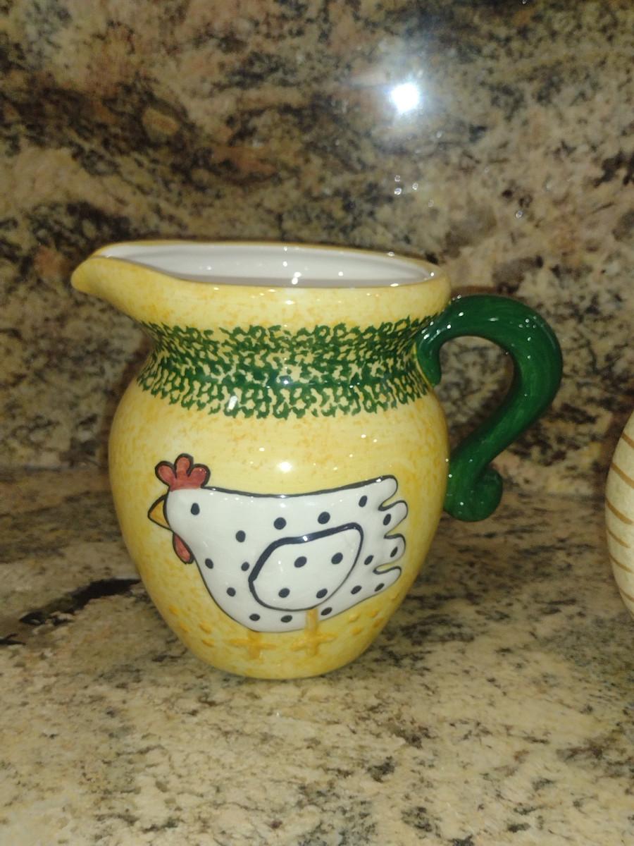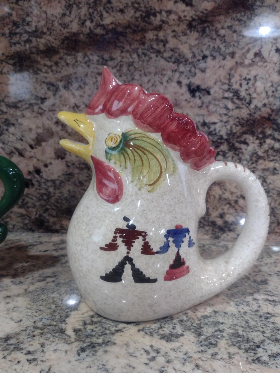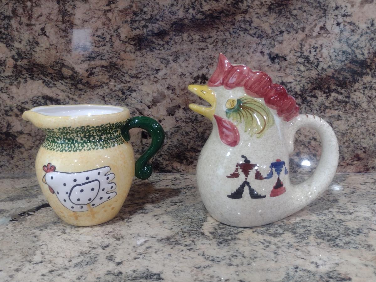 Pair of Decorative Chicken Design Ceramic Pitchers. Please see all pictures for condition- item is chipped on rim.