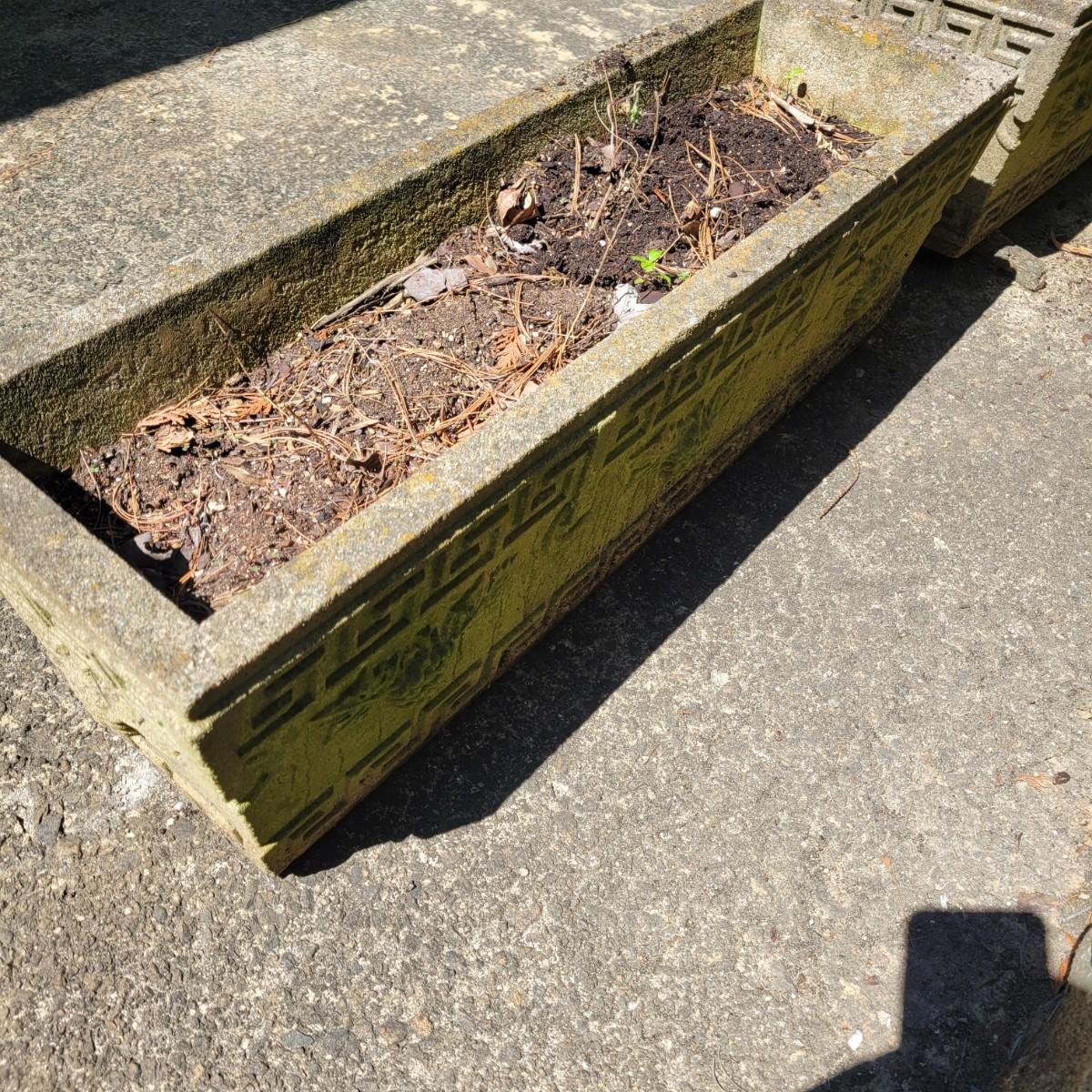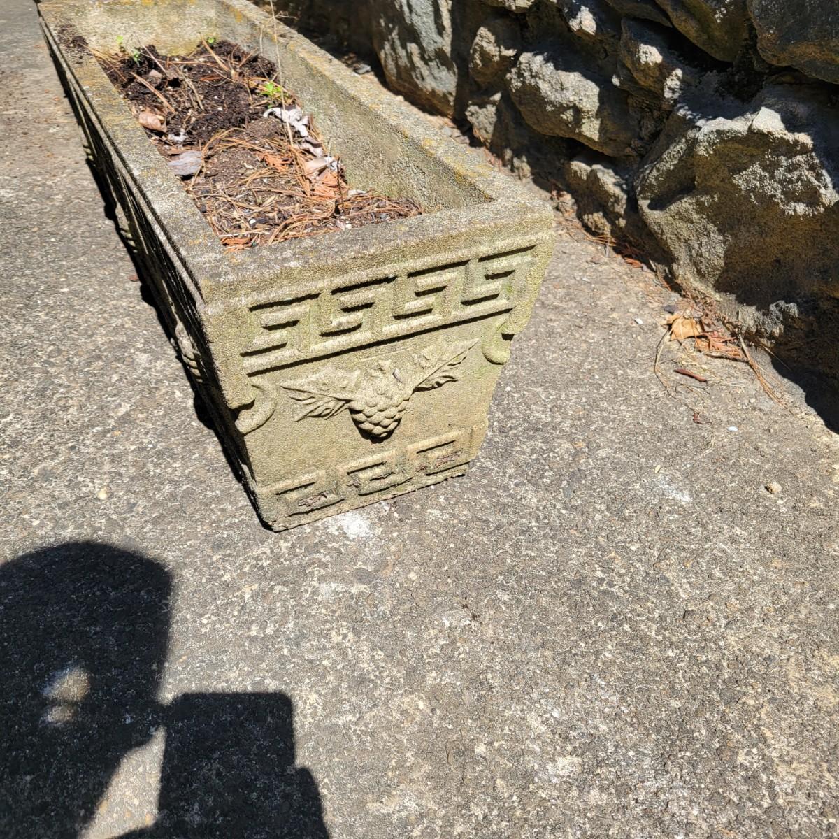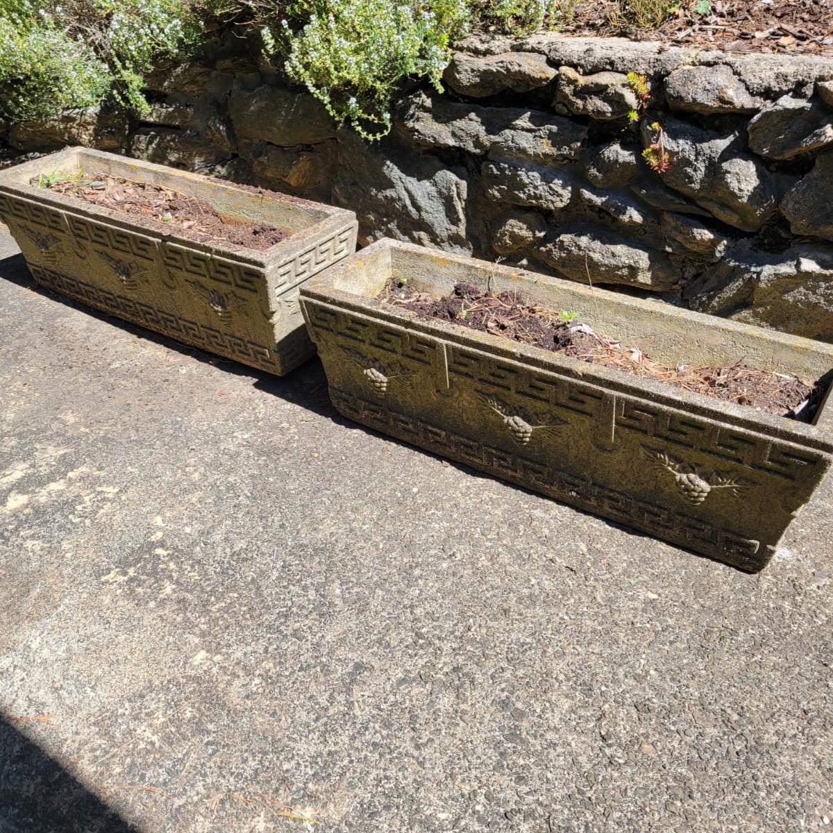 A pair of decorative concrete planters that have a grape design on the and appear to be free of cracks or damage. Each planter measures approximately 31" x 9.5" x 10"H. Local pickup only. Winning bidder must bring assistance to help move and load this item due to its weight and/or size and the soil must go with the planters.
