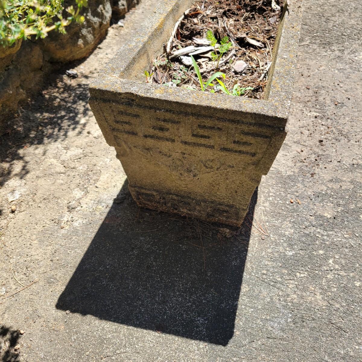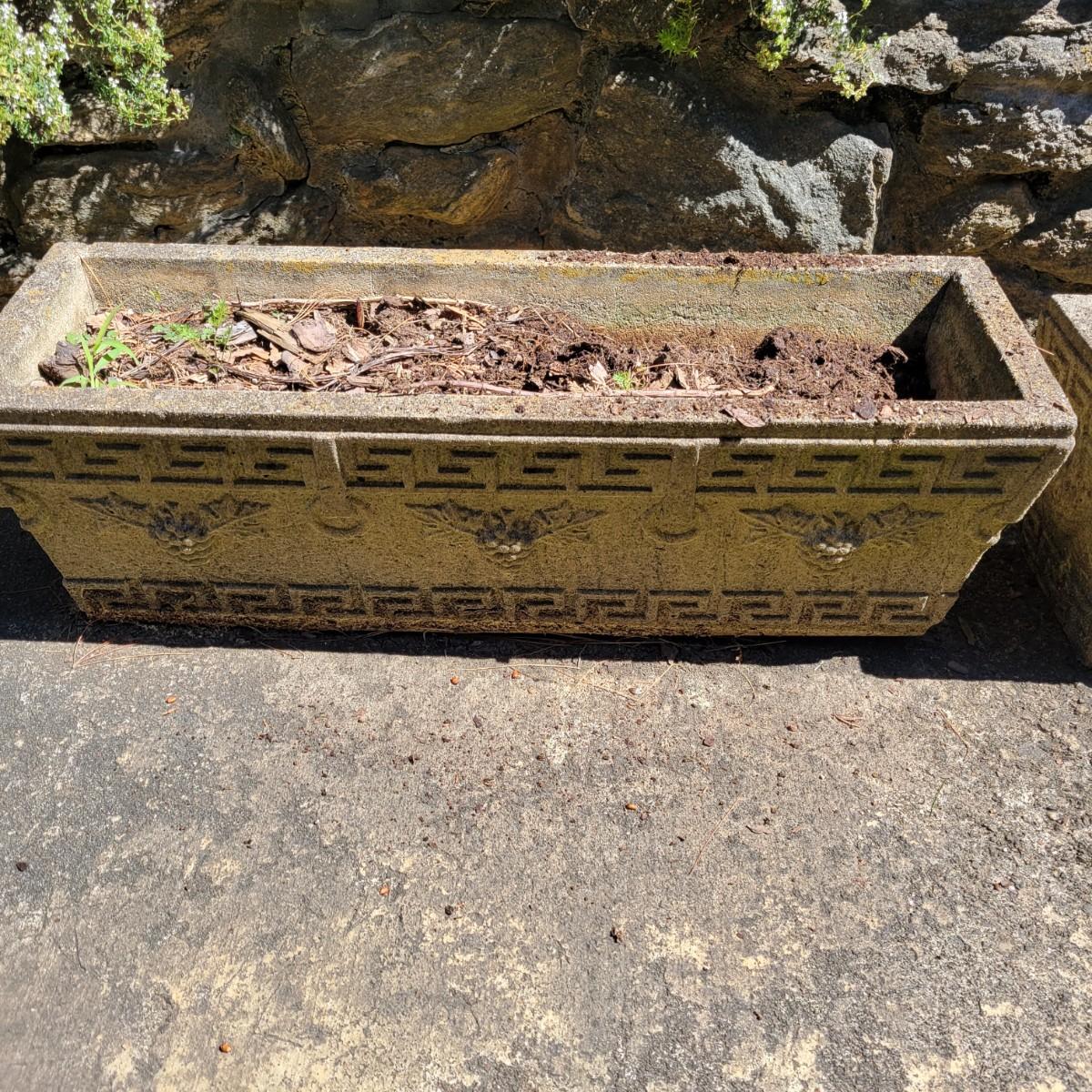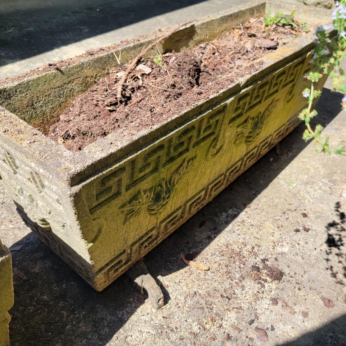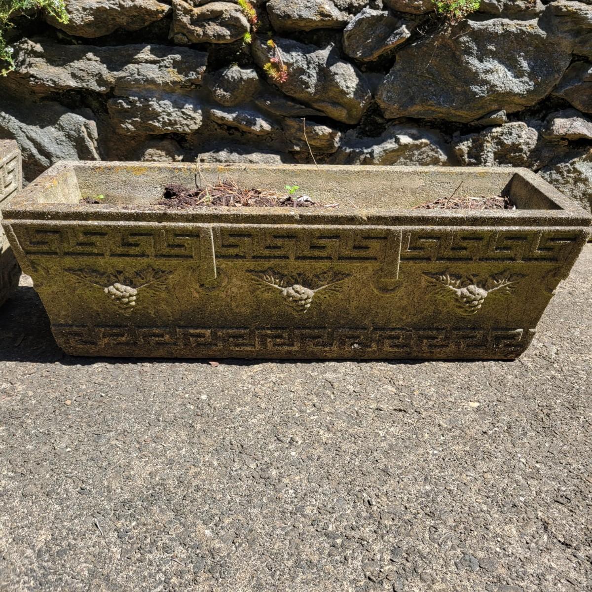 A pair of decorative concrete planters that have a grape design on the and appear to be free of cracks or damage. Each planter measures approximately 31" x 9.5" x 10"H. Local pickup only. Winning bidder must bring assistance to help move and load this item due to its weight and/or size and the soil must go with the planters.