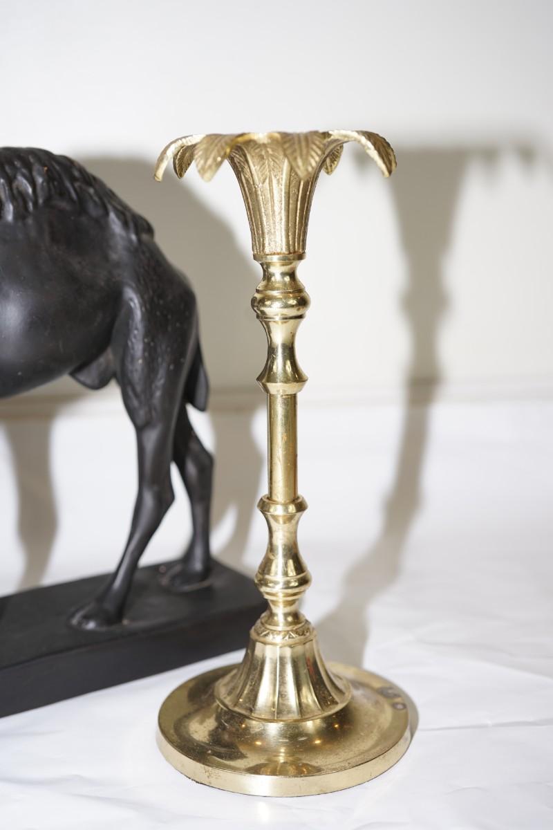 pair of brass candleholders. not old but interesting design with an Egyptian style candle bobeche
