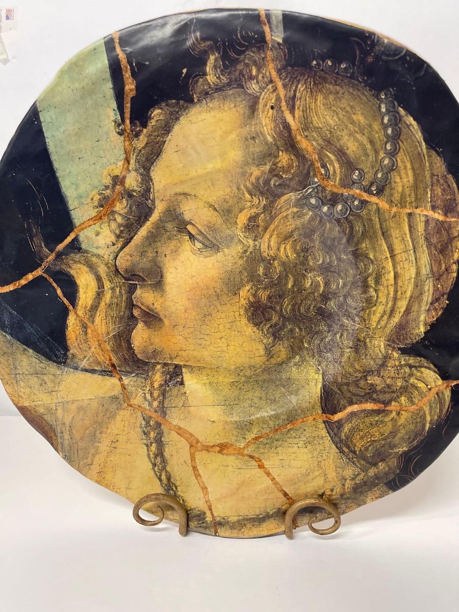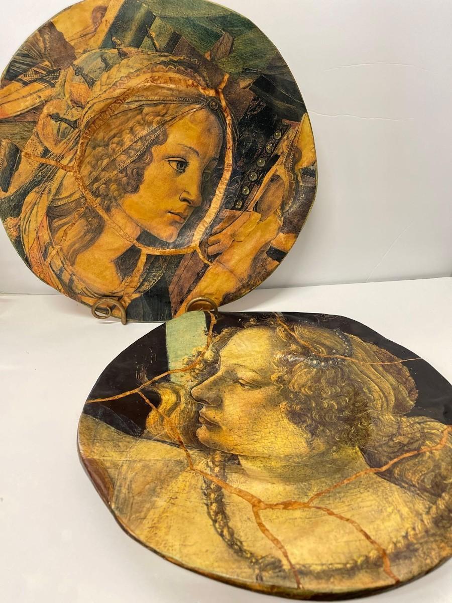 Pair of Decorative Prints on Wood Plates. Each is 15 3/4”. Very good condition.