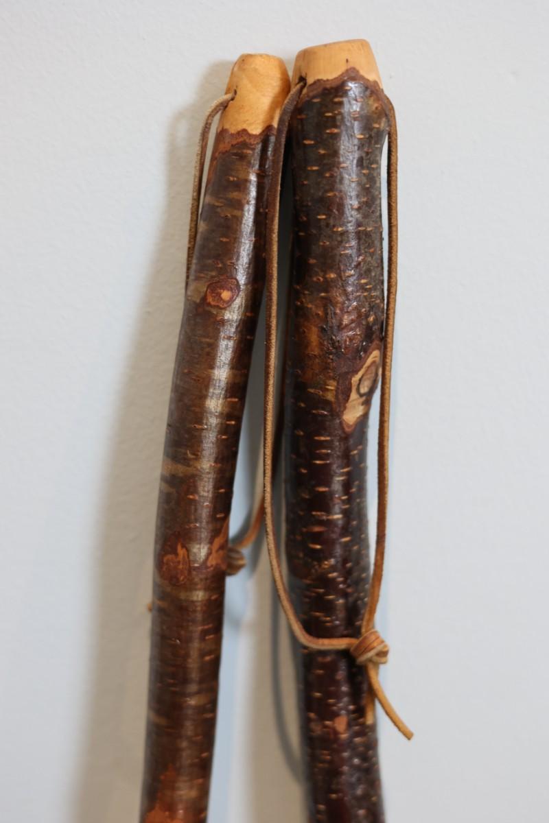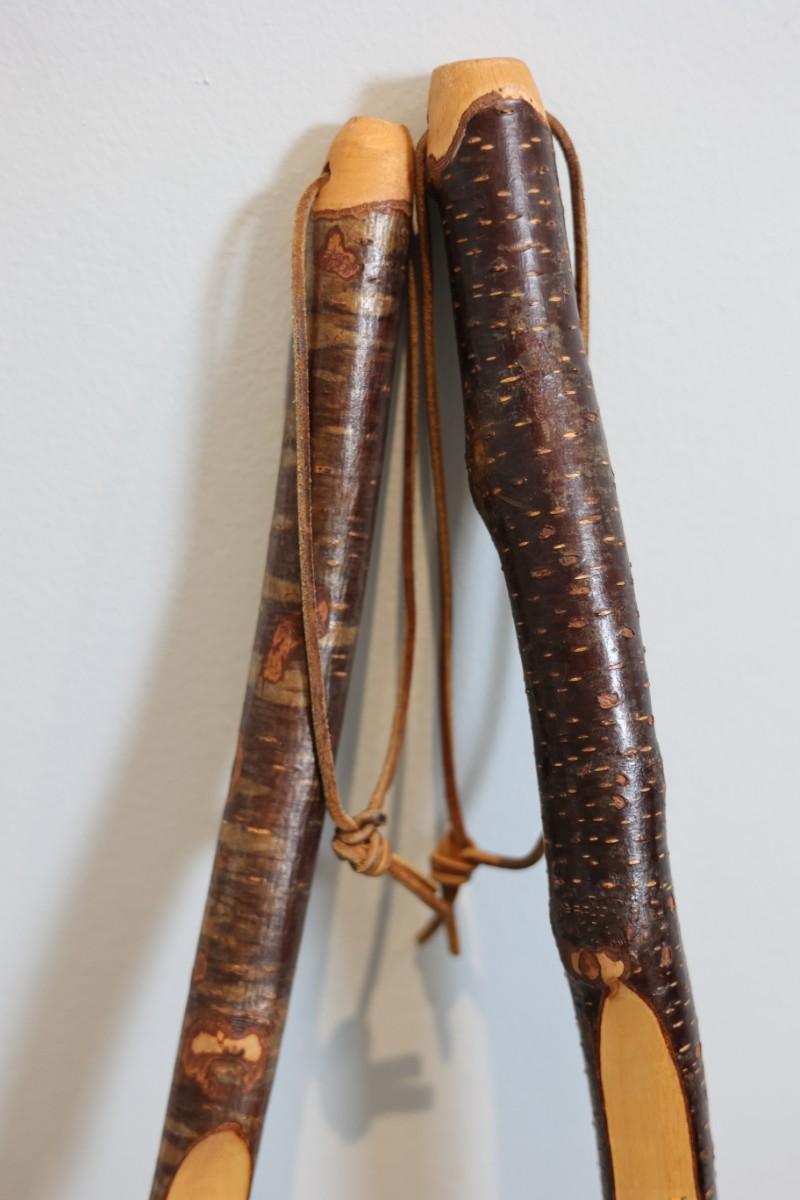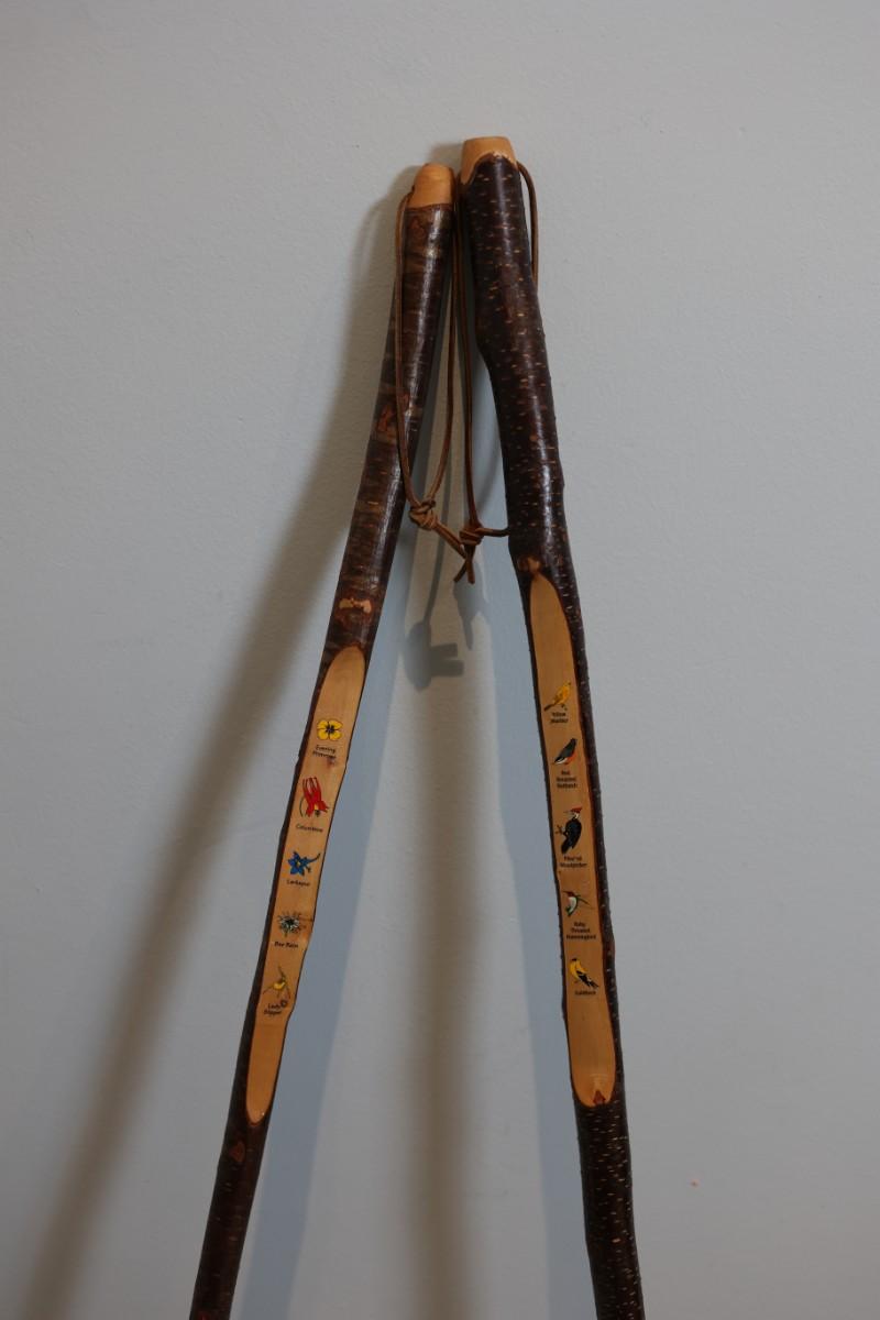 Pair of decorative wooden walking sticks featuring painted bird inlay panels and leather wrist strap.